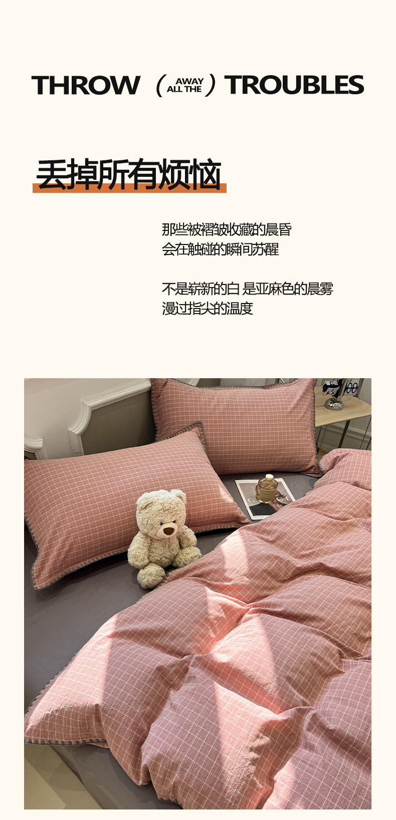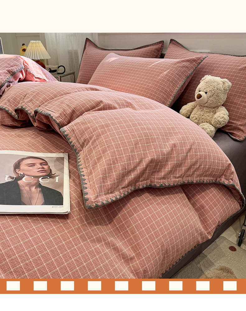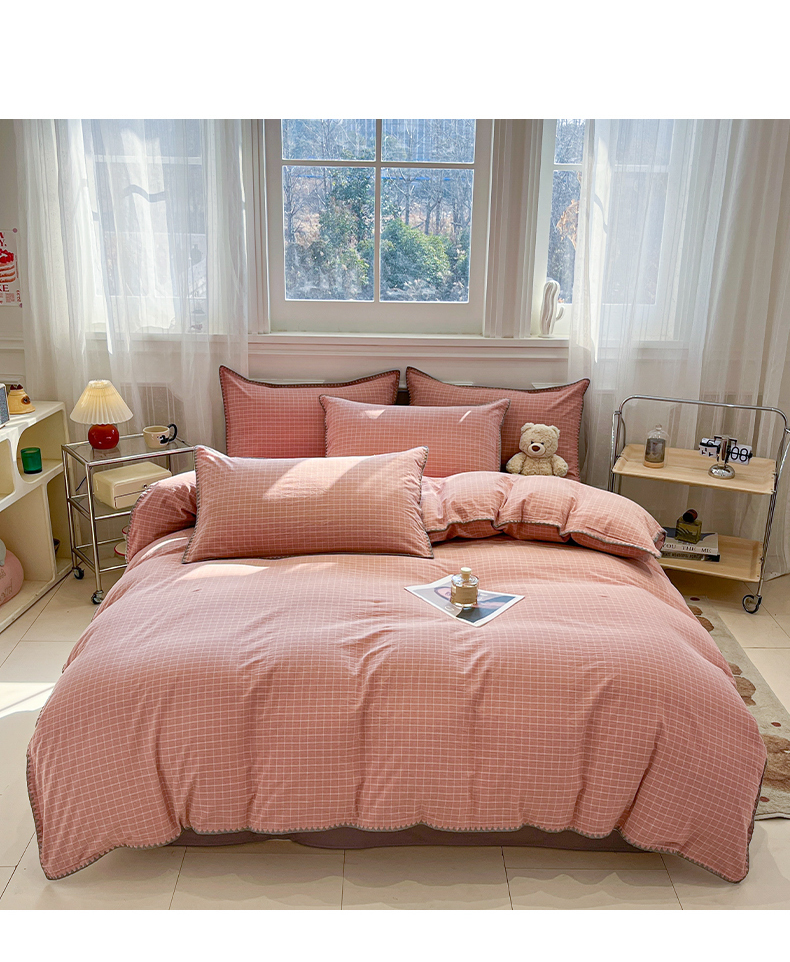 莱茵家居 2026新款A类全棉色织水洗棉格子贝壳边套件-愫格系列 愫格-灰粉