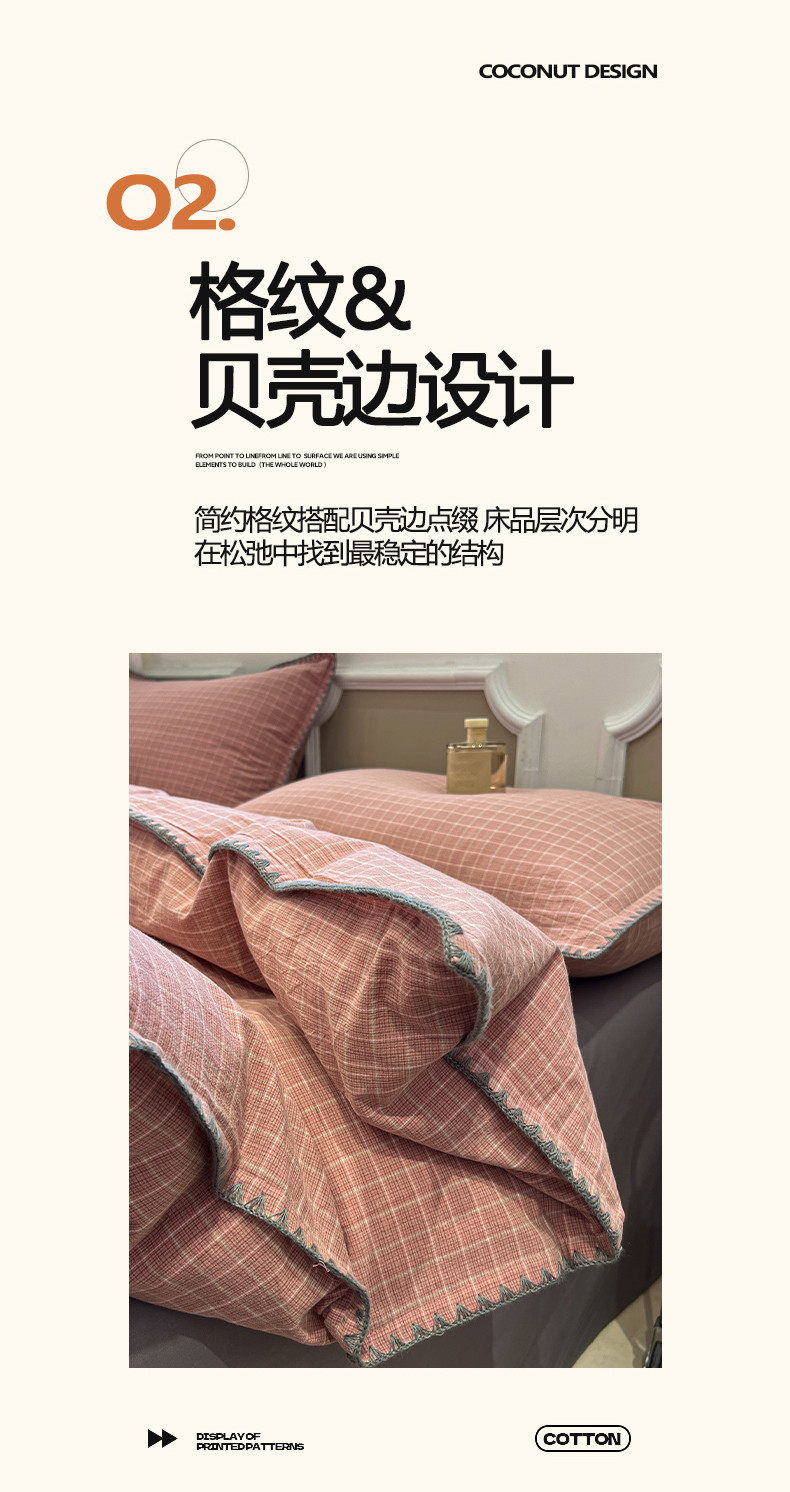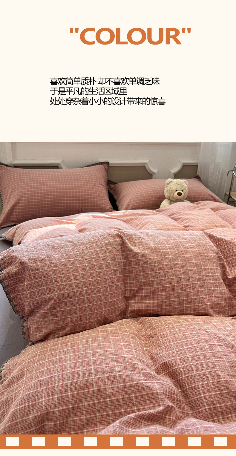 商品名称:莱茵家居 2026新款A类全棉色织水洗棉格子贝壳边套件-愫格系列 愫格-灰粉