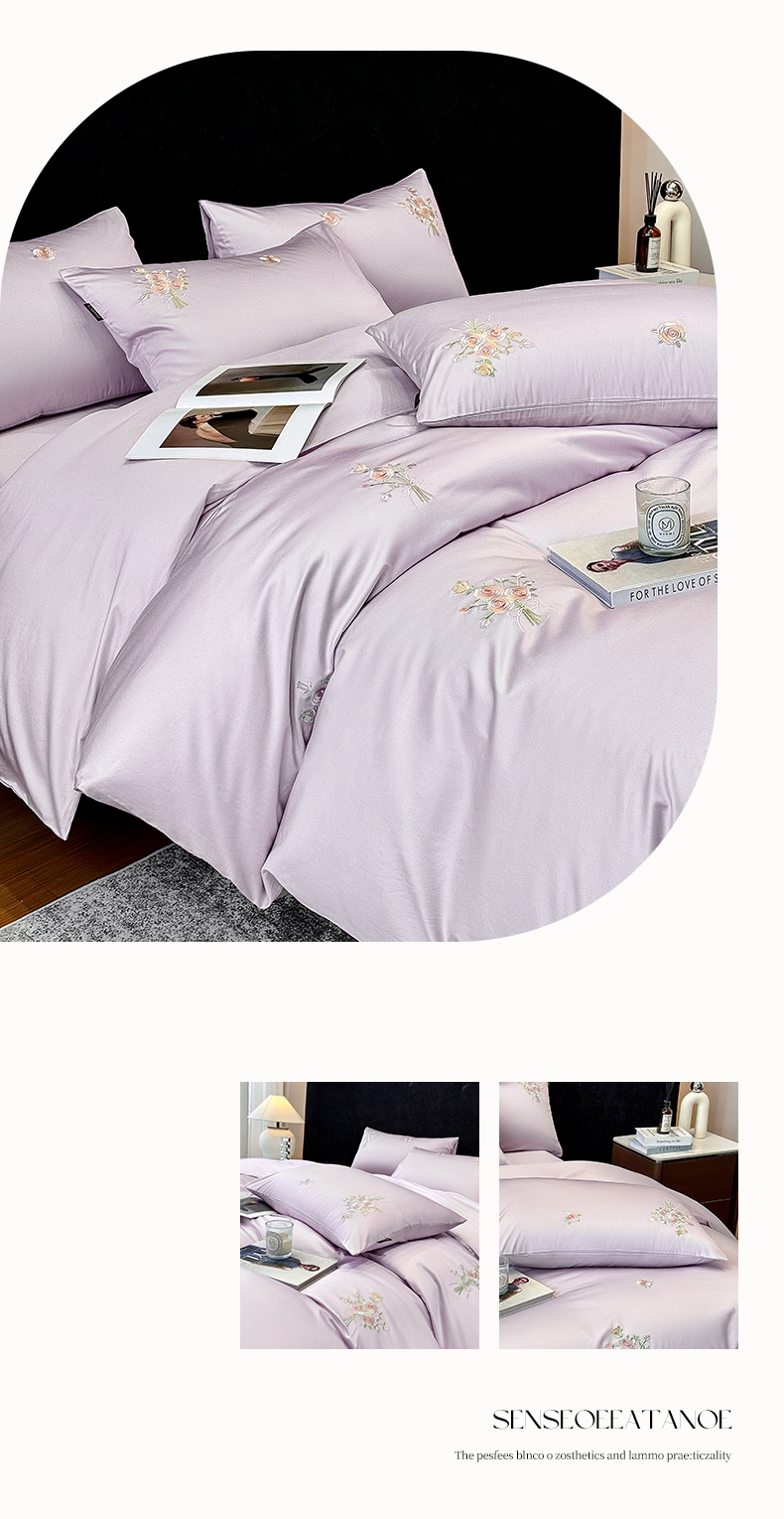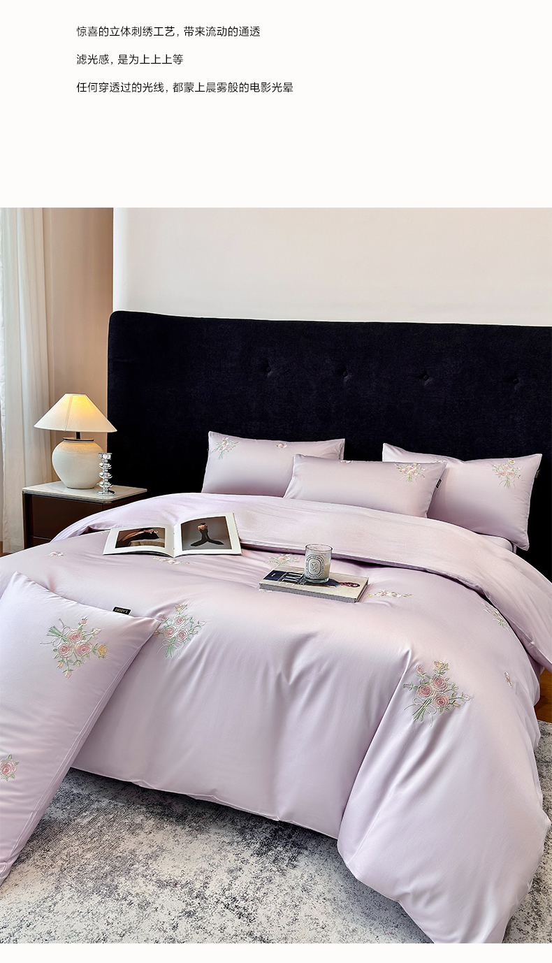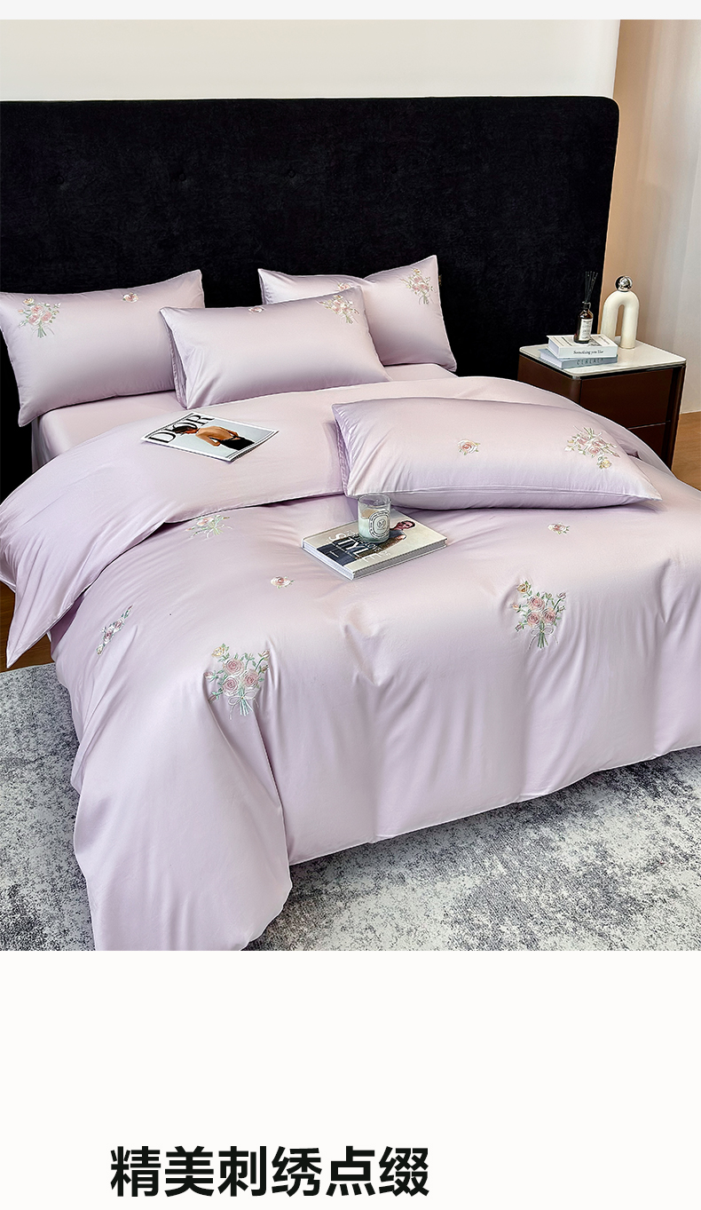 欣宜家纺 2026新款50s纯棉全棉贡缎长绒棉刺绣绣花床上四件套【含高端礼盒】-花影系列 花影-香芋紫