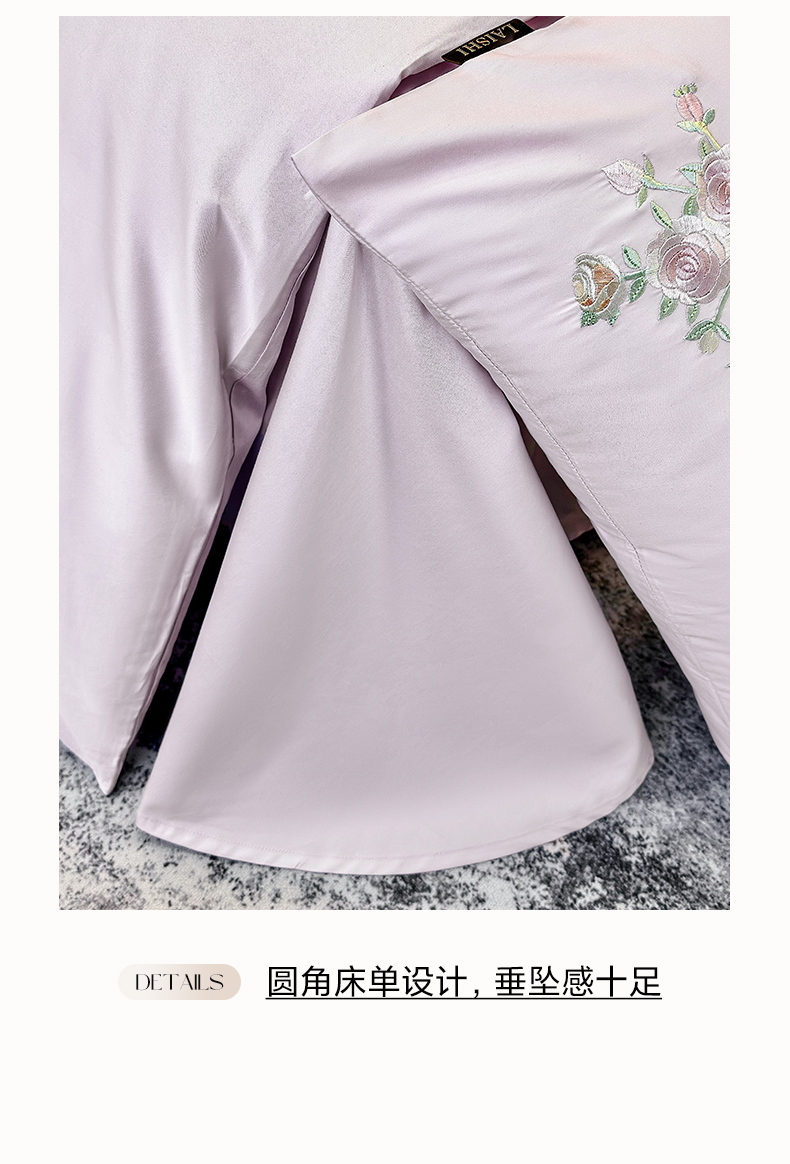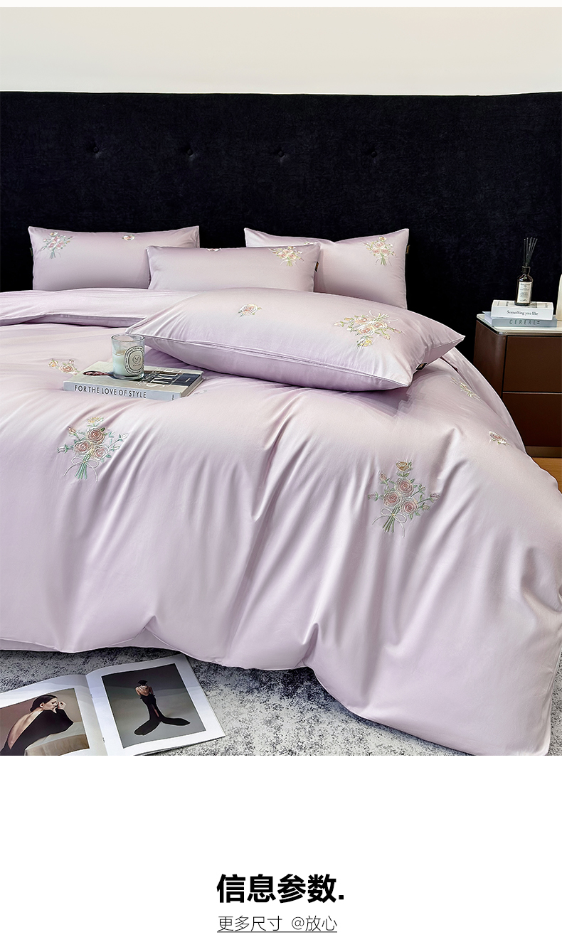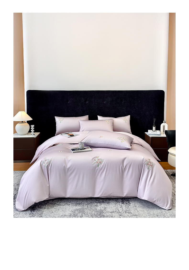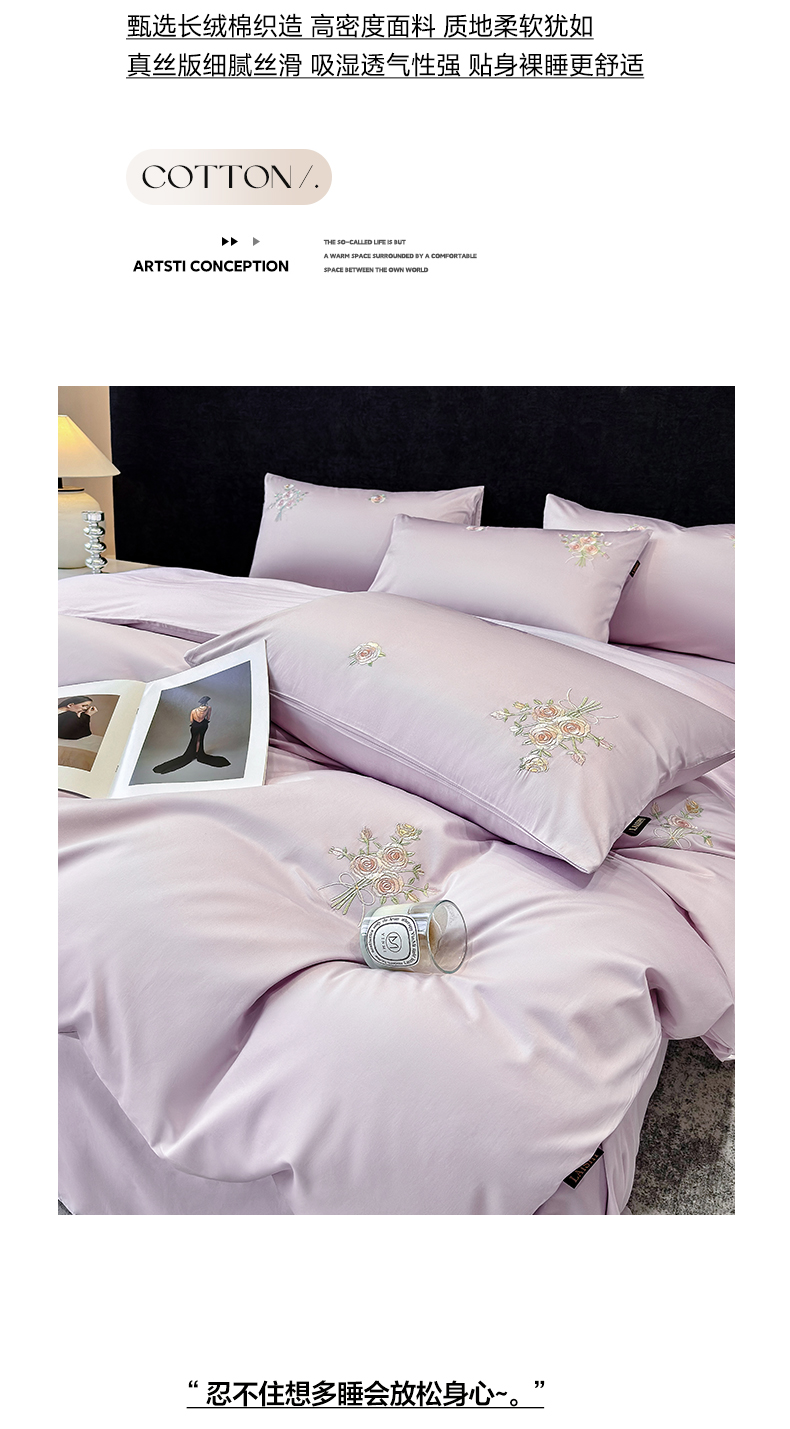 欣宜家纺 2026新款50s纯棉全棉贡缎长绒棉刺绣绣花床上四件套【含高端礼盒】-花影系列 花影-香芋紫