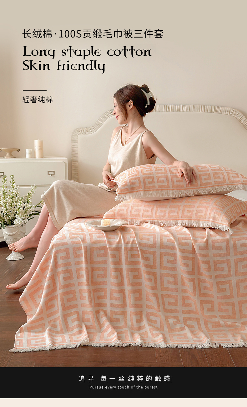 商品名称:朴尔家纺-毛巾被 2026新款长绒棉100s贡缎丝光棉纯棉流苏纱布毛巾被三件套 巴宝方格-橙粉