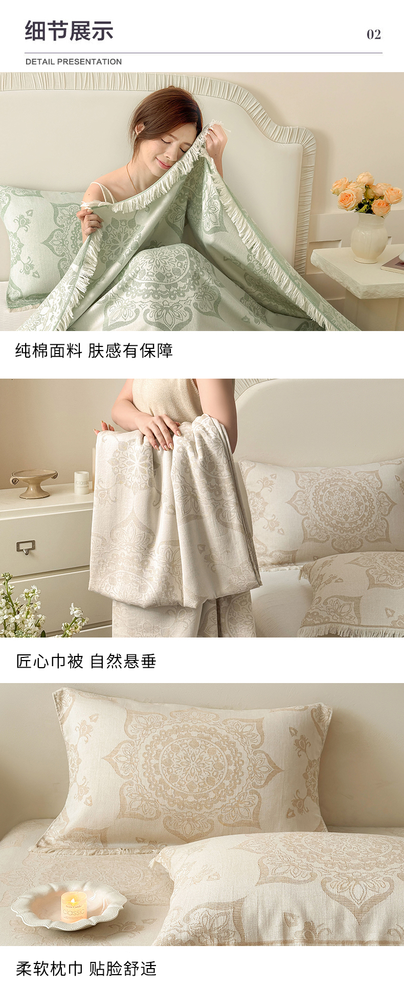 商品名称:朴尔家纺-毛巾被 2026新款长绒棉100s贡缎丝光棉纯棉流苏纱布毛巾被三件套 优雅欧纹-绿
