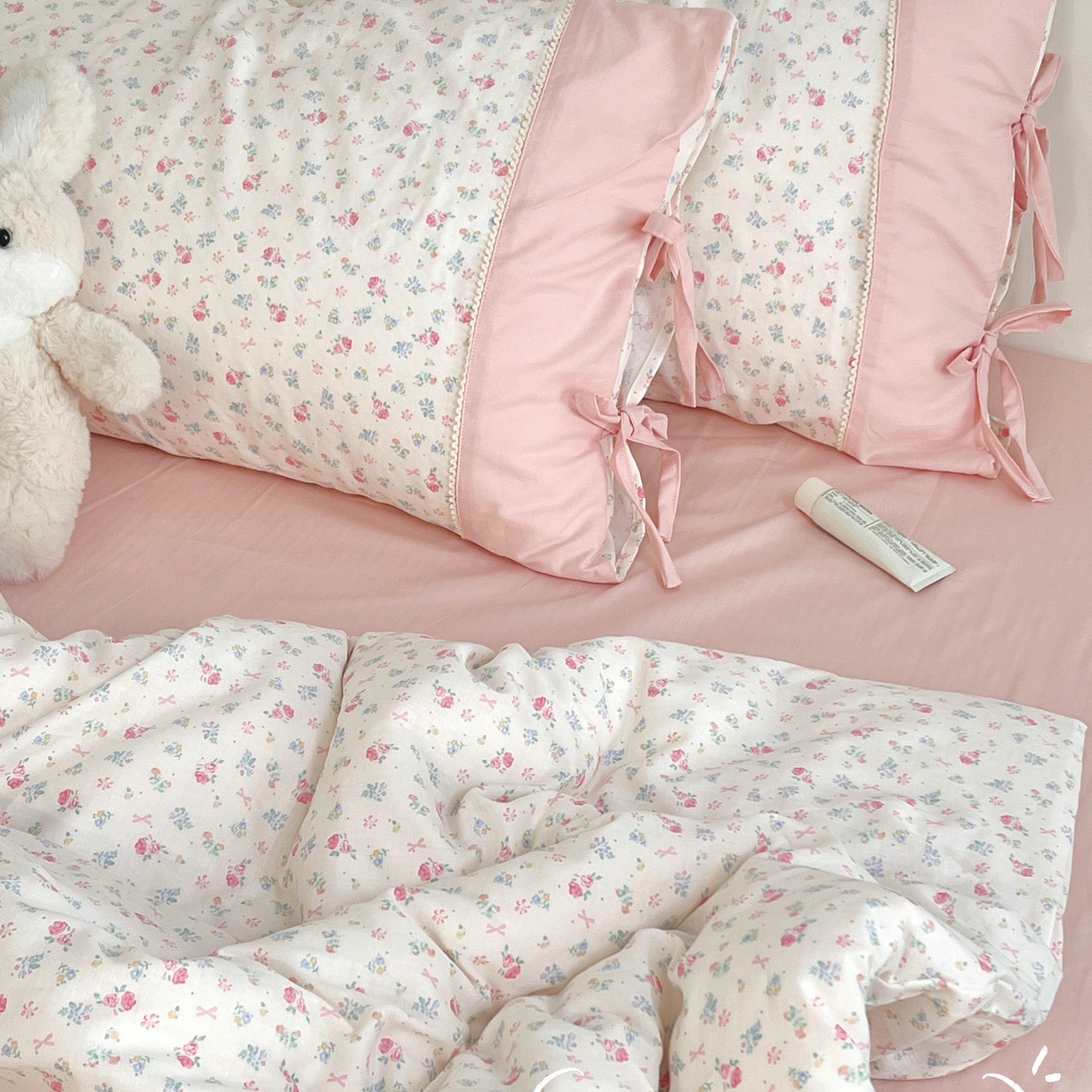 当前位置: 91家纺网 > 商品网购 > 床品套件 > 四件套 > 其它四件套 > 荣轩家居 2026新品韩式拼接系绳蝴蝶结工艺款四件套(铺床版) 甜心花园