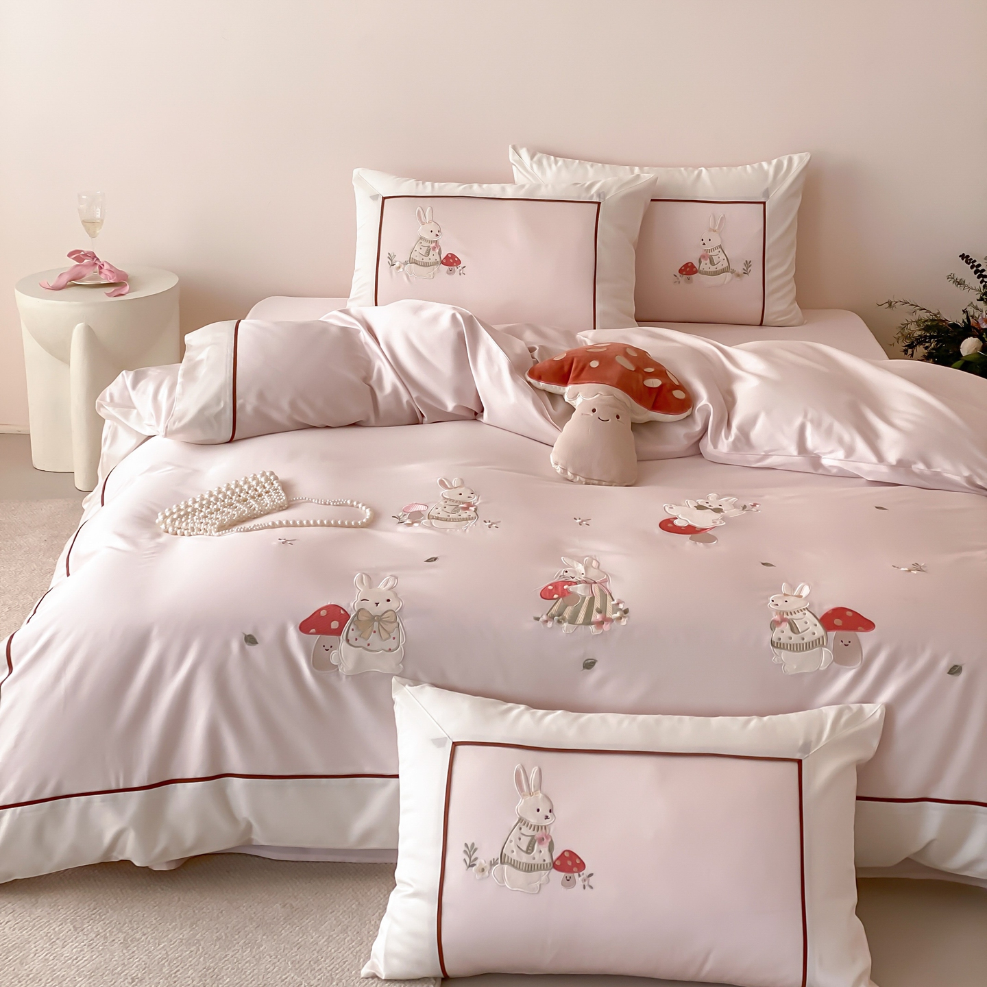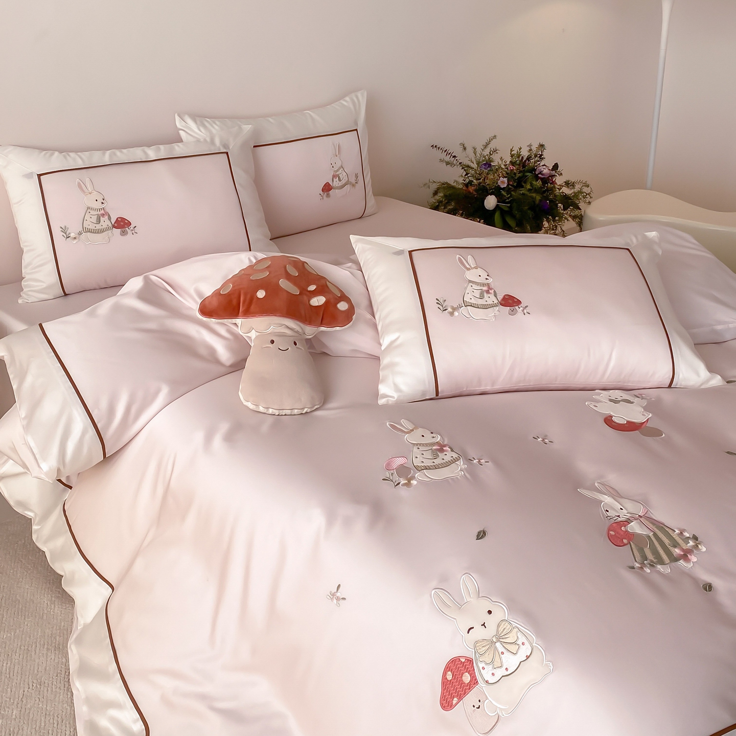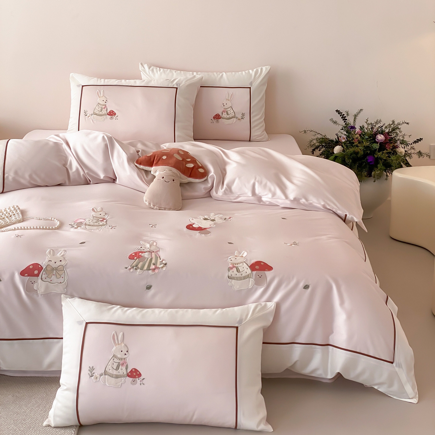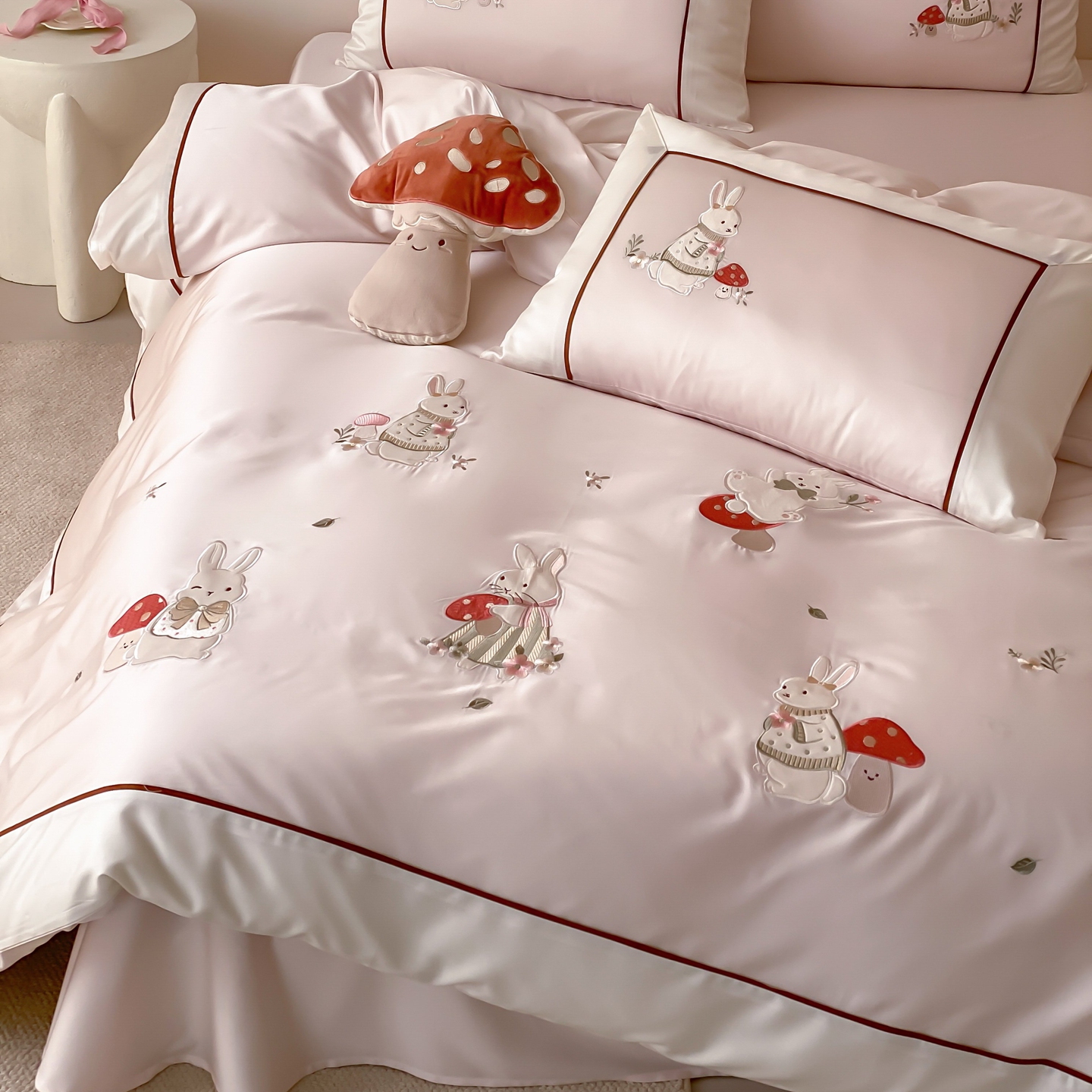当前位置: 91家纺网 > 商品网购 > 床品套件 > 四件套 > 长绒棉四件套 > (总)佳汐蓝家纺 2026春夏新款长绒棉纯棉贴布绣四件套-蘑菇小兔