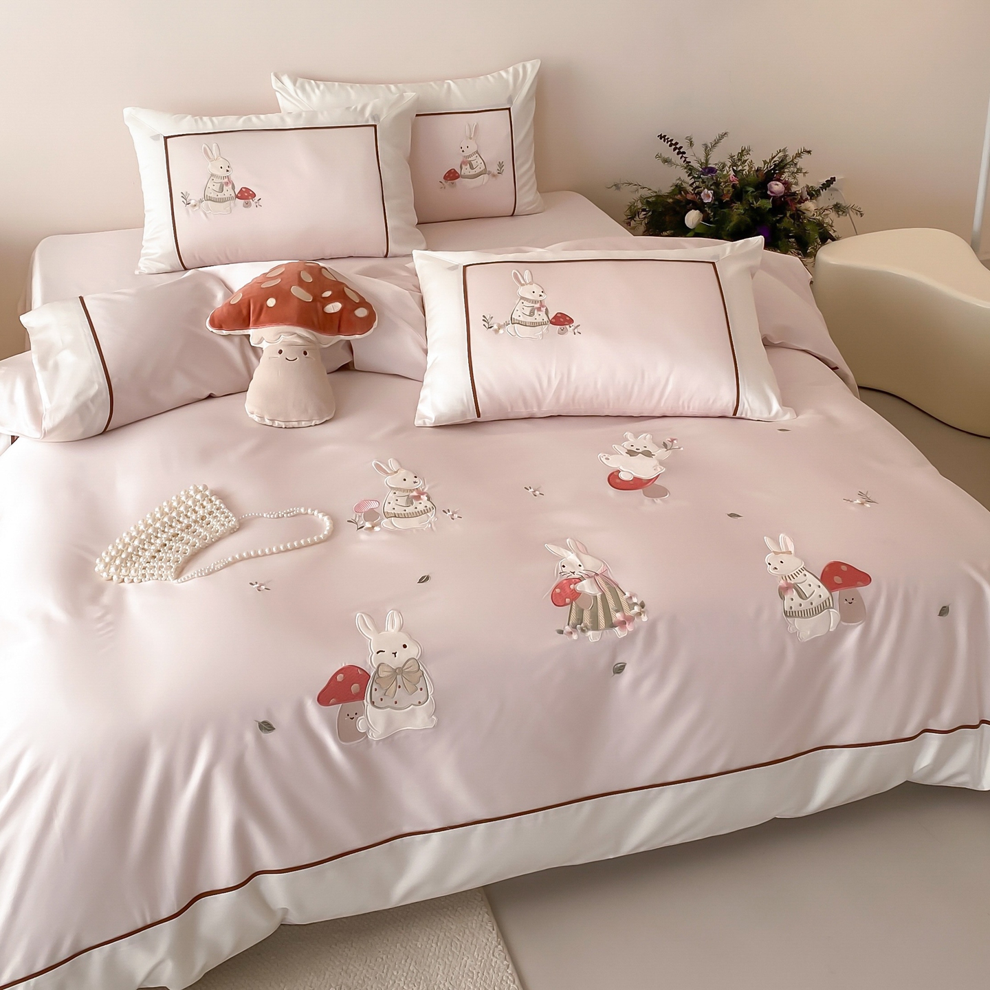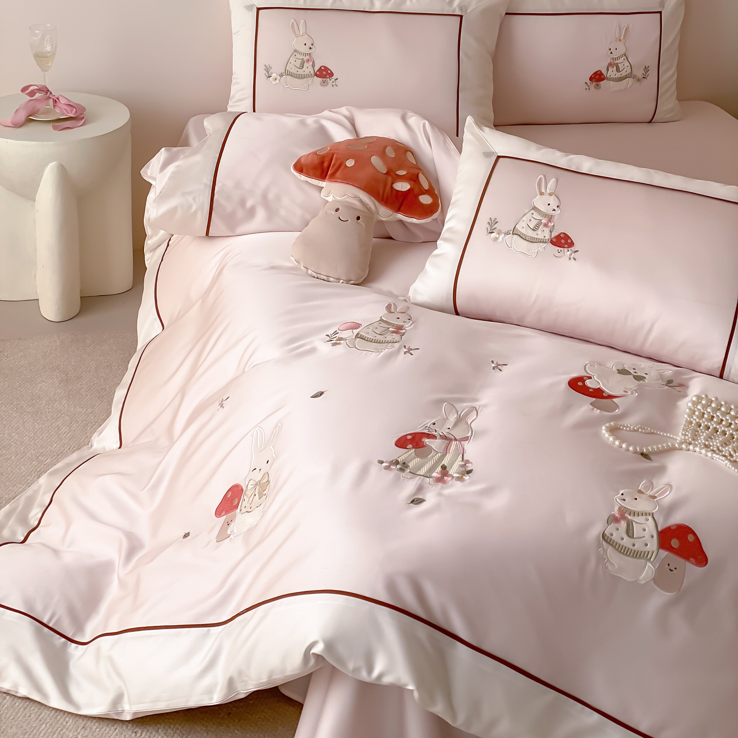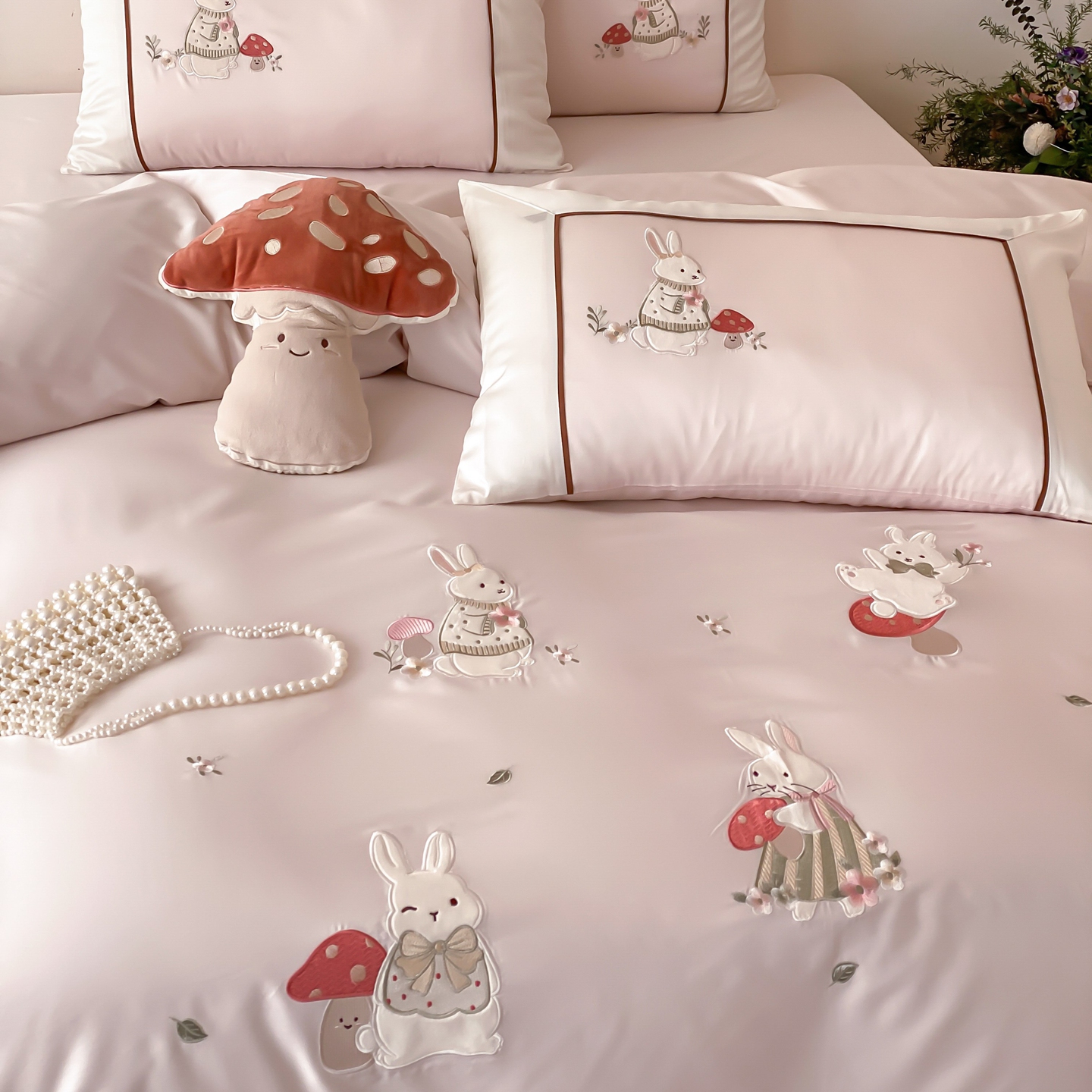 当前位置: 91家纺网 > 商品网购 > 床品套件 > 四件套 > 长绒棉四件套 > (总)佳汐蓝家纺 2026春夏新款长绒棉纯棉贴布绣四件套-蘑菇小兔