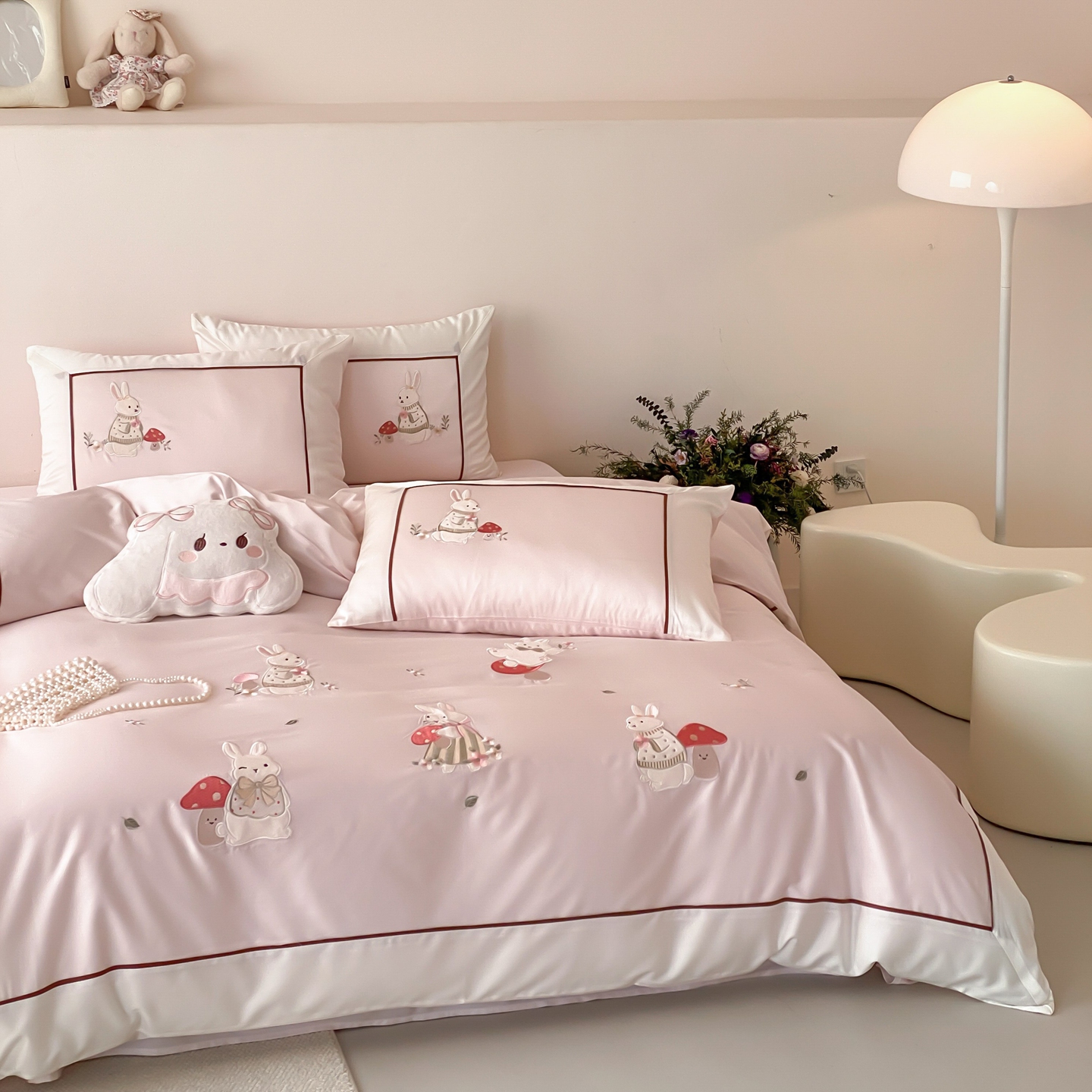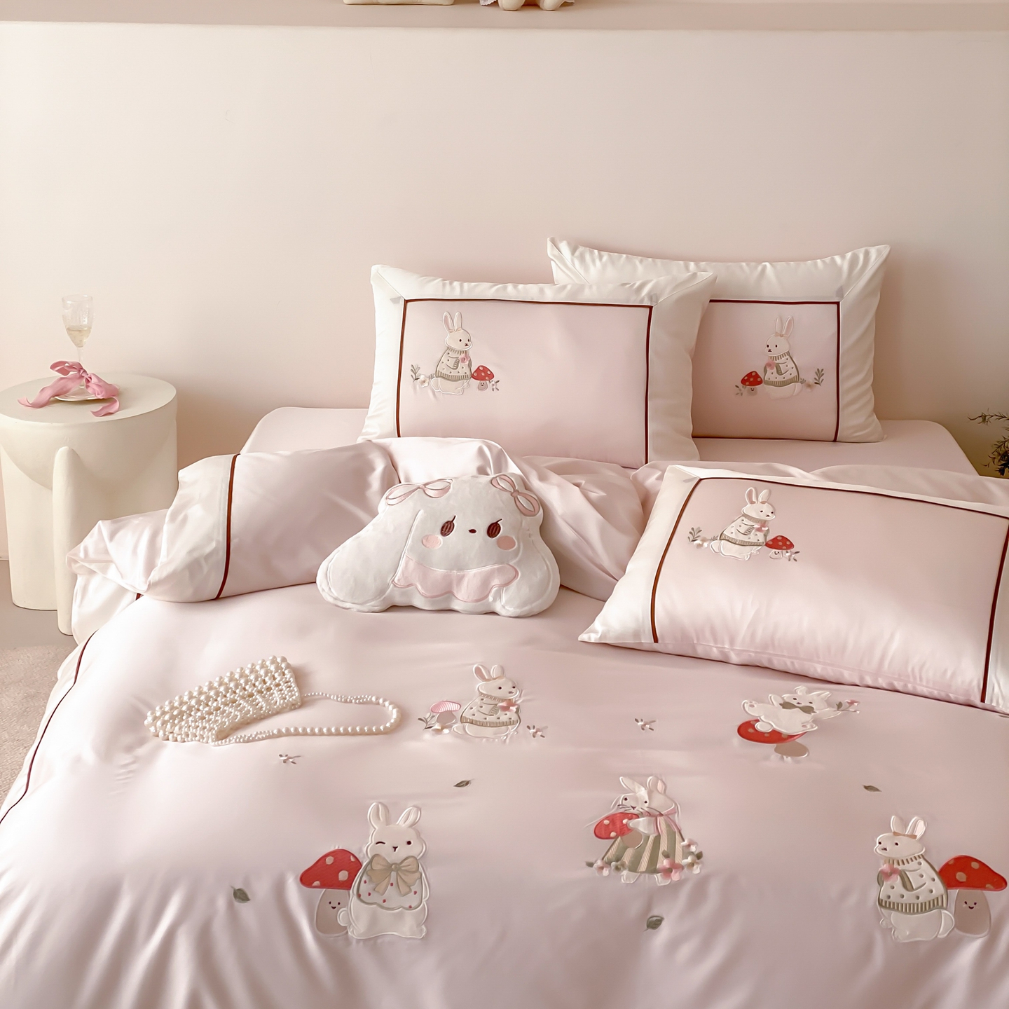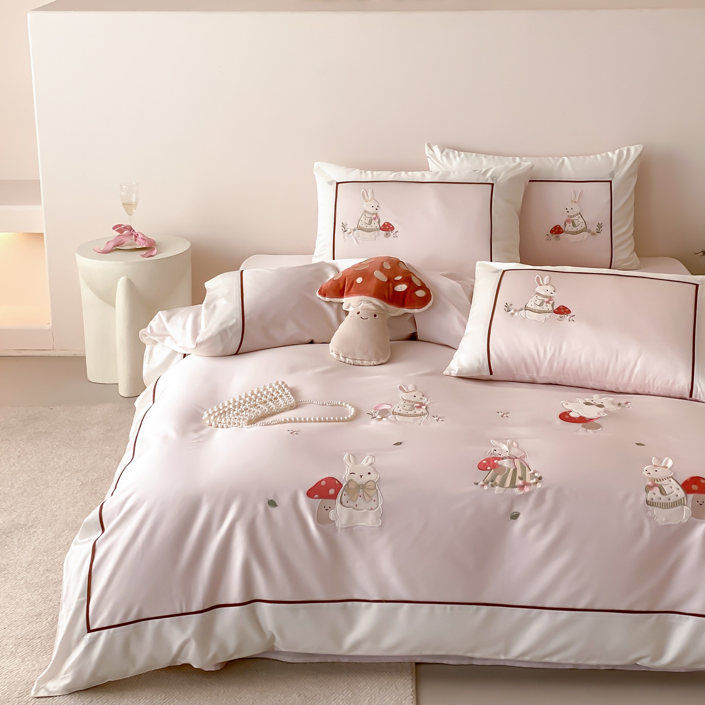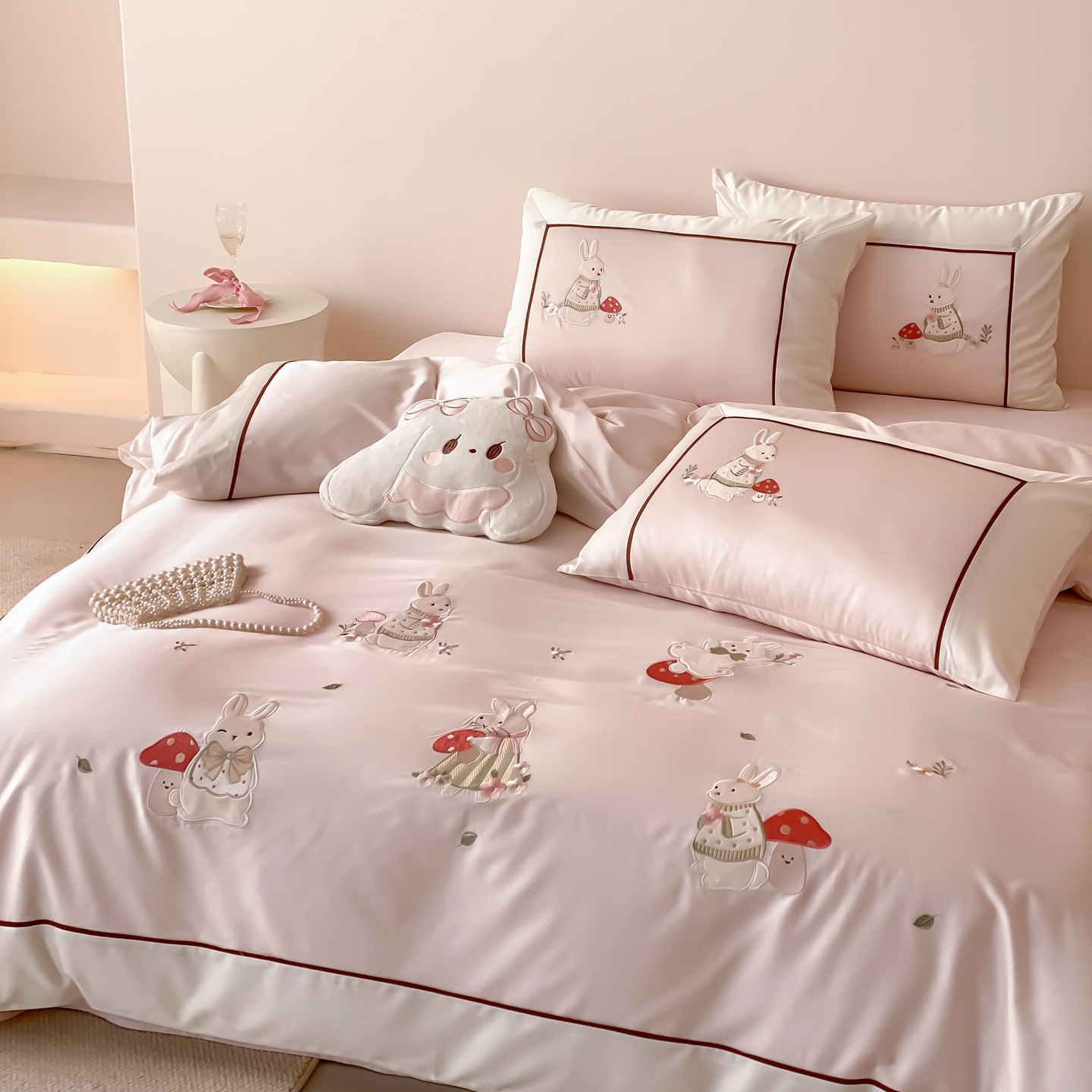 当前位置: 91家纺网 > 商品网购 > 床品套件 > 四件套 > 长绒棉四件套 > (总)佳汐蓝家纺 2026春夏新款长绒棉纯棉贴布绣四件套-蘑菇小兔