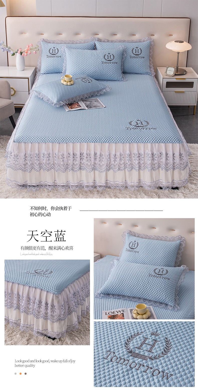 (总)优姿家纺 2025新款500克冰豆豆床裙凉席三件套,冰川蓝,高级灰,公主粉,奶油咖,青草绿,天空蓝
