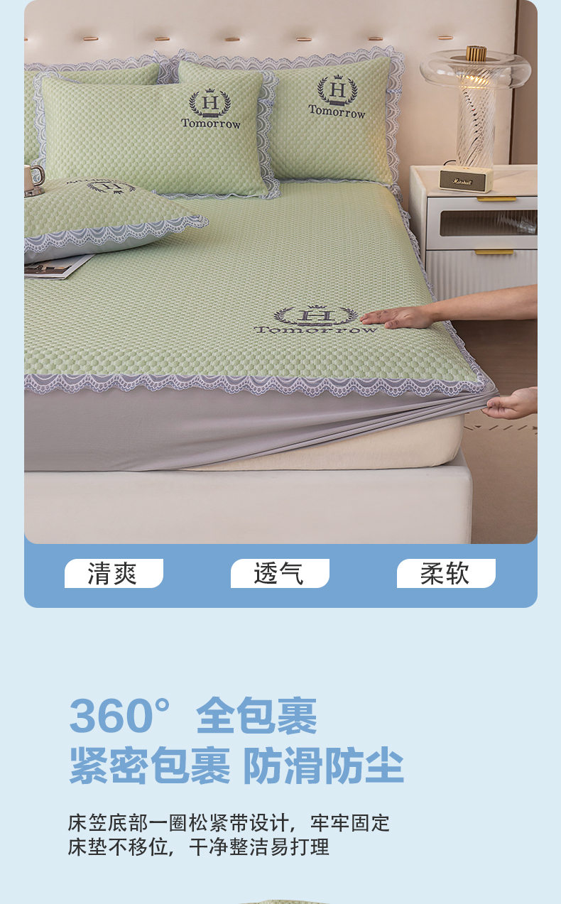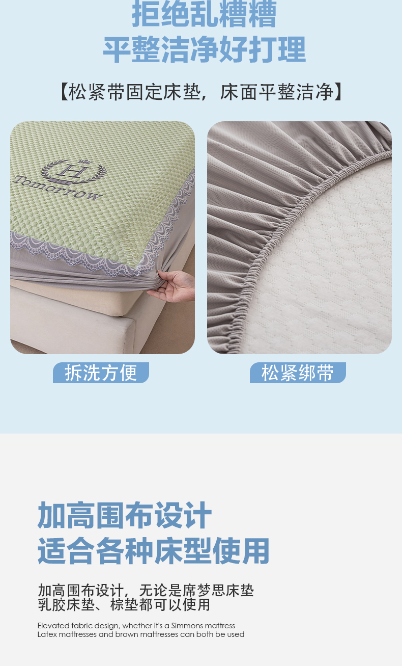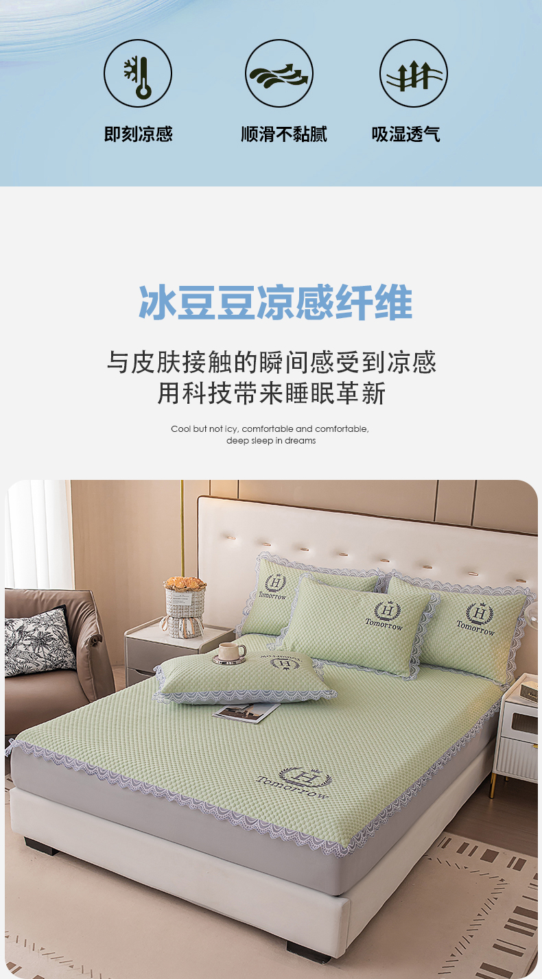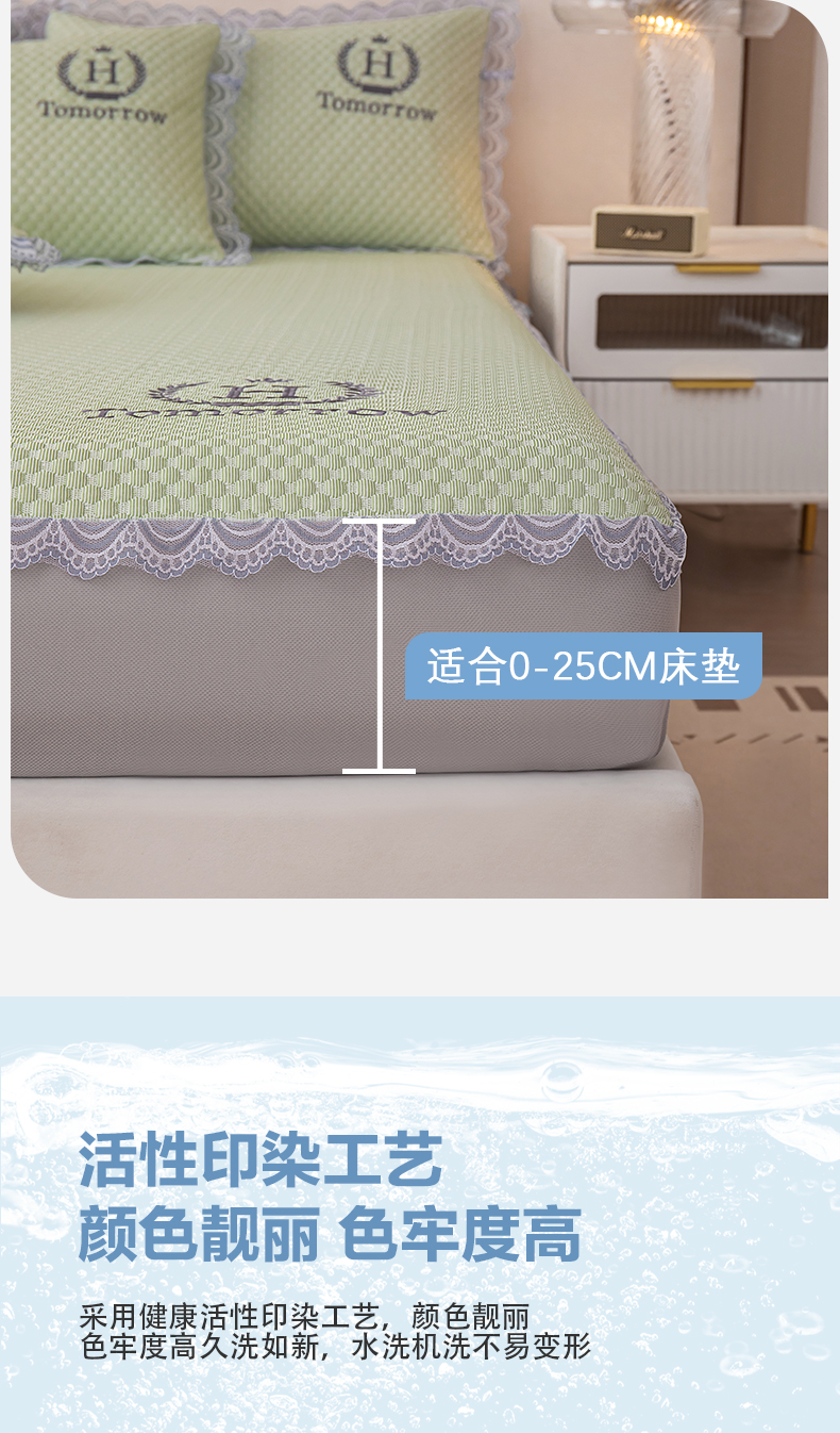 (总)优姿家纺 2025新款500克冰豆豆床裙凉席三件套,冰川蓝,高级灰,公主粉,奶油咖,青草绿,天空蓝