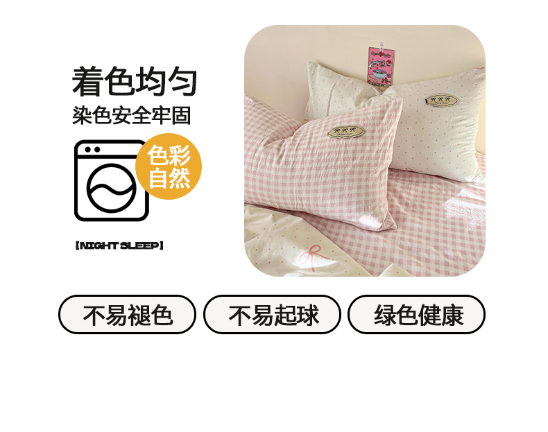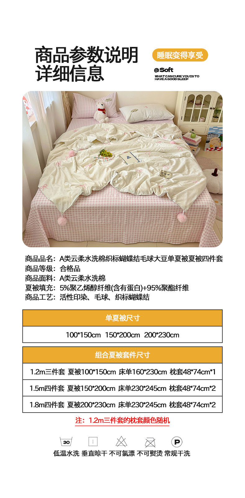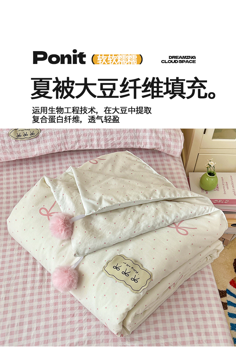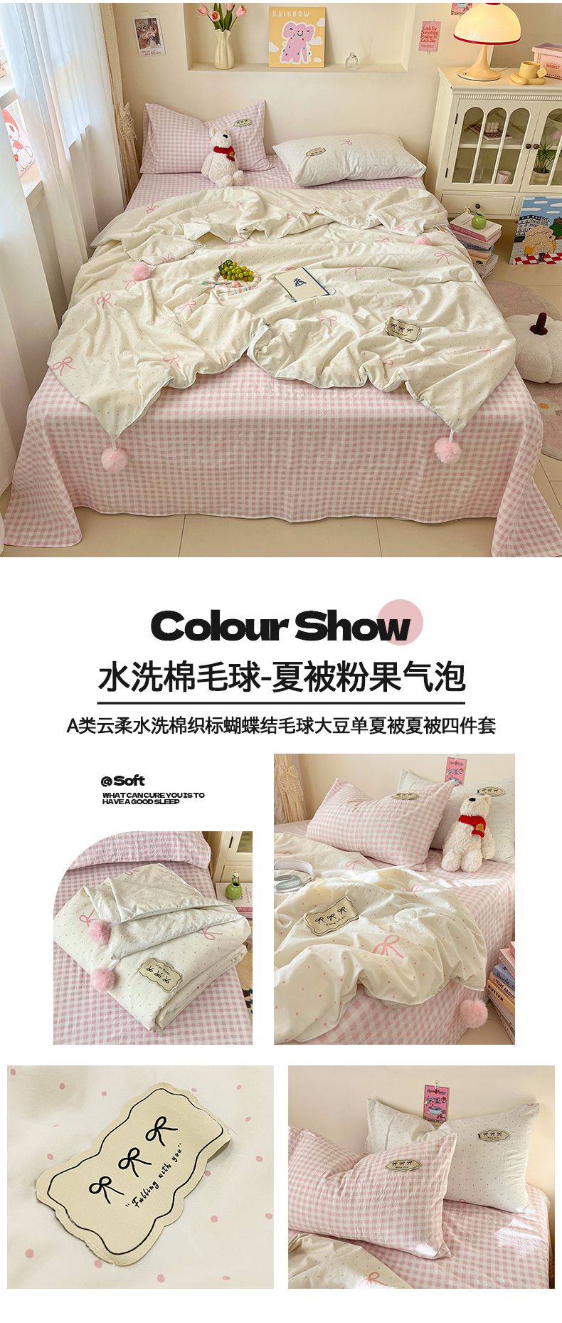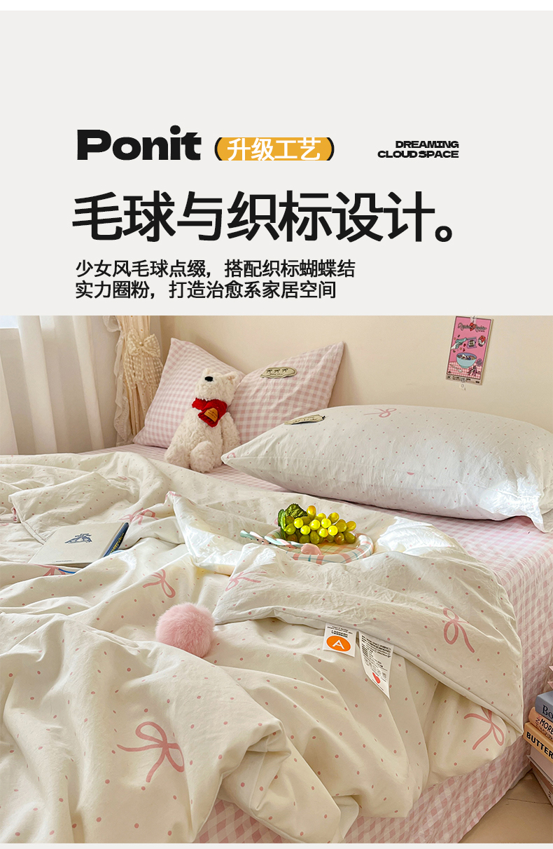 当前位置: 91家纺网 > 商品网购 > 床品套件 > 四件套 > 夏被四件套 > 桃心家居 2026新款A类ins云柔水洗棉织标蝴蝶结毛球少女大豆单夏被夏被四件套系列 水洗棉毛球-夏被粉果气泡