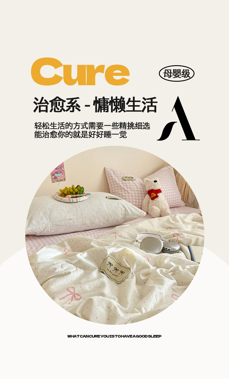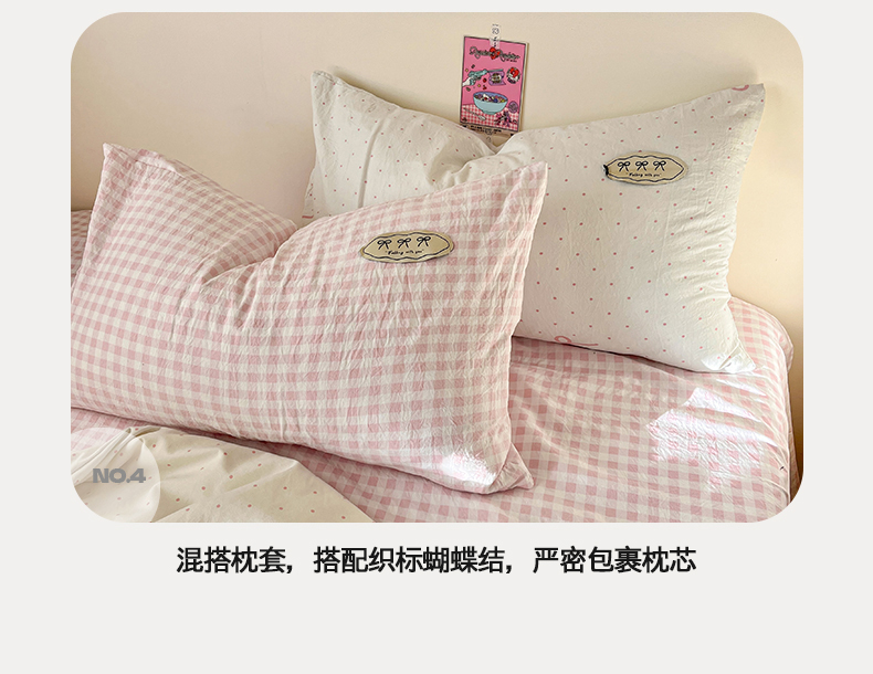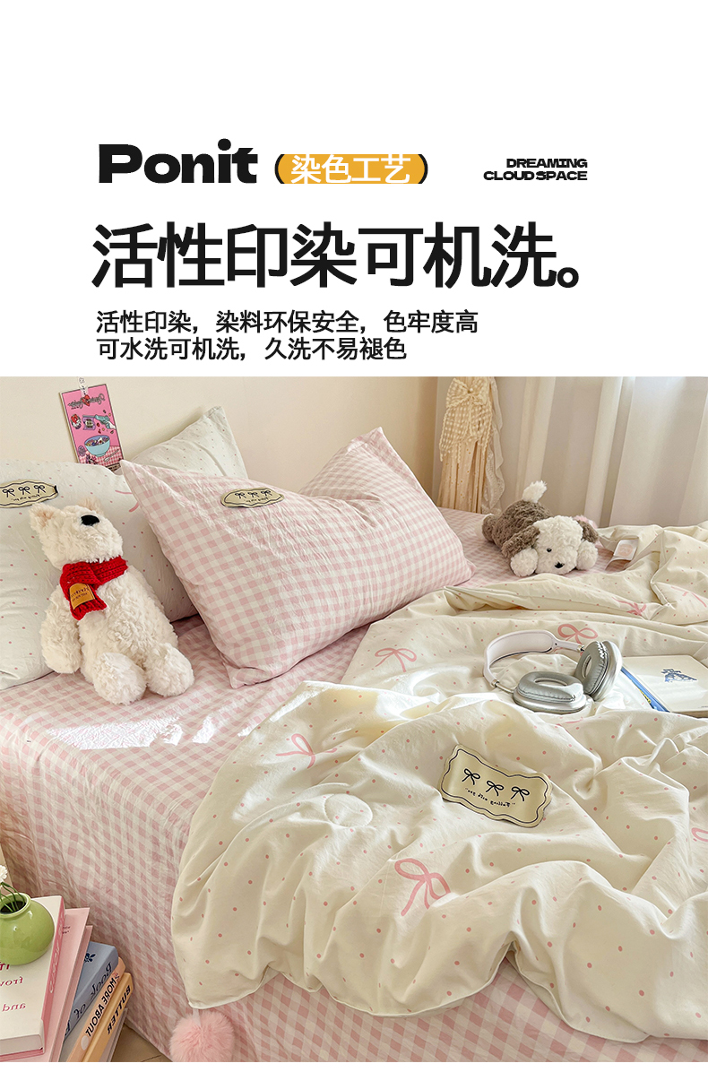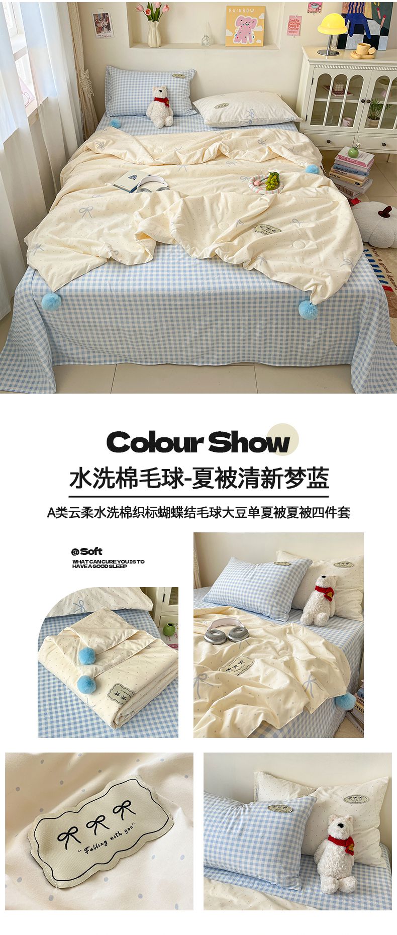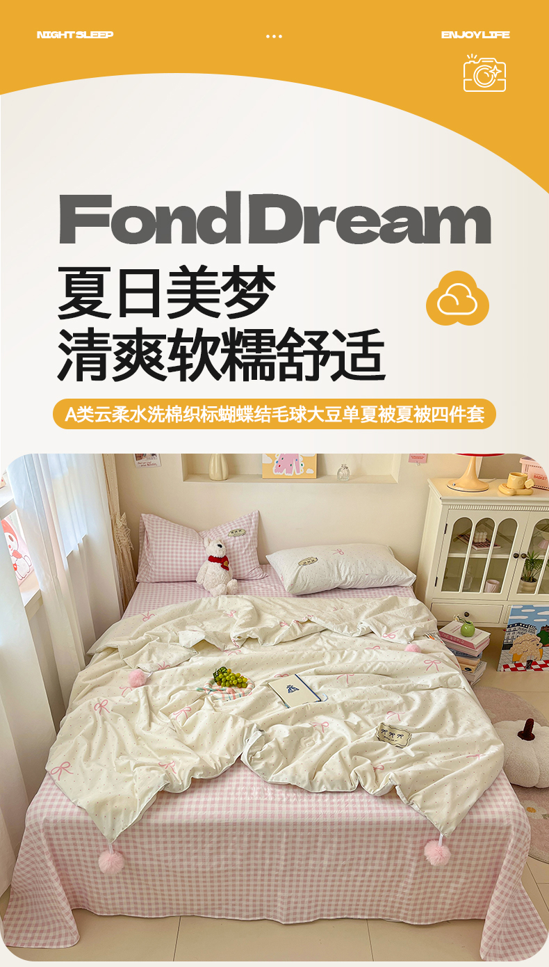 当前位置: 91家纺网 > 商品网购 > 床品套件 > 四件套 > 夏被四件套 > 桃心家居 2026新款A类ins云柔水洗棉织标蝴蝶结毛球少女大豆单夏被夏被四件套系列 水洗棉毛球-夏被粉果气泡
