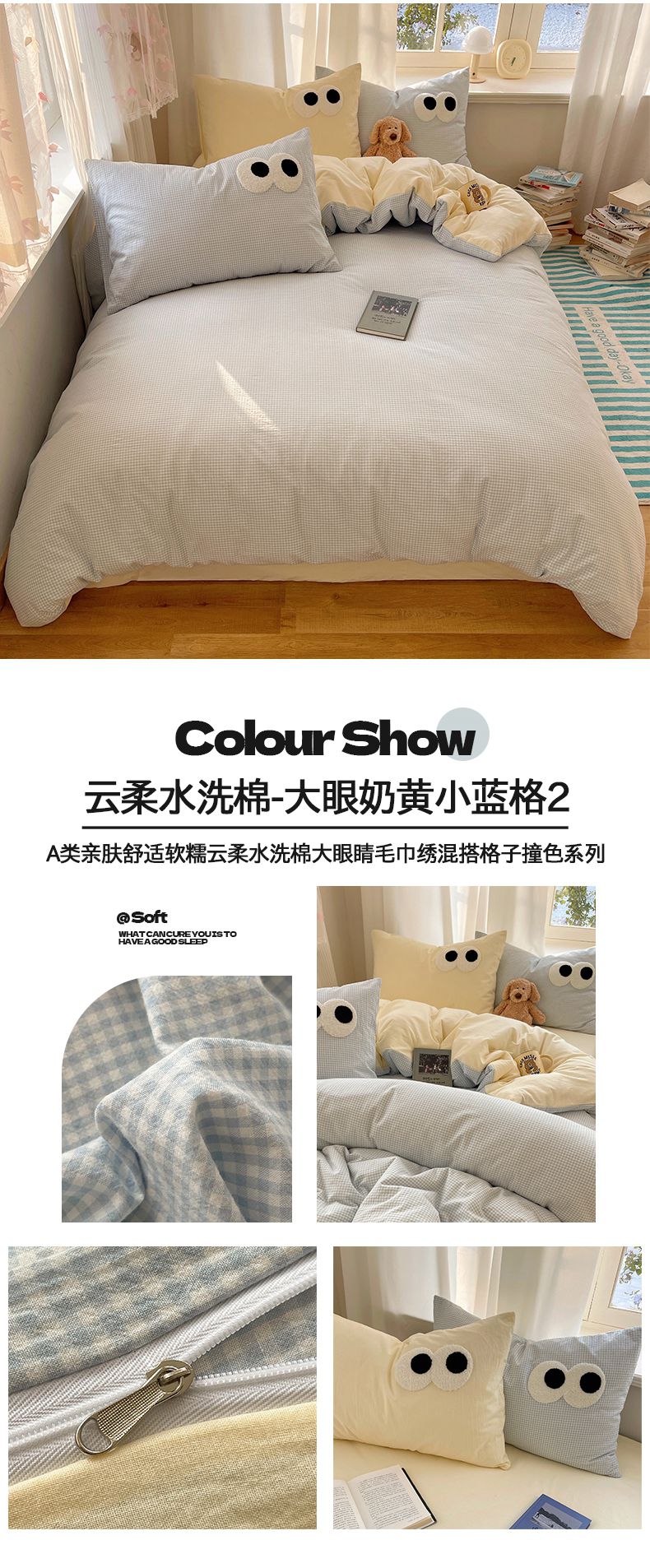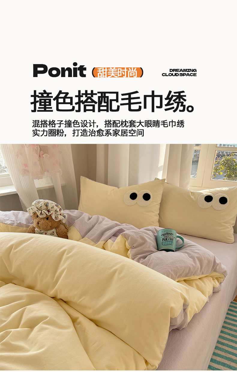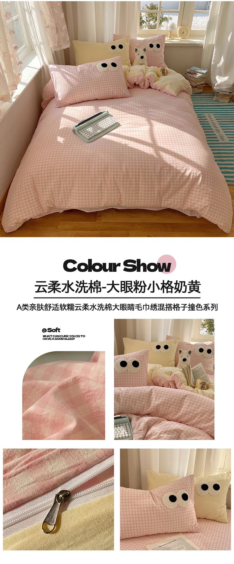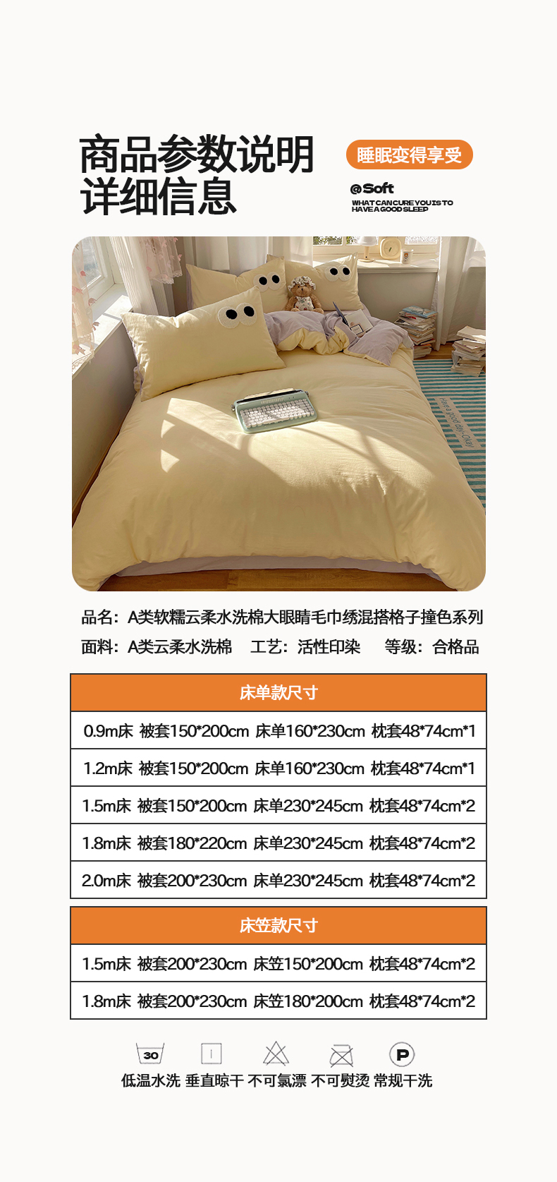当前位置: 91家纺网 > 商品网购 > 床品套件 > 四件套 > 毛巾绣四件套 > 桃心家居 2026新款A类亲肤舒适软糯云柔水洗棉大眼睛毛巾绣混搭格子撞色系列四件套 云柔水洗棉-大眼奶油葡萄