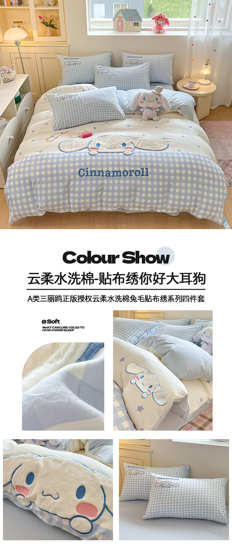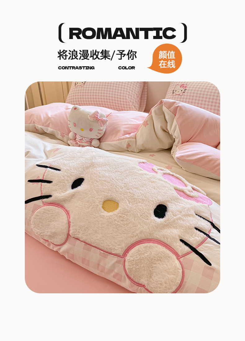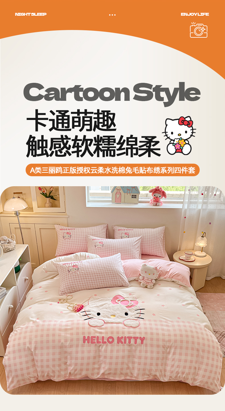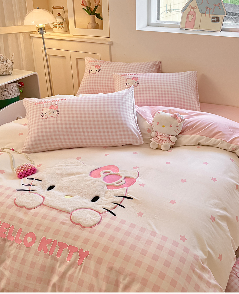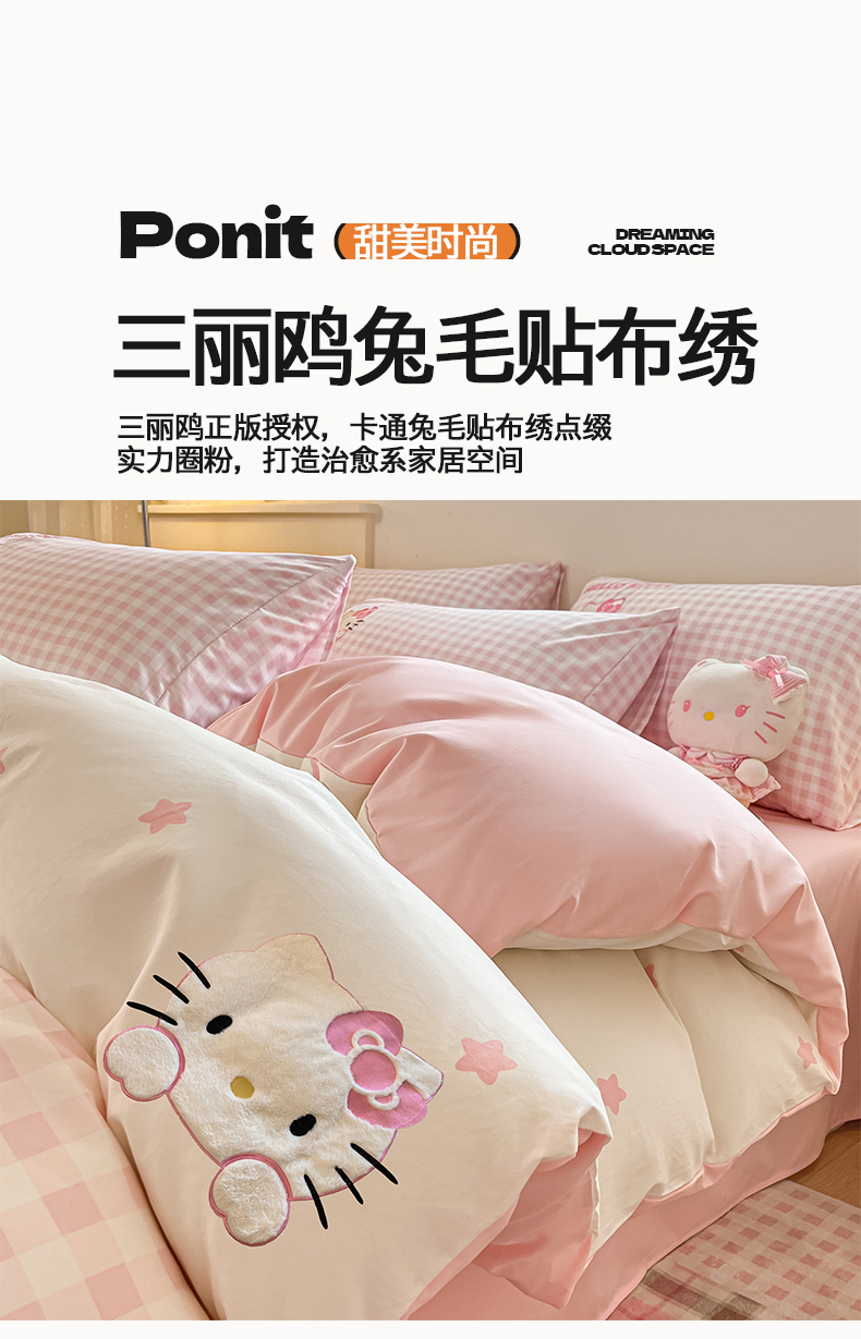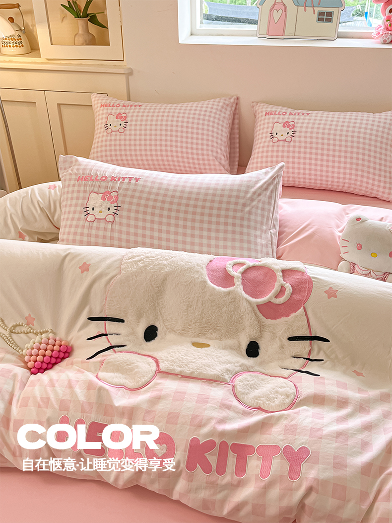 当前位置: 91家纺网 > 商品网购 > 床品套件 > 四件套 > 水洗棉四件套 > 桃心家居 2026新款A类三丽鸥正版授权云柔水洗棉兔毛贴布绣刺绣软糯系列四件套 云柔水洗棉-贴布绣粉格KT