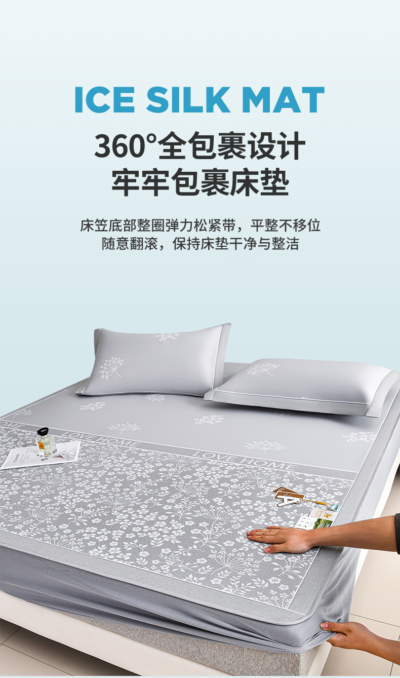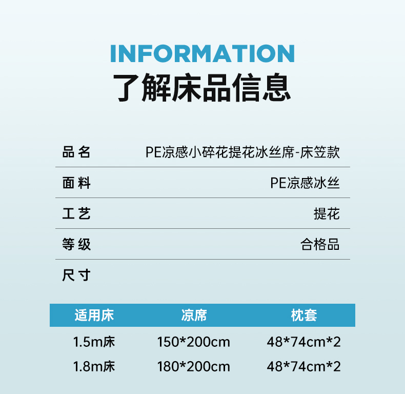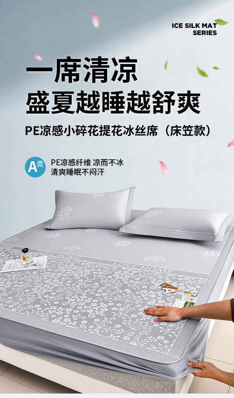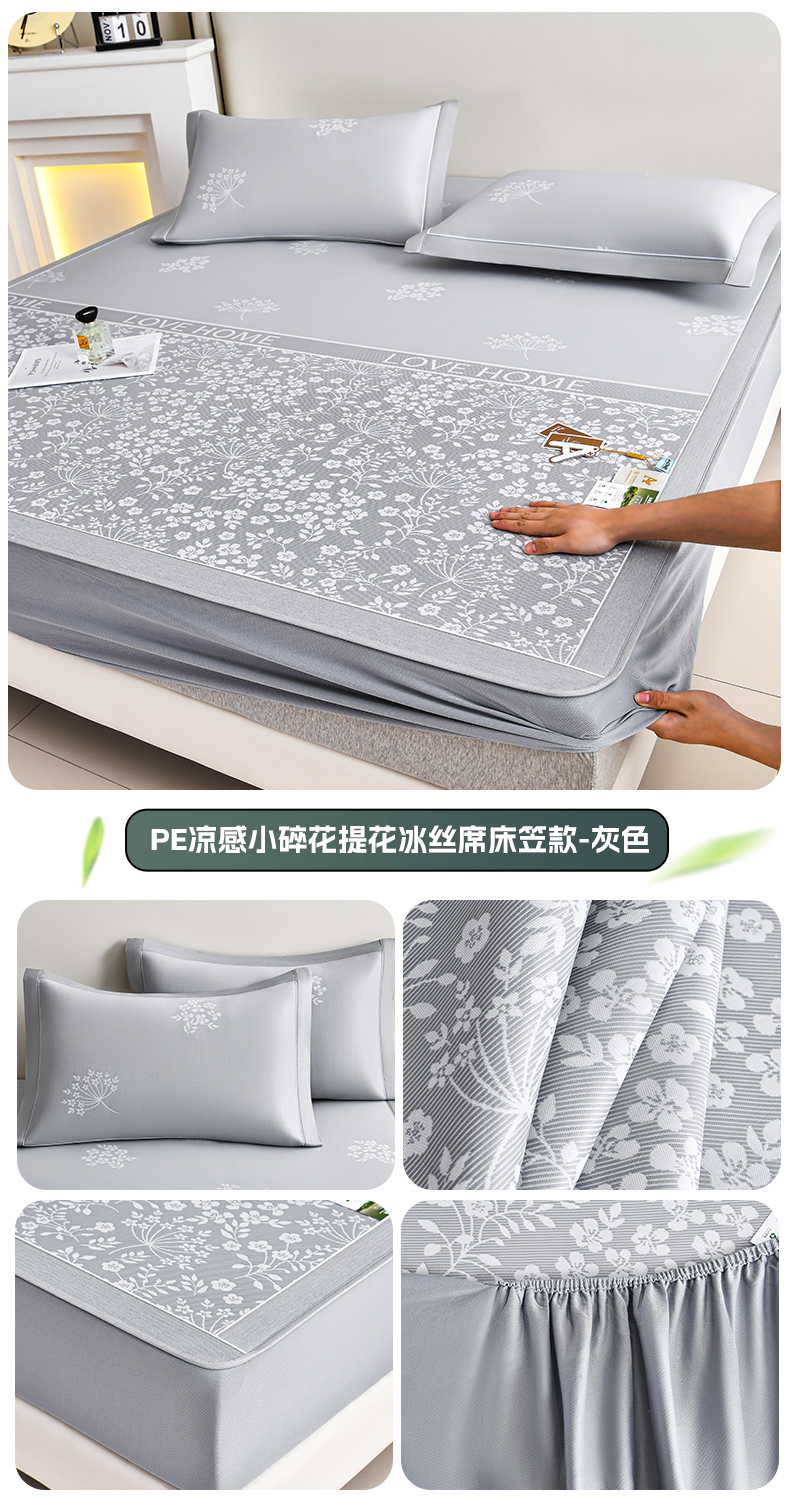 (总)小牛席业 2026春夏新款【实拍风格】PE凉感小碎花提花冰丝席凉席席子(床笠款),灰色,粉色,蓝色,抹茶,香槟