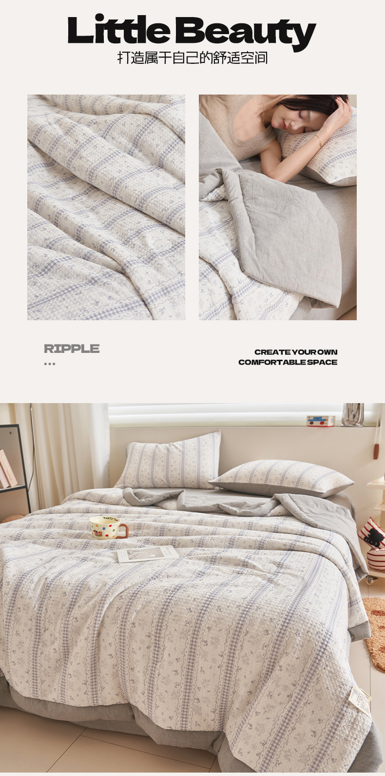 • 91家纺网 家纺一手货源 找家纺 (总)简如 2026新款A类全棉双层纱皱皱纱夏被四件套-简系列,本白,海盐蓝,奶茶粉,奶咖,奶昔白,浅粉,雾霾蓝