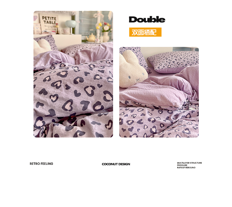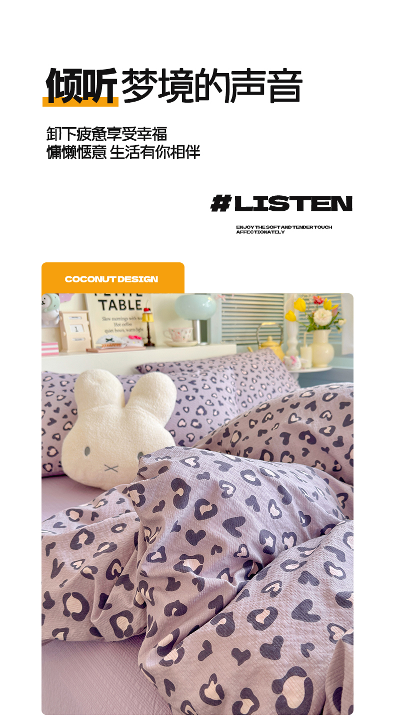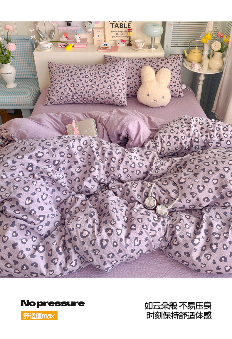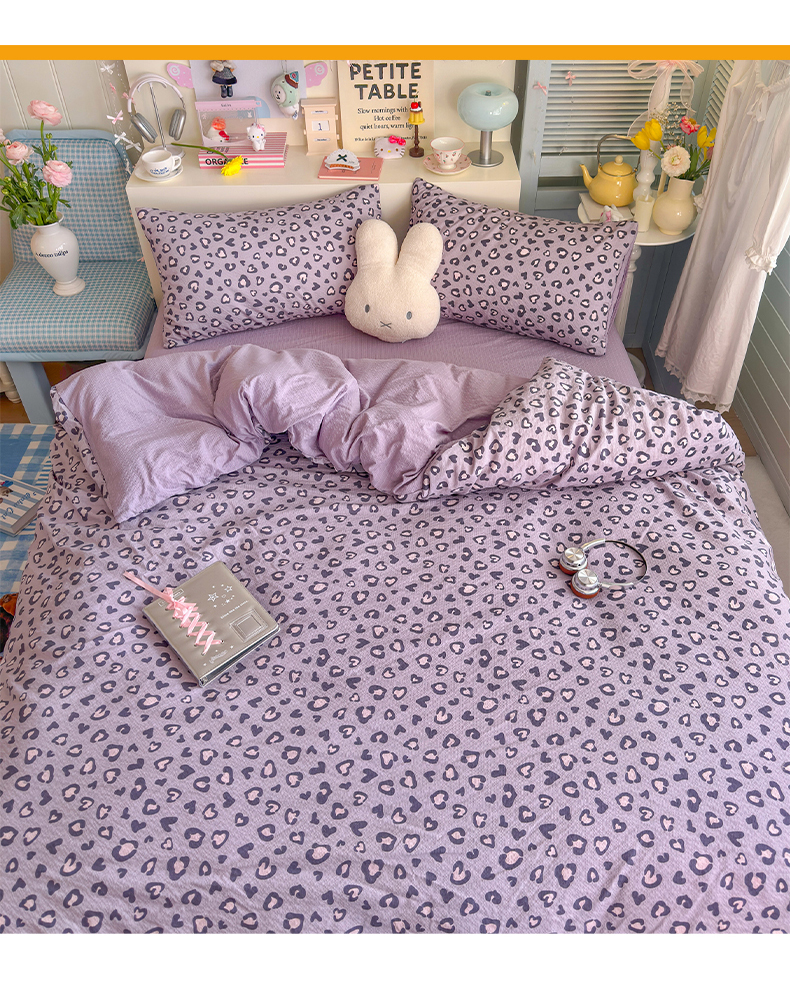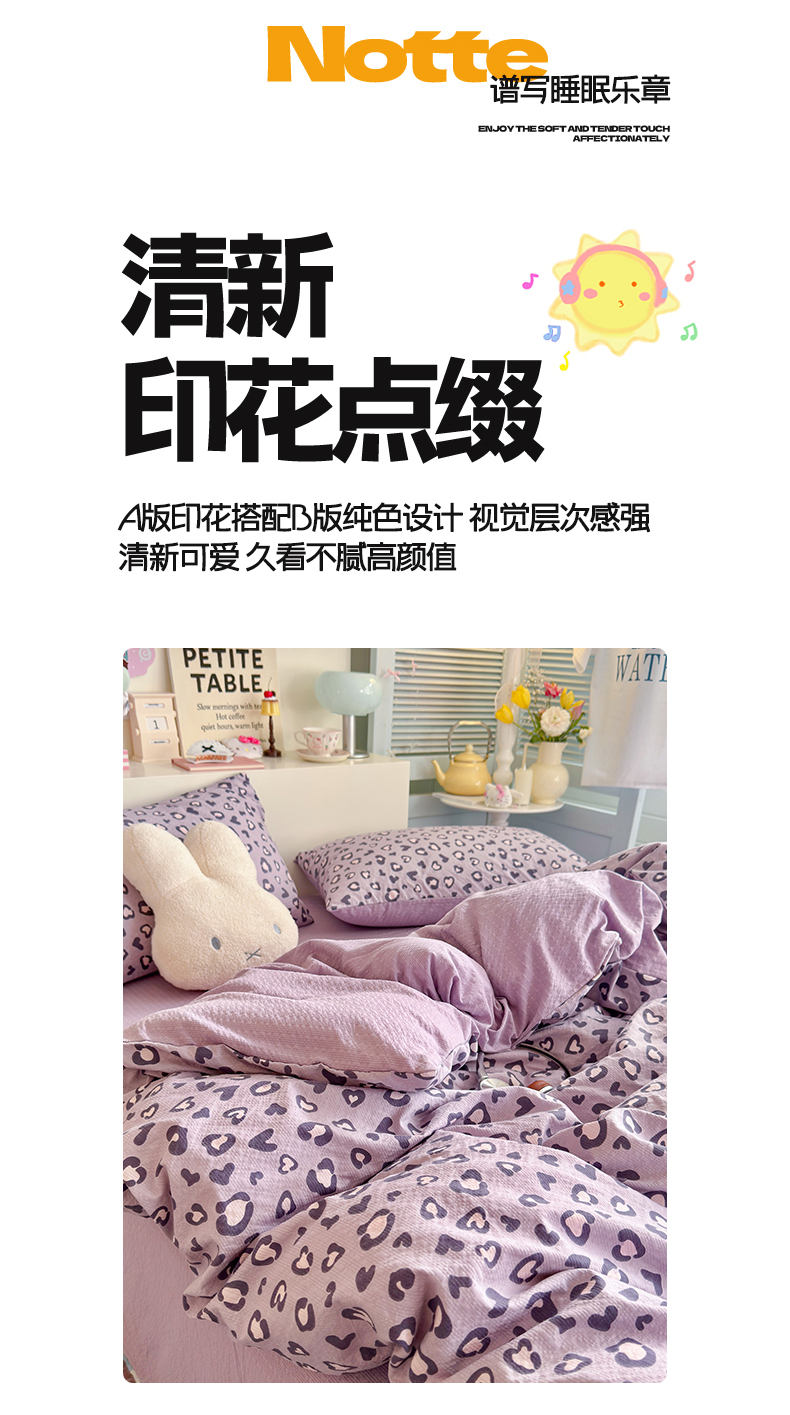 当前位置: 91家纺网 > 商品网购 > 床品套件 > 四件套 > 双层纱四件套 > 铺尚美家纺 2026新款小清新110g高品质直播热卖款A类泡芙棉双层纱四件套 紫豹纹