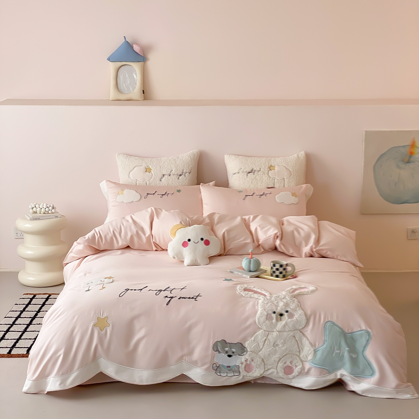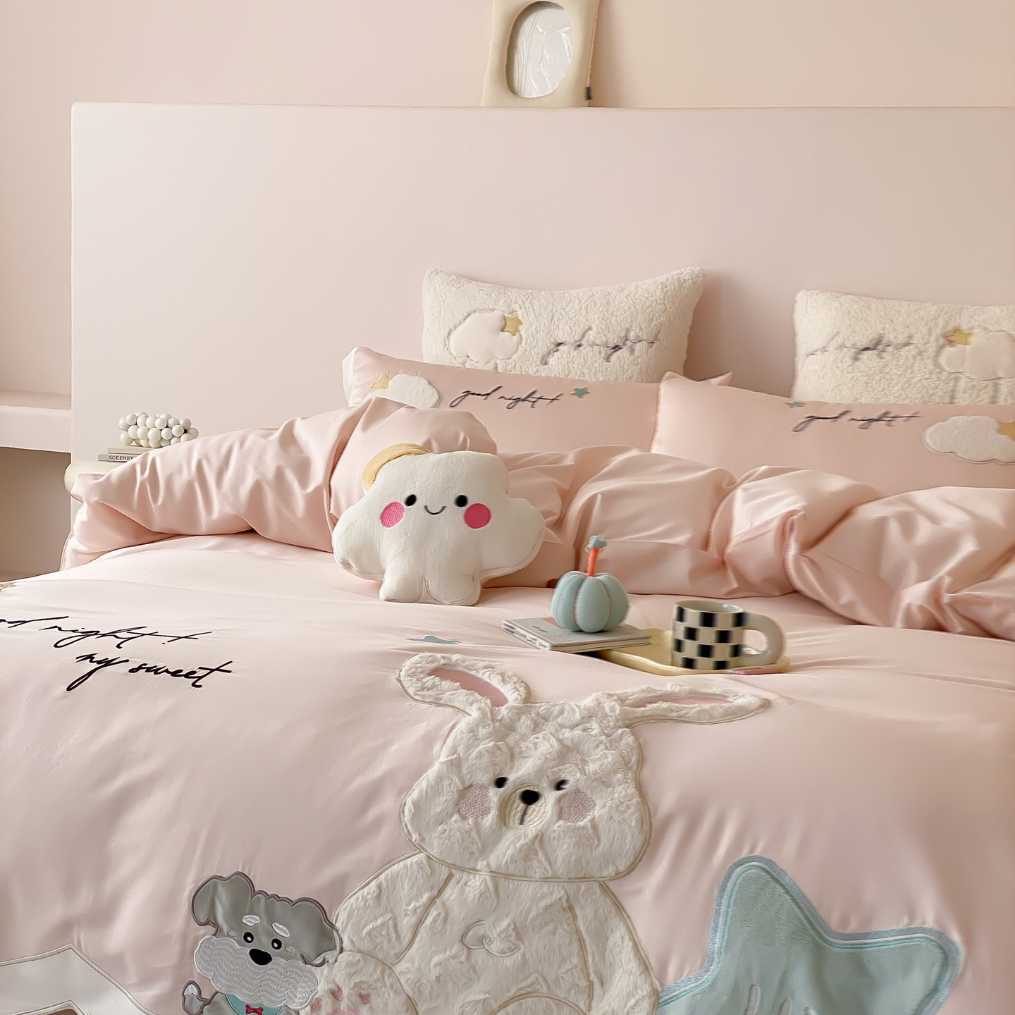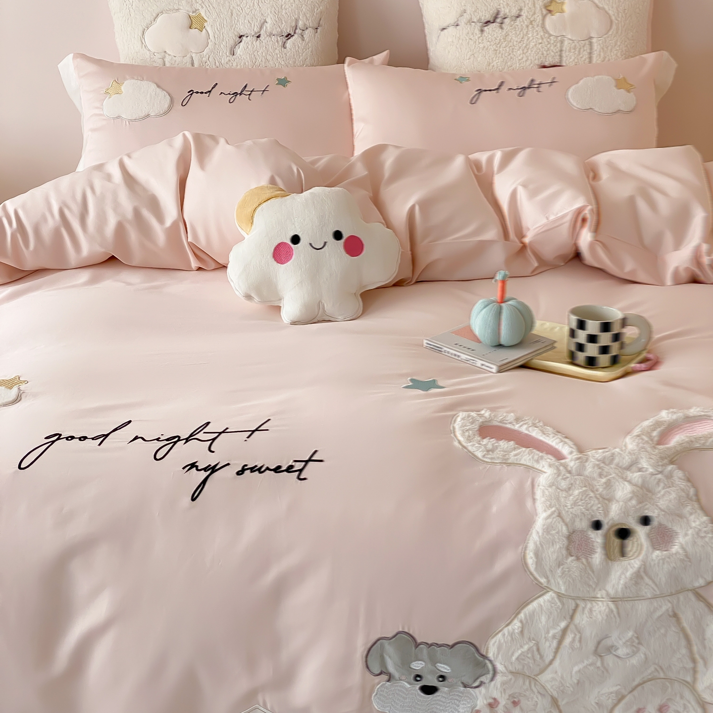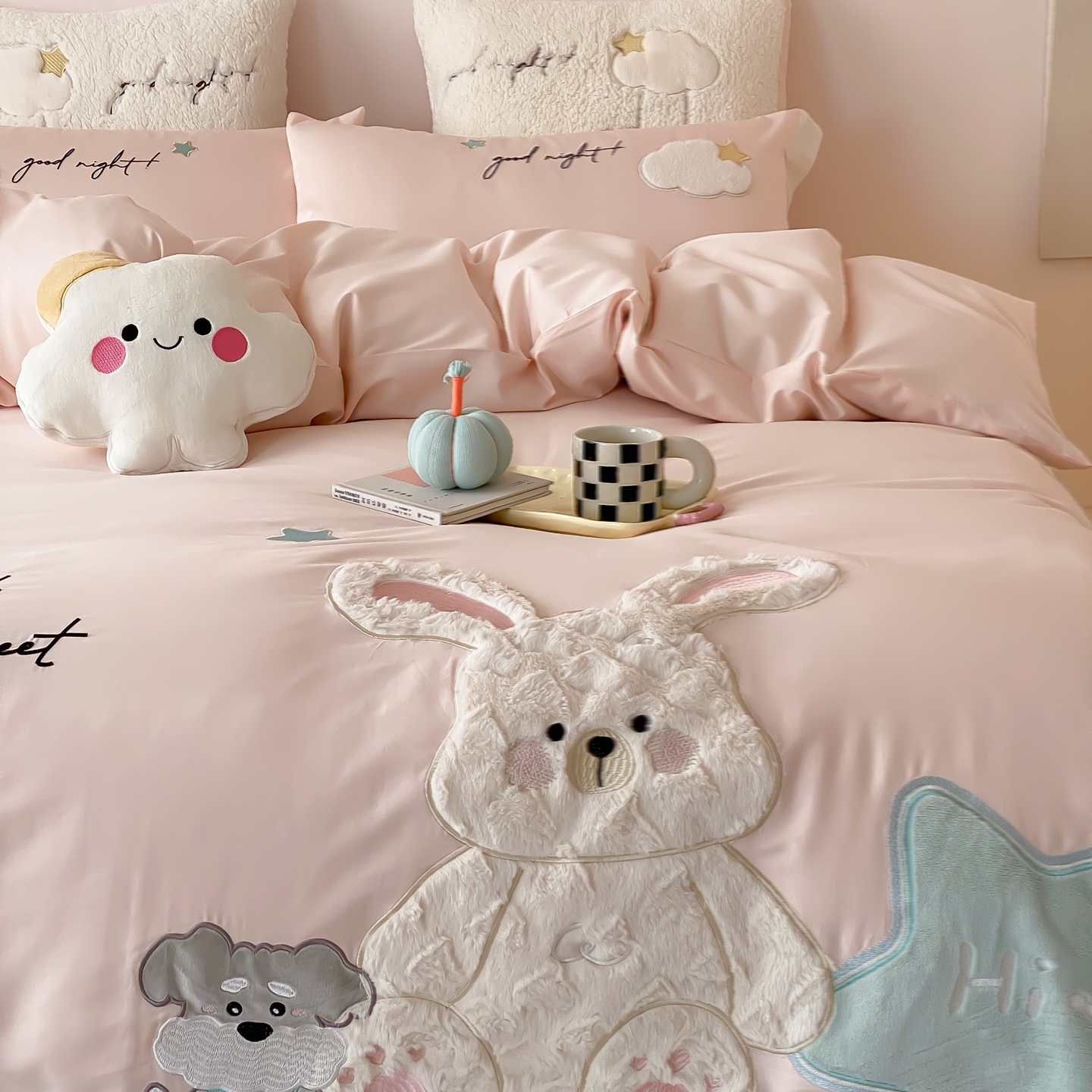 (总)星野 2025新款高克重牛奶绒贴布绣四件套-波点兔,波点兔