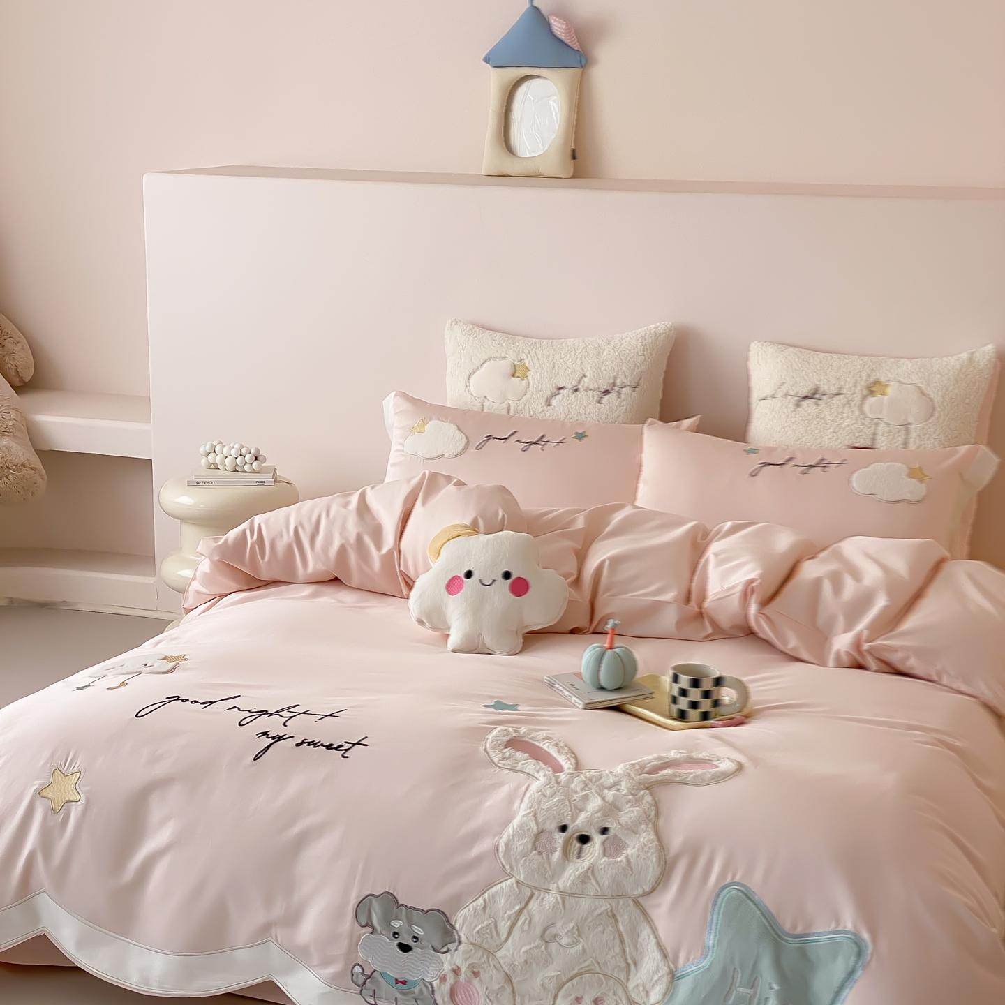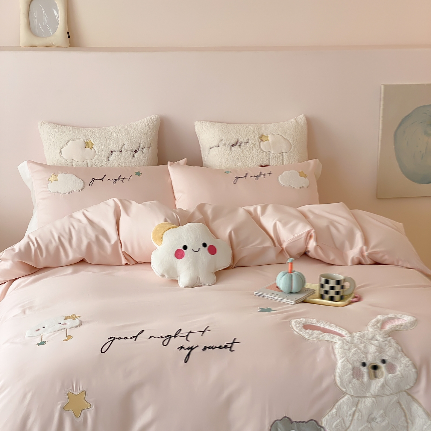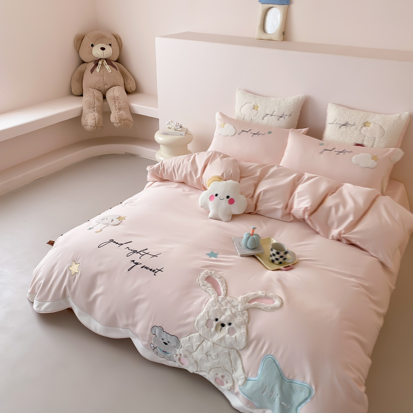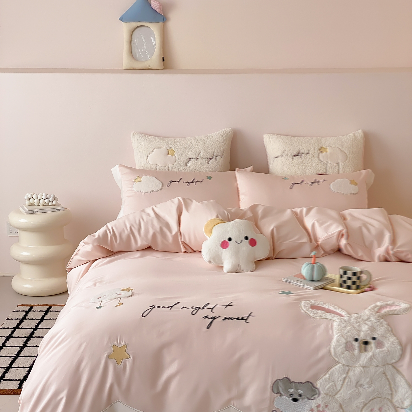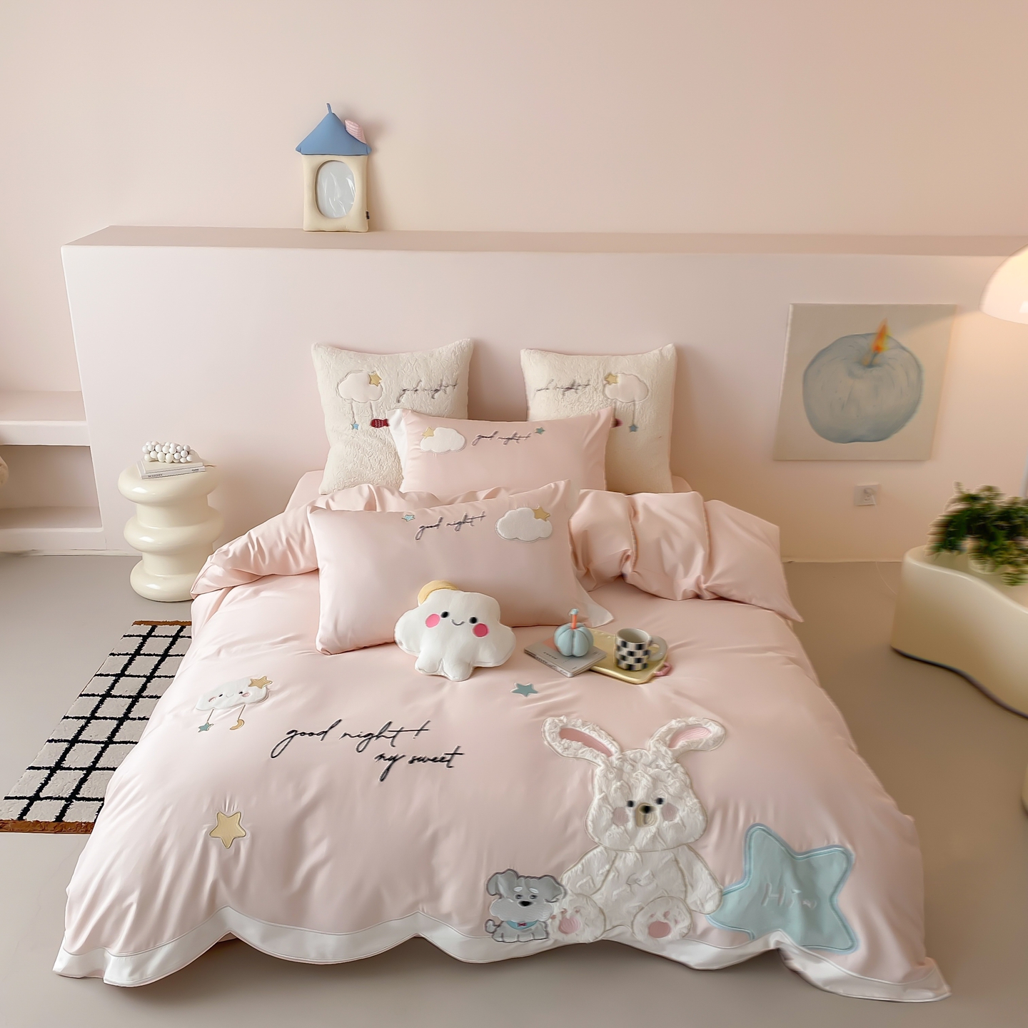 (总)星野 2025新款高克重牛奶绒贴布绣四件套-波点兔,波点兔
