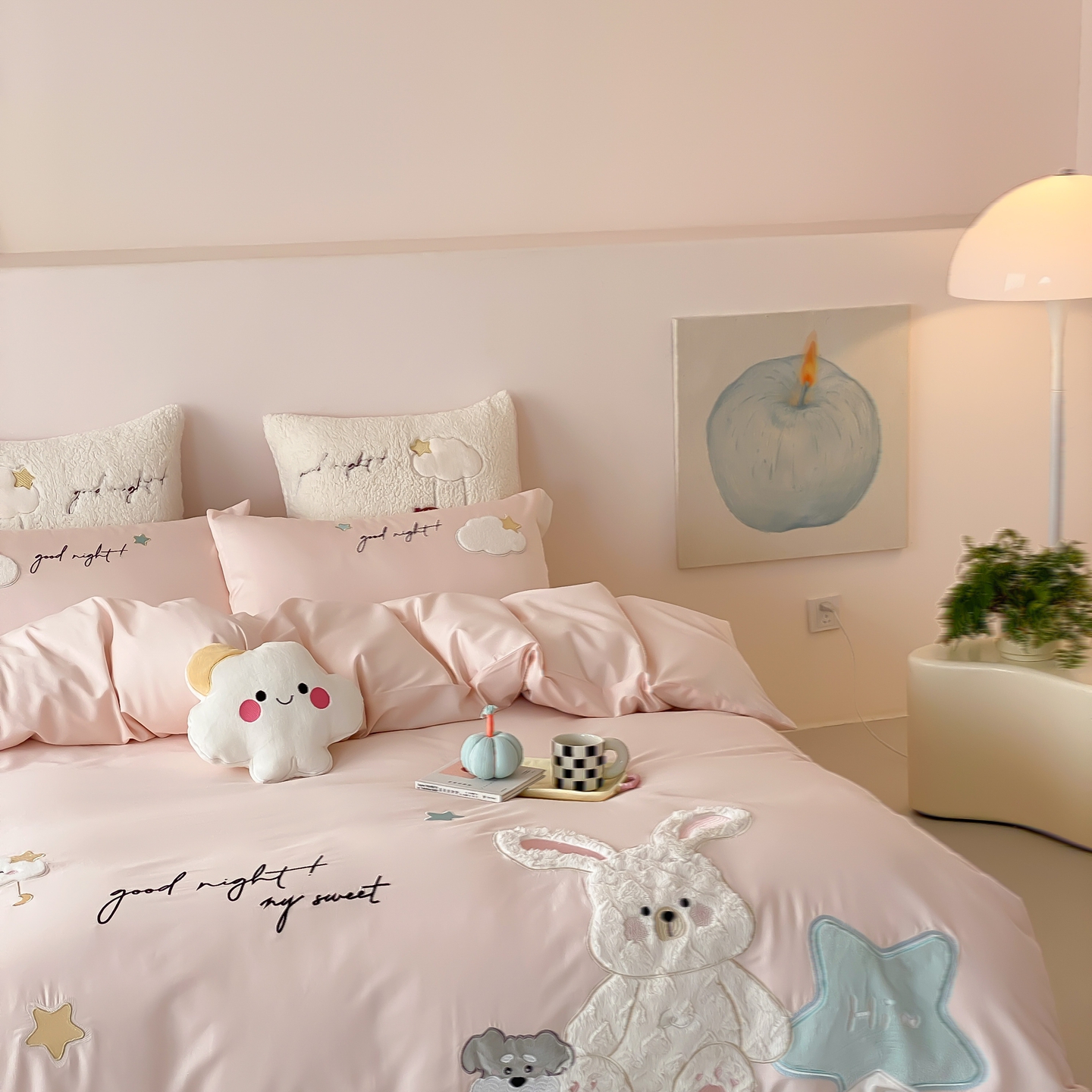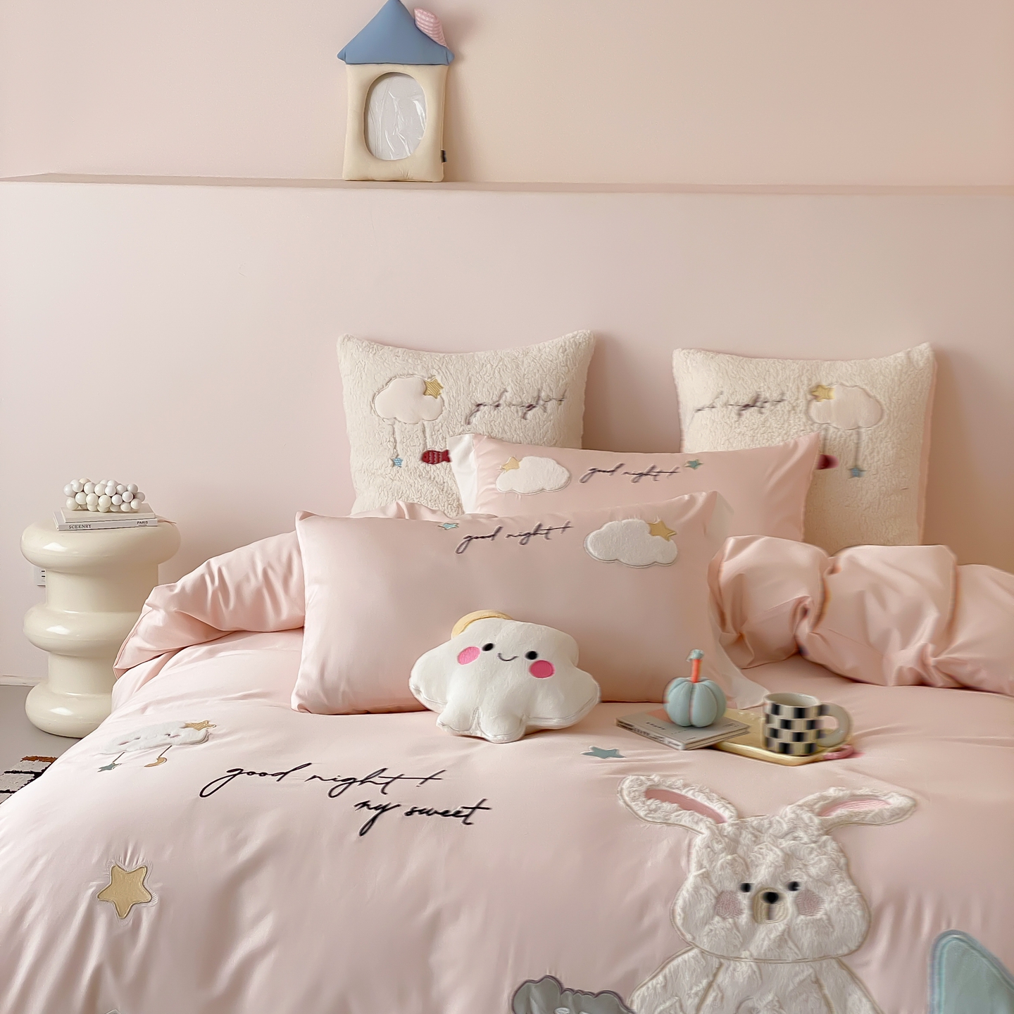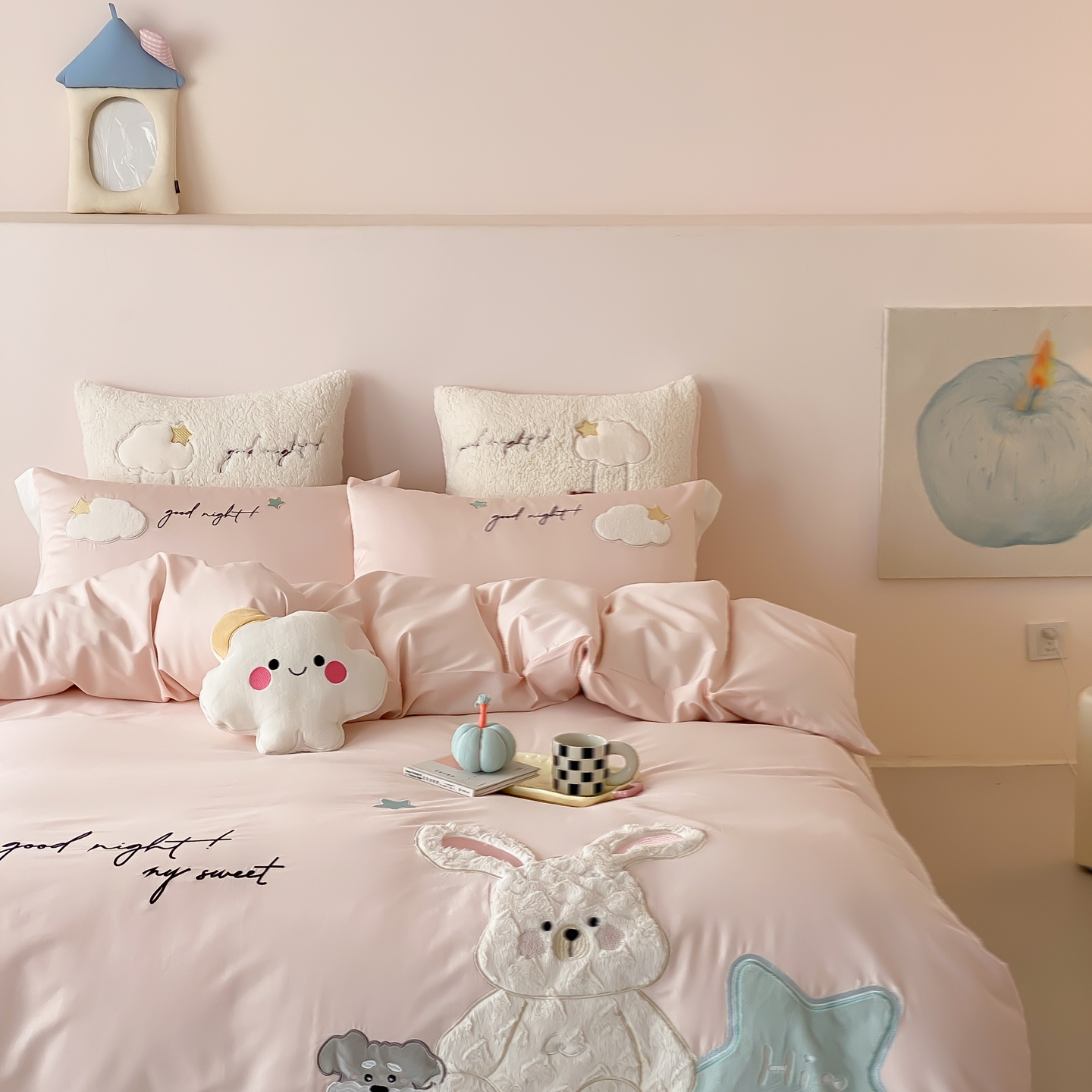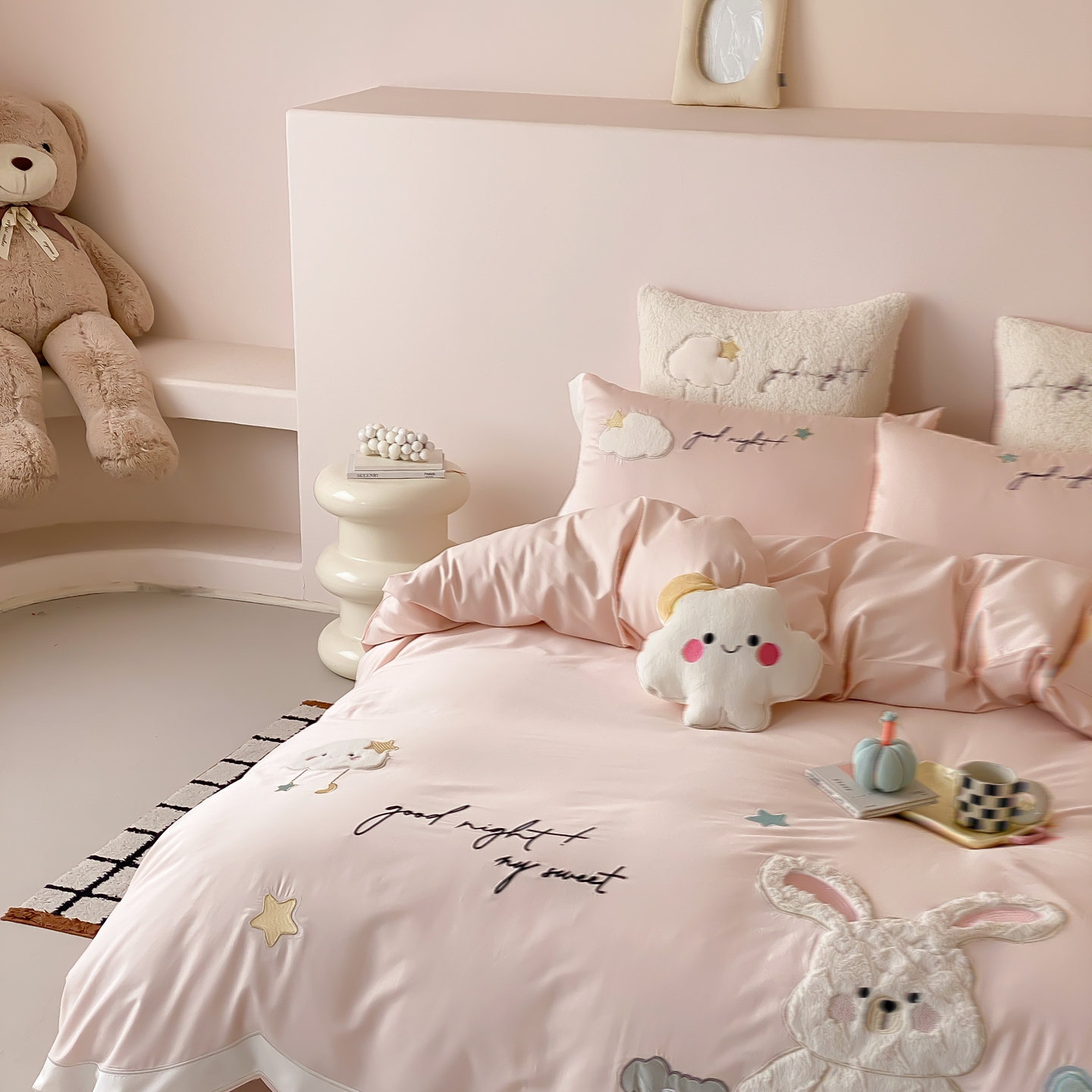 (总)星野 2025新款高克重牛奶绒贴布绣四件套-波点兔,波点兔