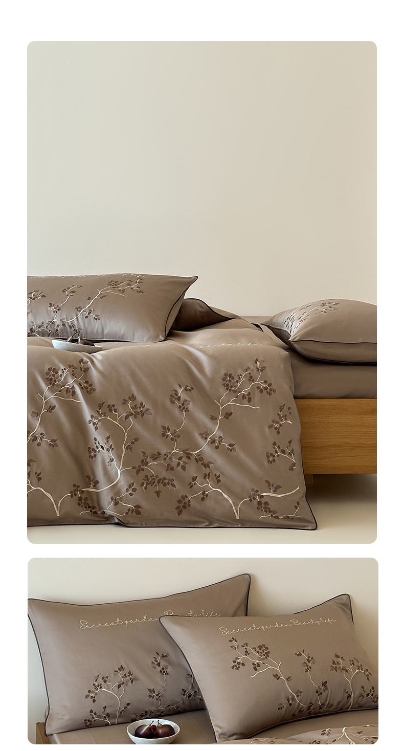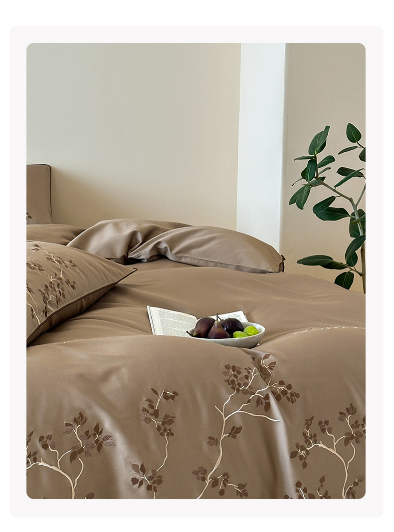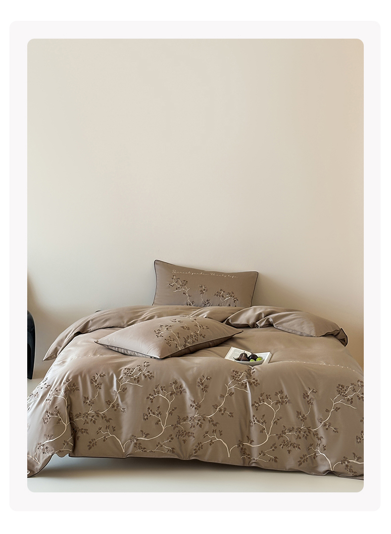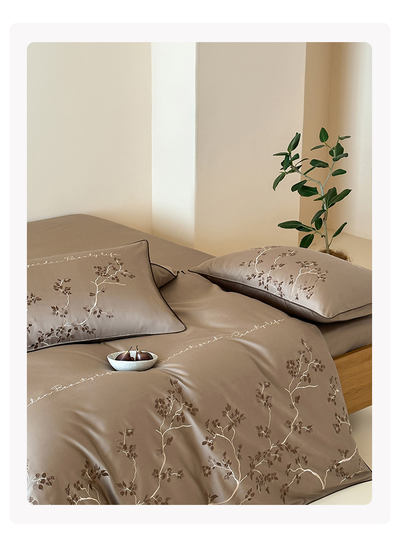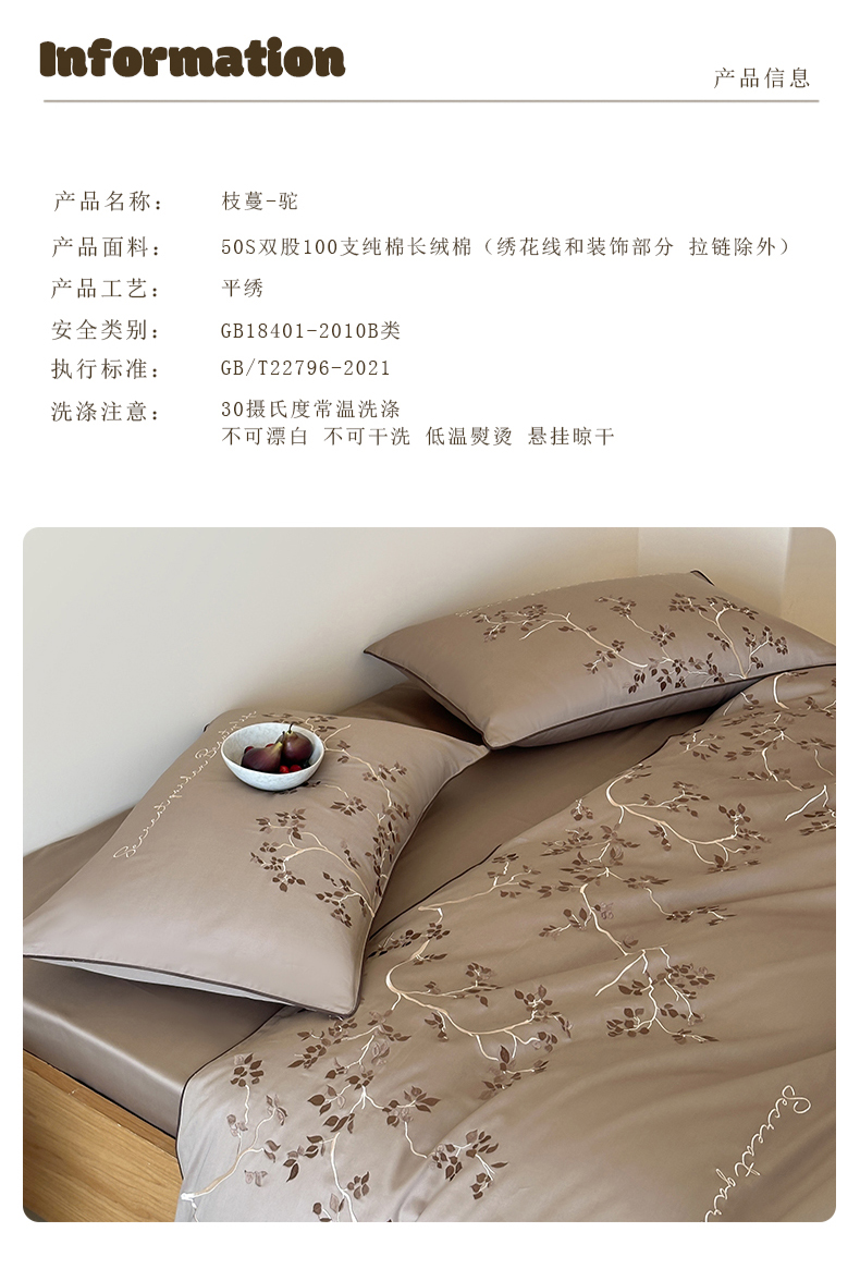 商品名称:波比可可 2026春夏新款100支50s双股长绒棉纯棉全棉居家轻奢刺绣四件套 枝蔓 驼