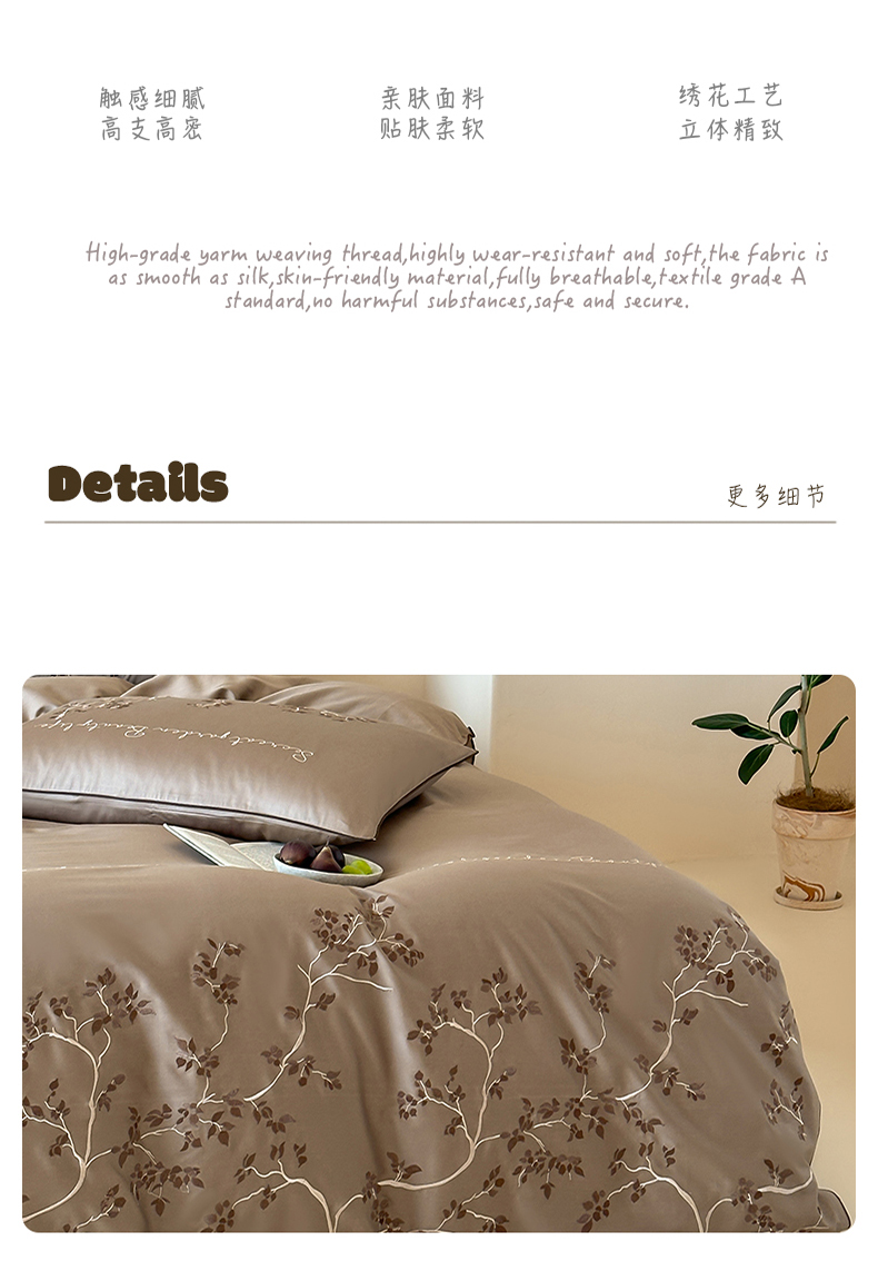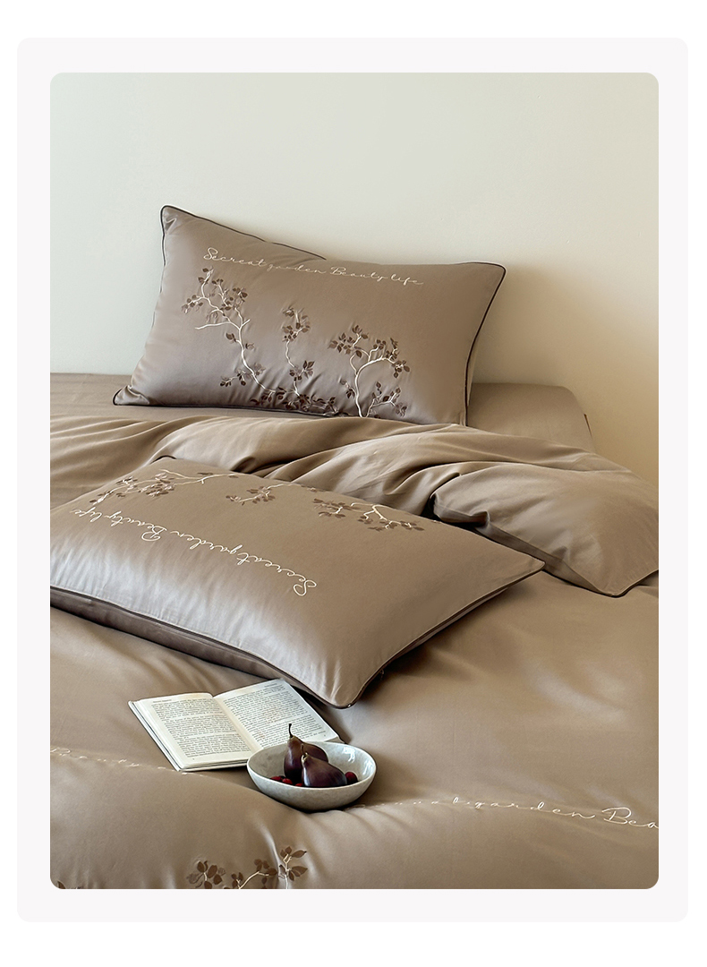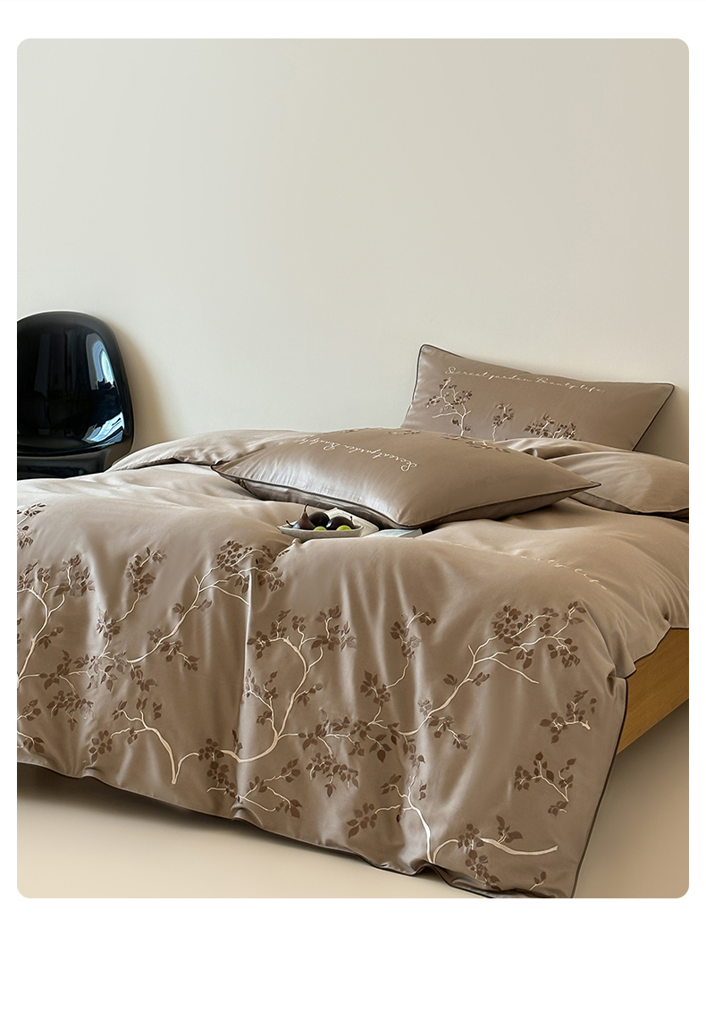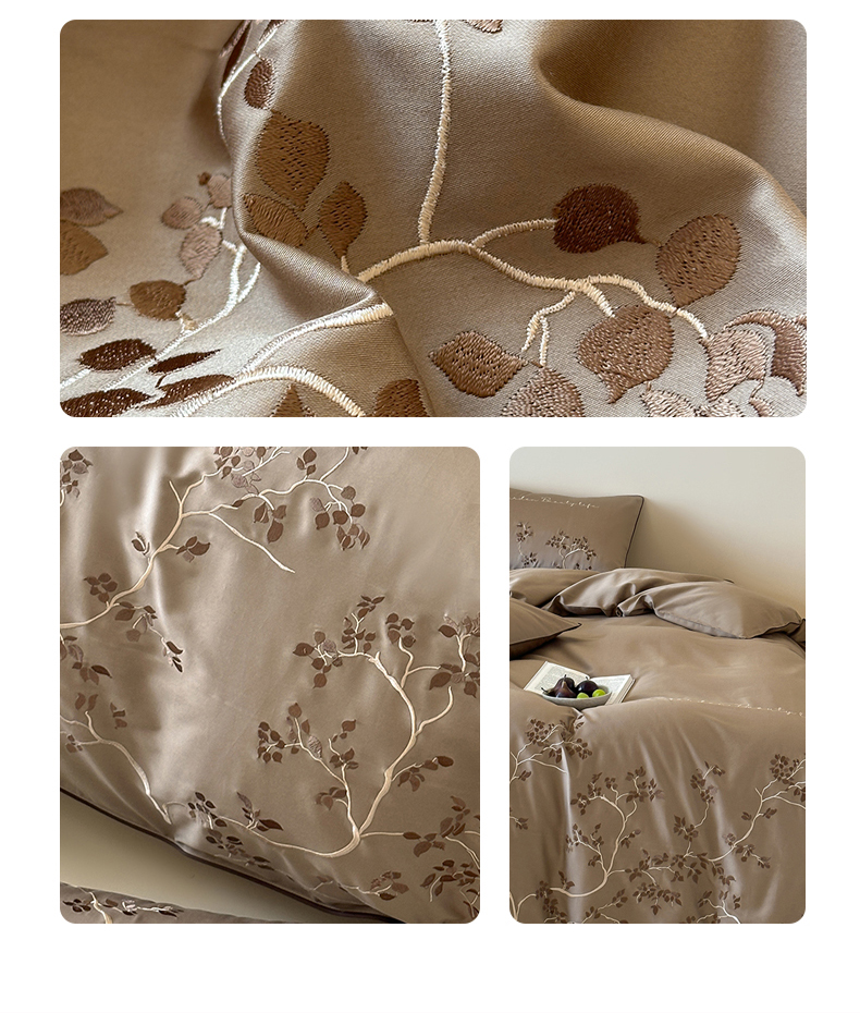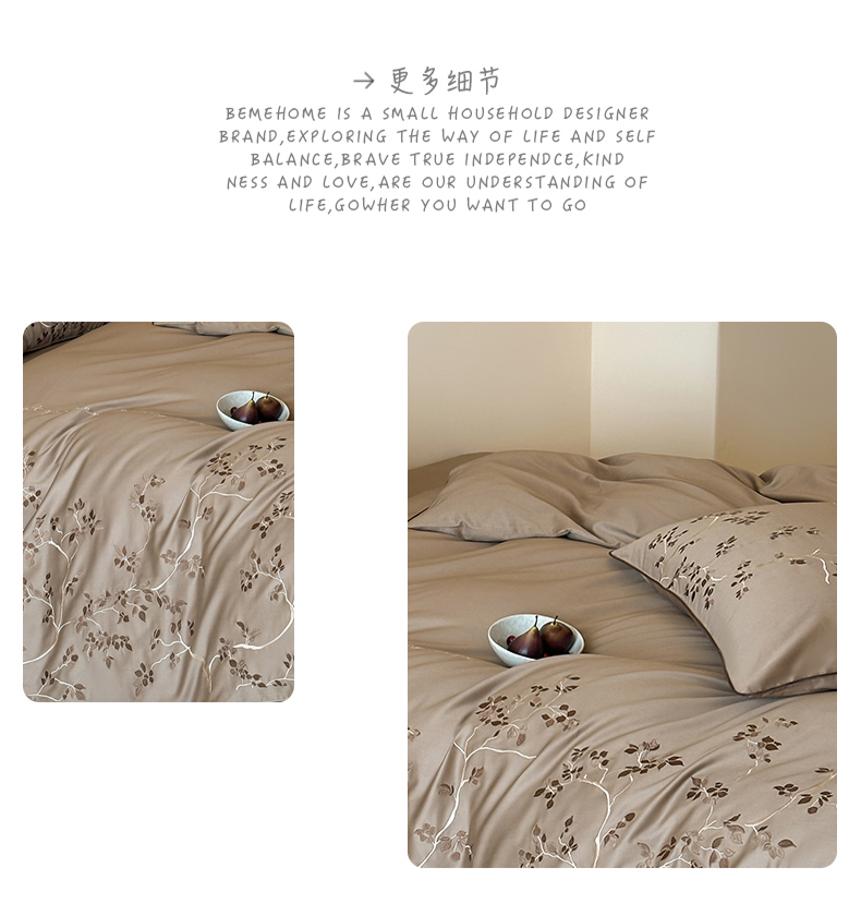 商品名称:波比可可 2026春夏新款100支50s双股长绒棉纯棉全棉居家轻奢刺绣四件套 枝蔓 驼