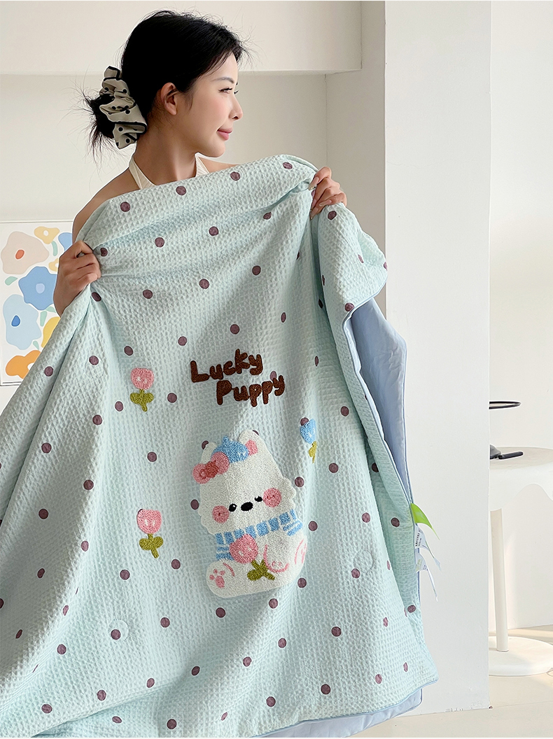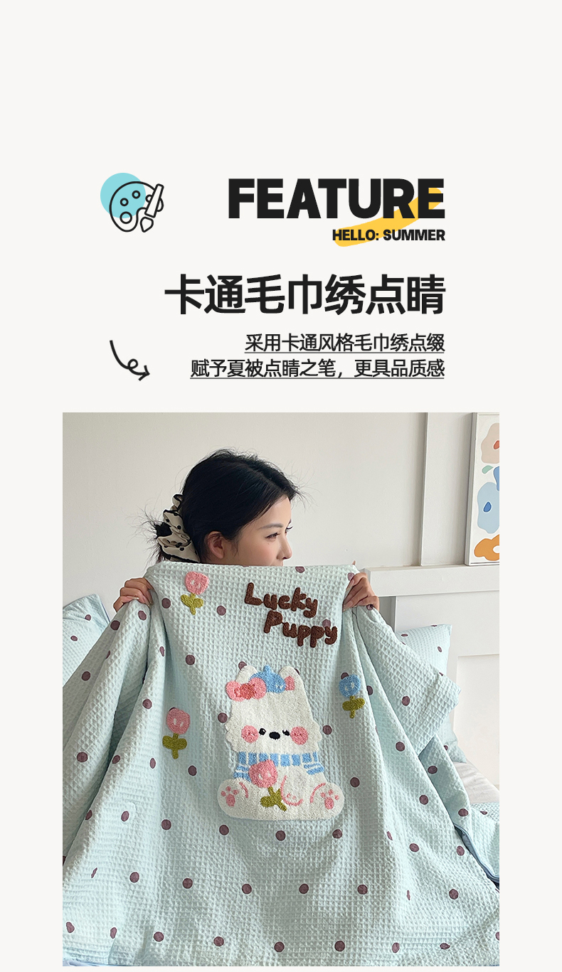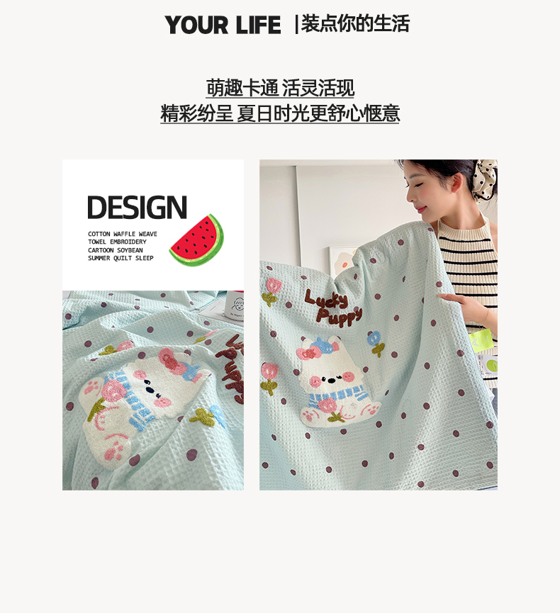商品名称:莱宁被业 2026新款A类全棉华夫格提花毛巾绣卡通大豆夏被 萌宠西高地