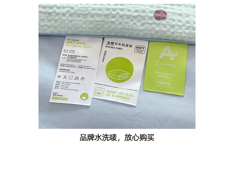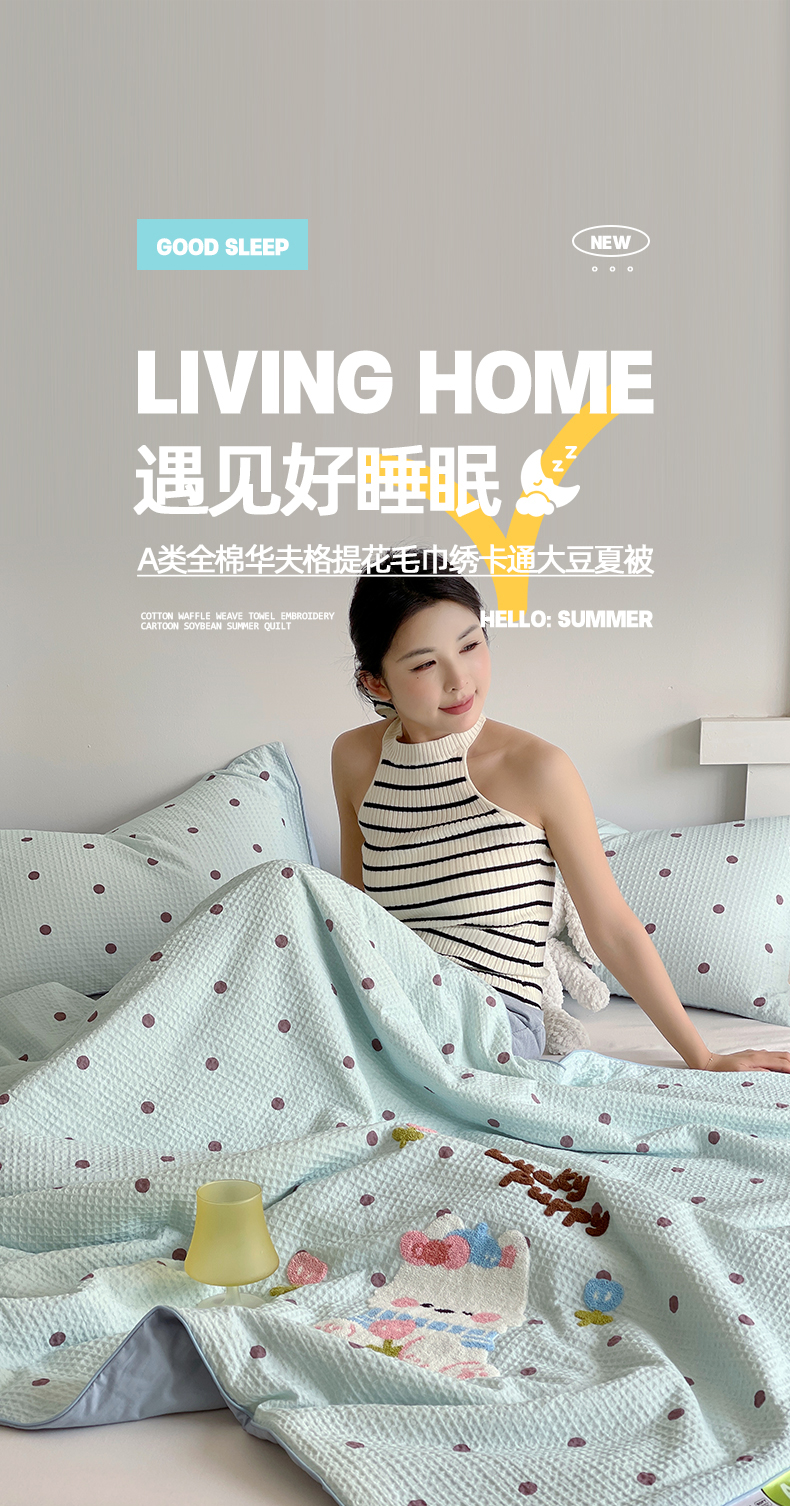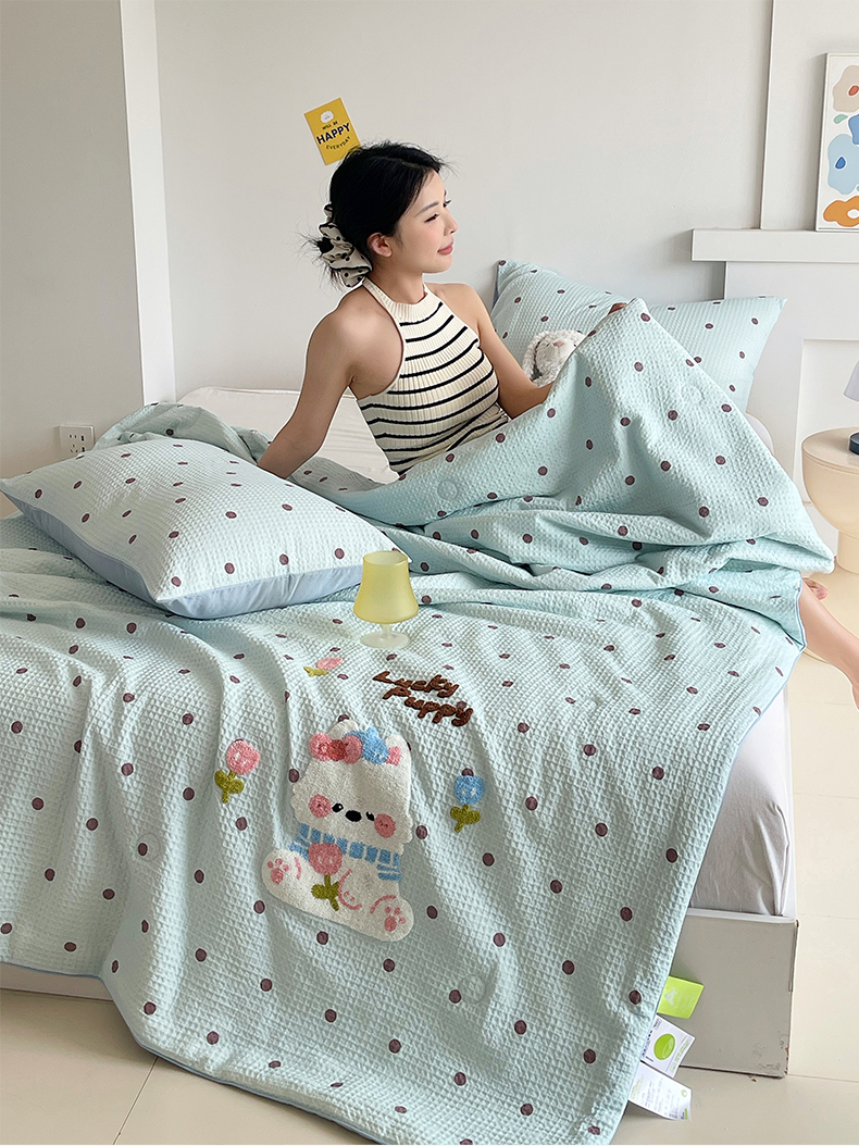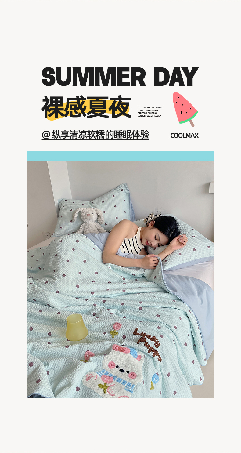 商品名称:莱宁被业 2026新款A类全棉华夫格提花毛巾绣卡通大豆夏被 萌宠西高地