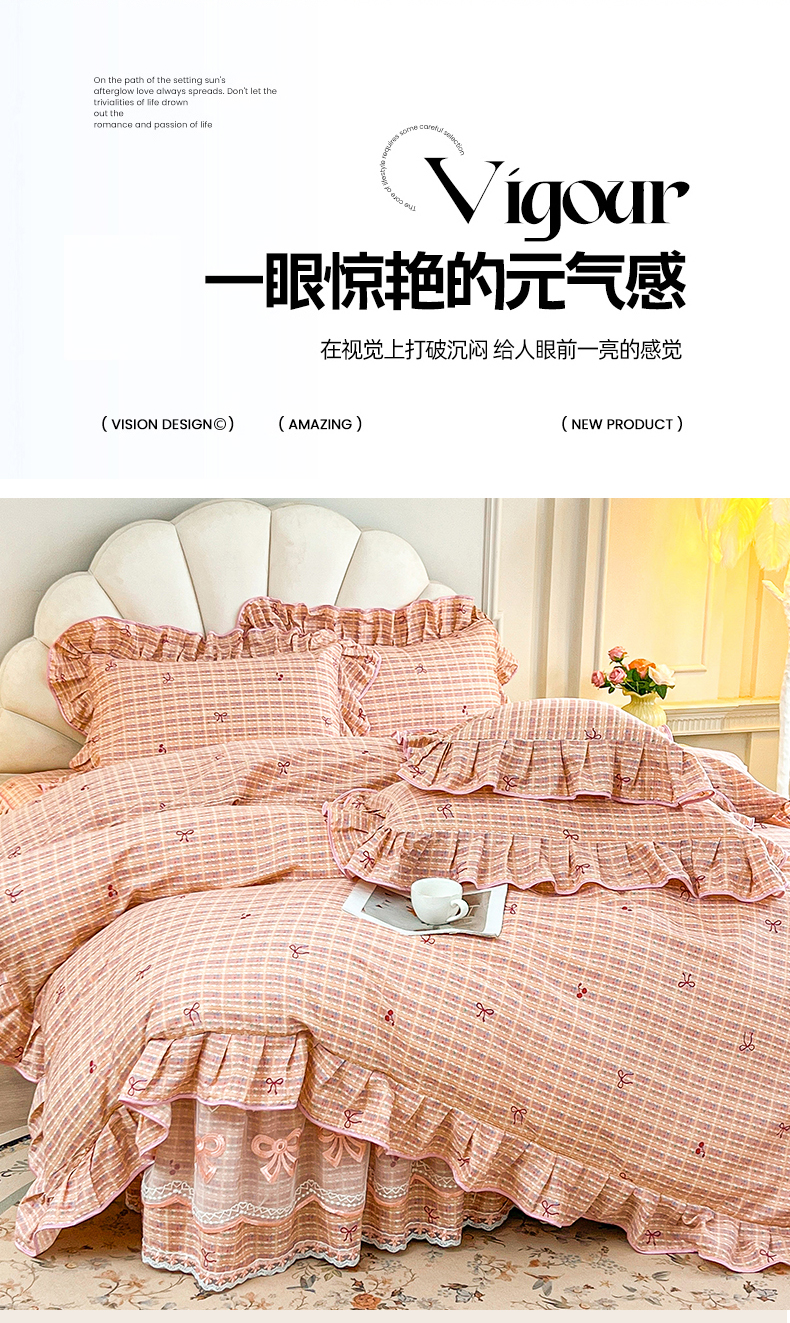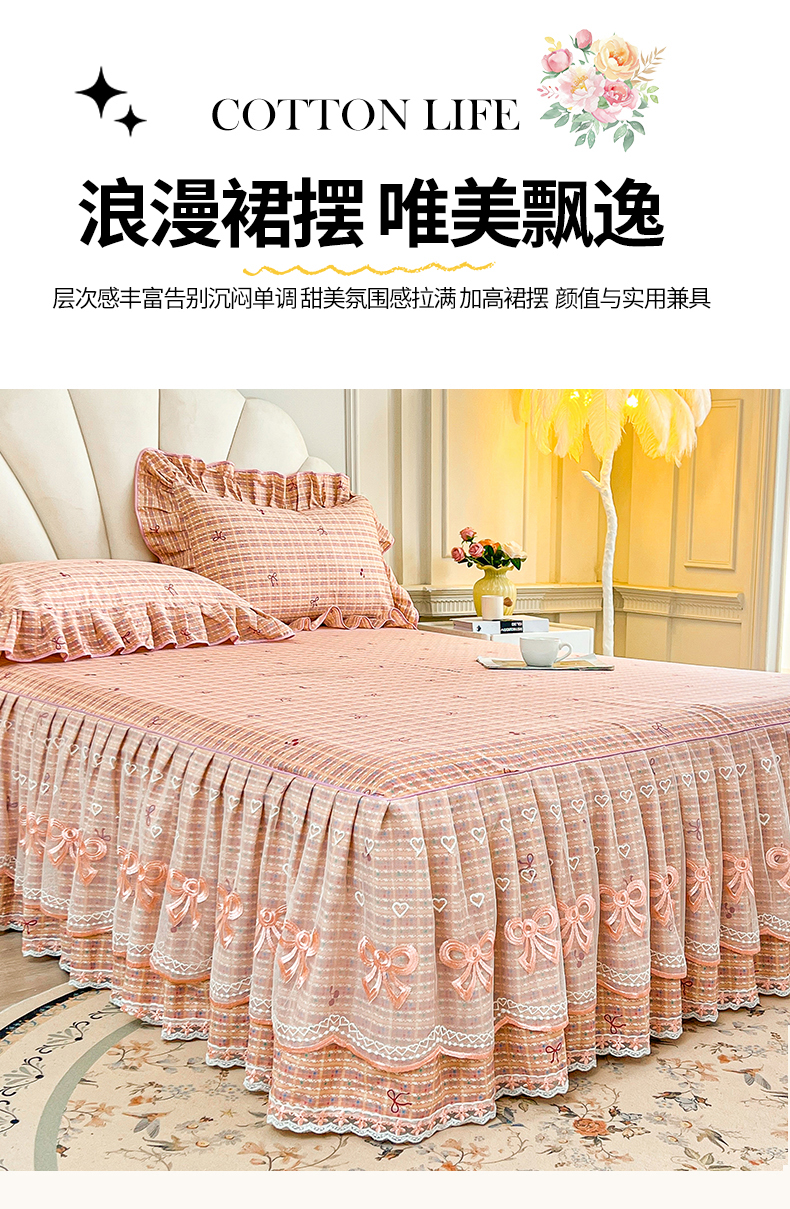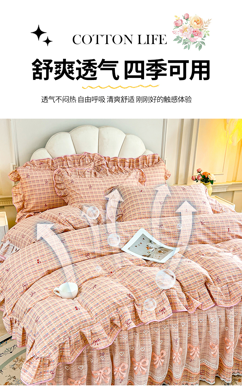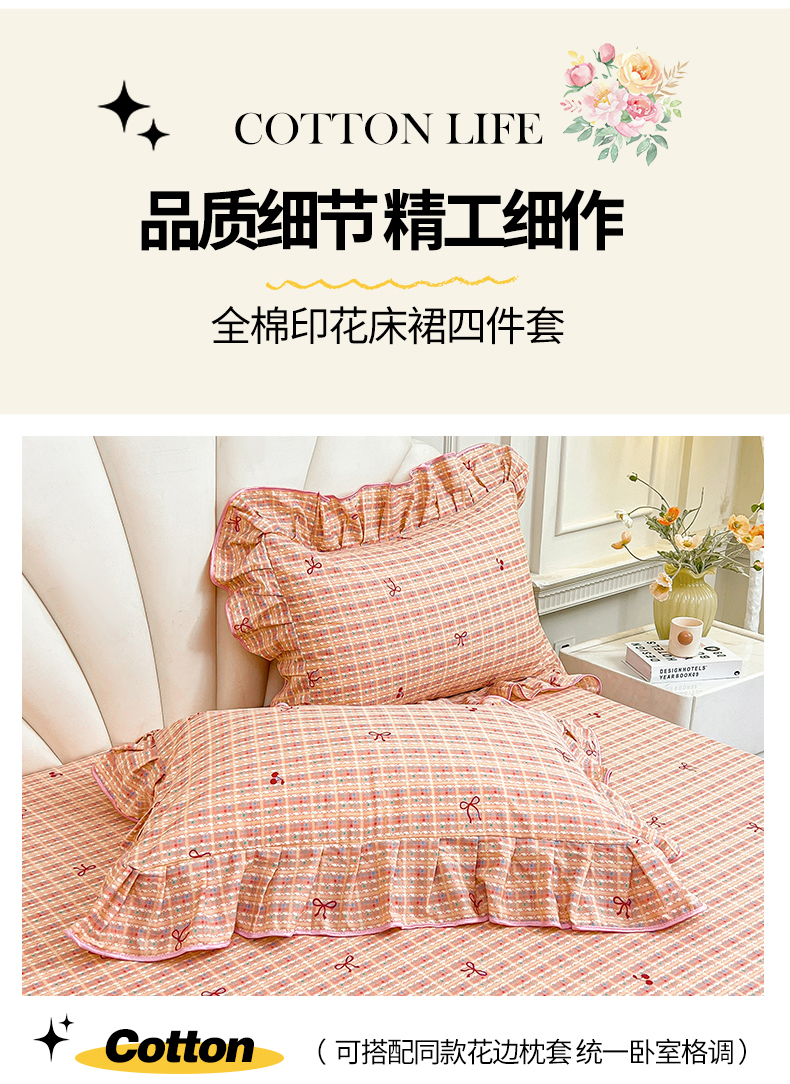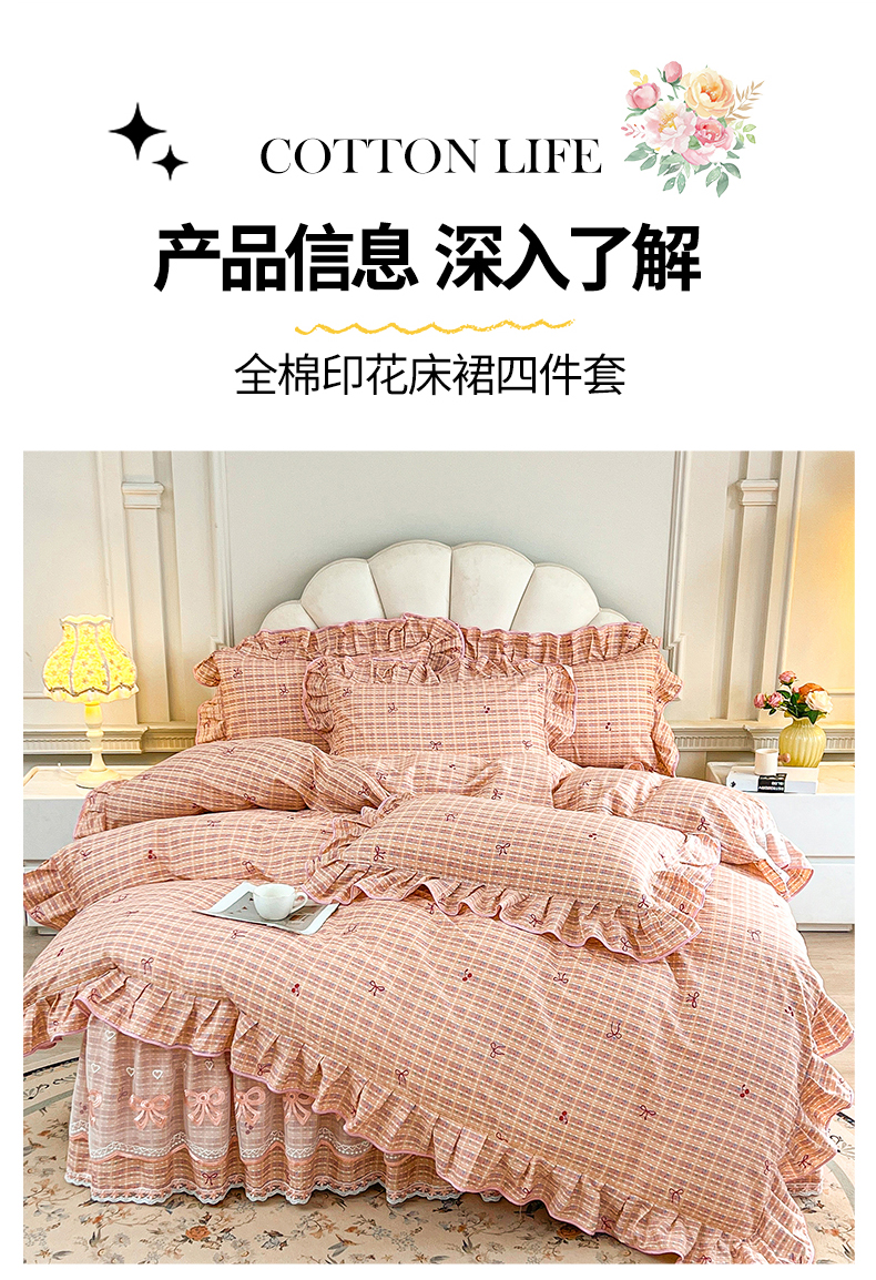 当前位置: 91家纺网 > 商品网购 > 床品套件 > 四件套 > 全棉普通四件套 > 宜凡家纺 2026新款全棉公主风单层床裙四件套② 樱桃蝴蝶结