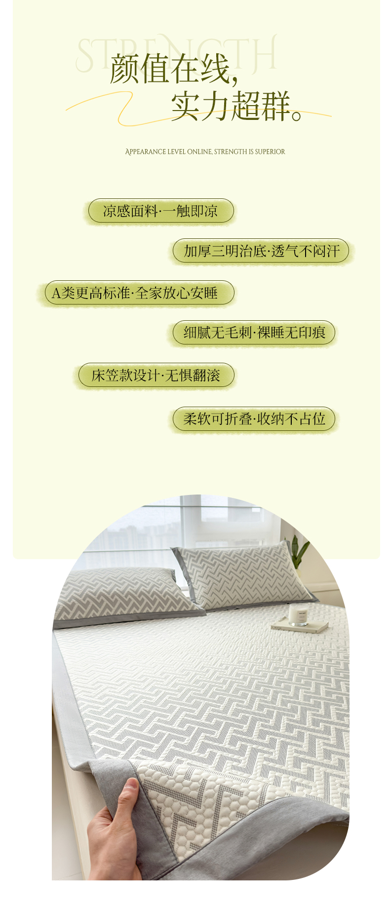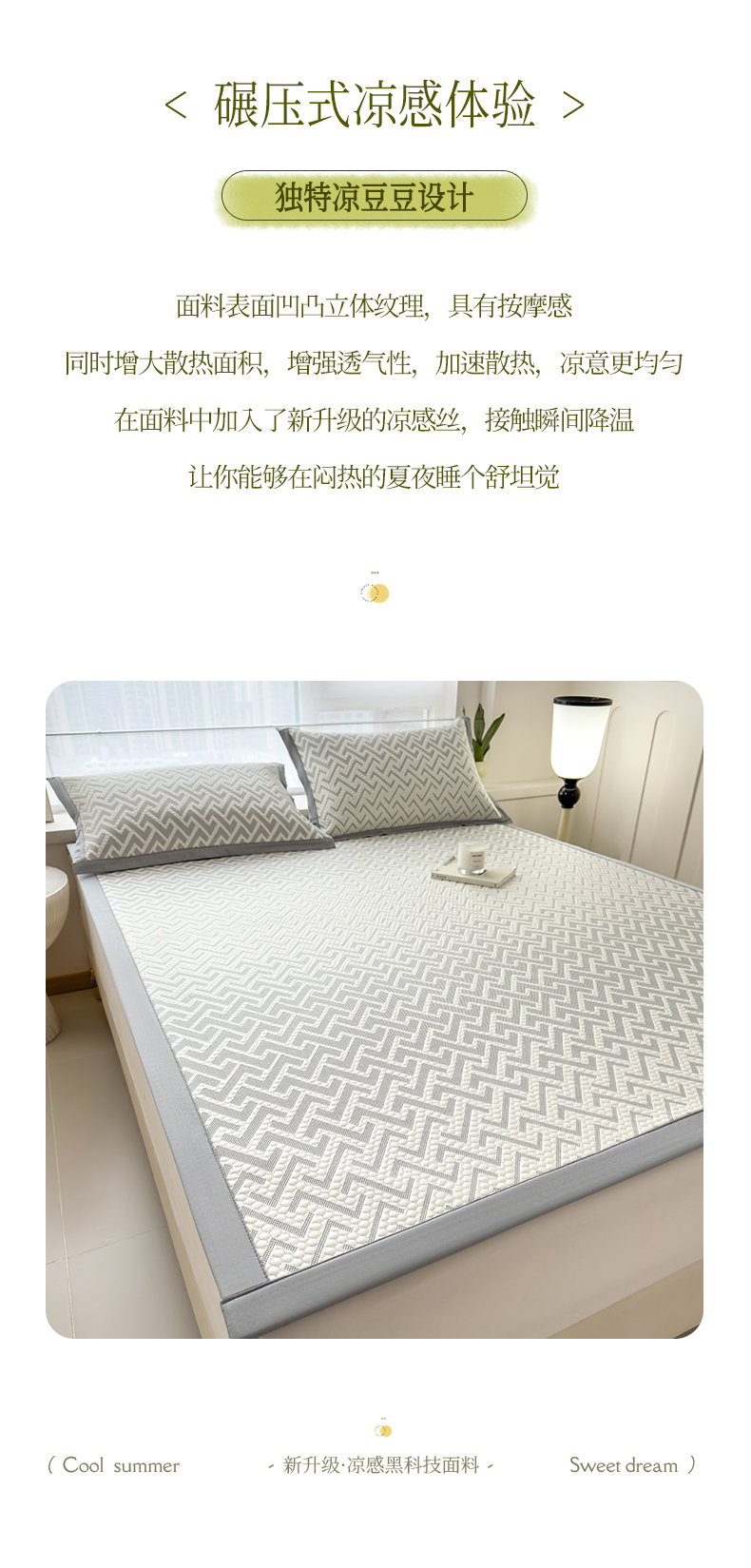 (总)倾慕家纺 2026春夏新款全PE冰豆豆全包围床笠款凉席席子,箭纹粉,箭纹灰,箭纹卡其,箭纹蓝,箭纹绿,箭纹米白,菱形泡粉,菱形泡灰,菱形泡蓝,菱形泡绿,菱形泡米白,菱形泡香槟