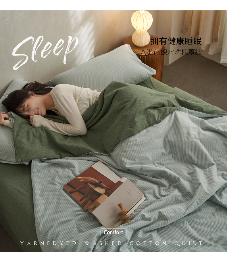 千朵森 2026新款A类全棉色织水洗棉夏被夏被四件套 豆绿细条纹