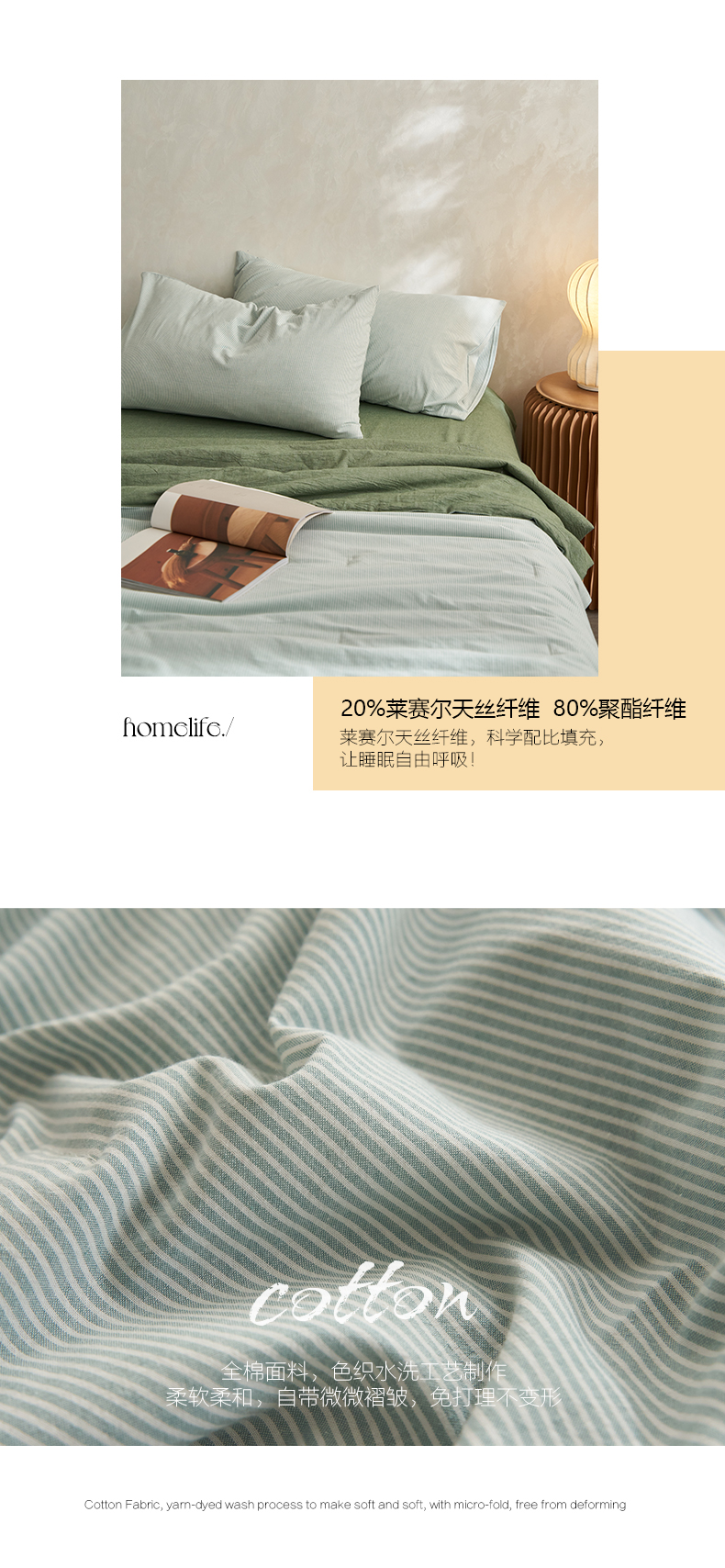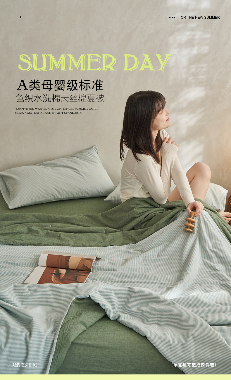 商品名称:千朵森 2026新款A类全棉色织水洗棉夏被夏被四件套 豆绿细条纹