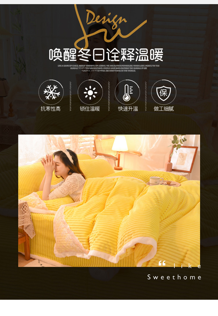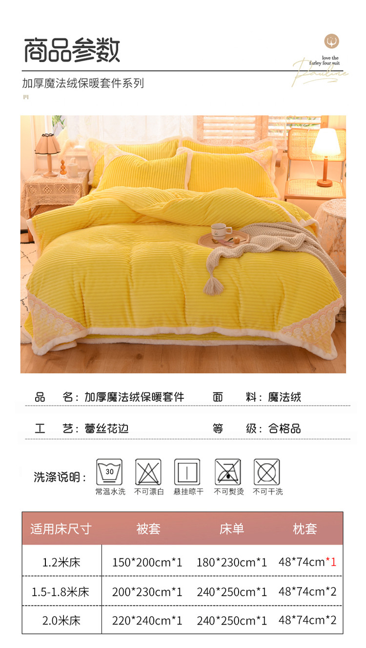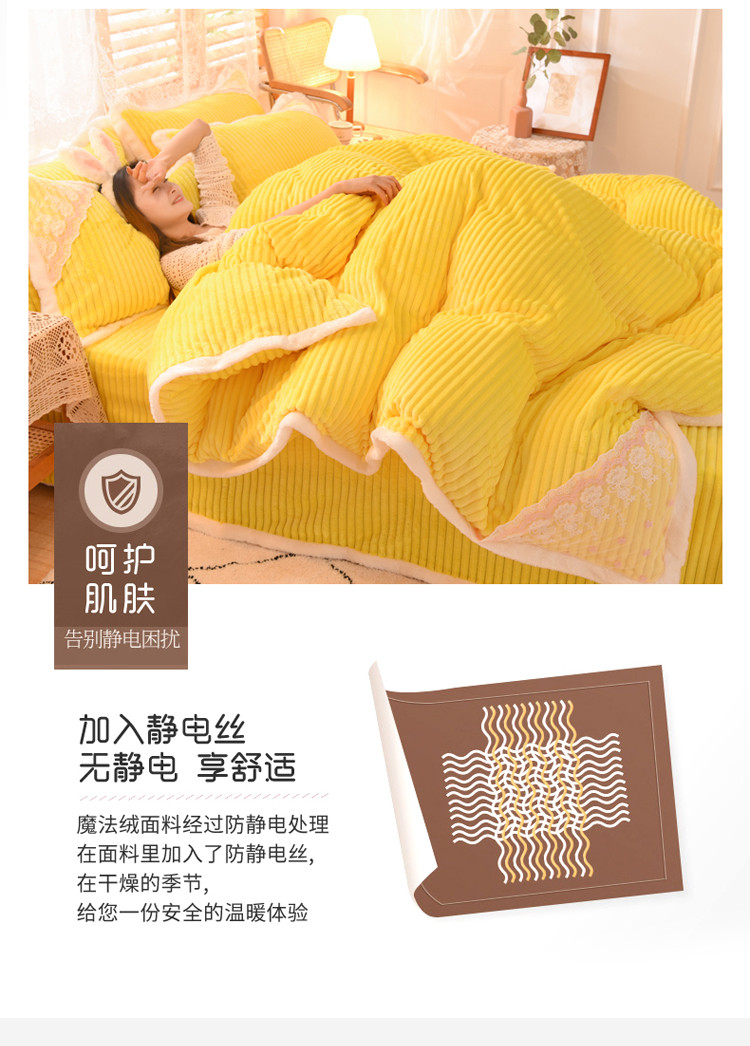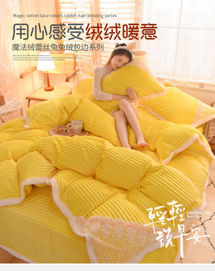 商品名称:欧冠 2020双面魔法绒兔兔绒蕾丝花边四件套 柠檬黄