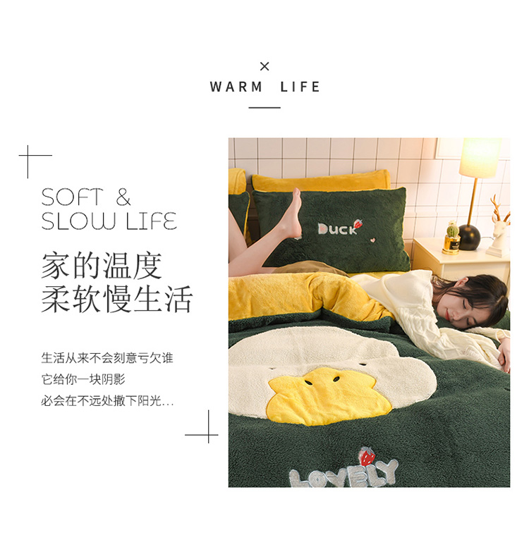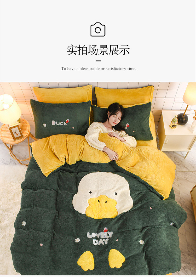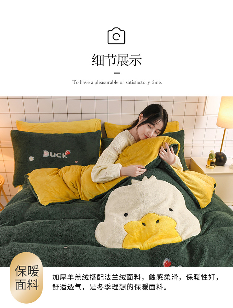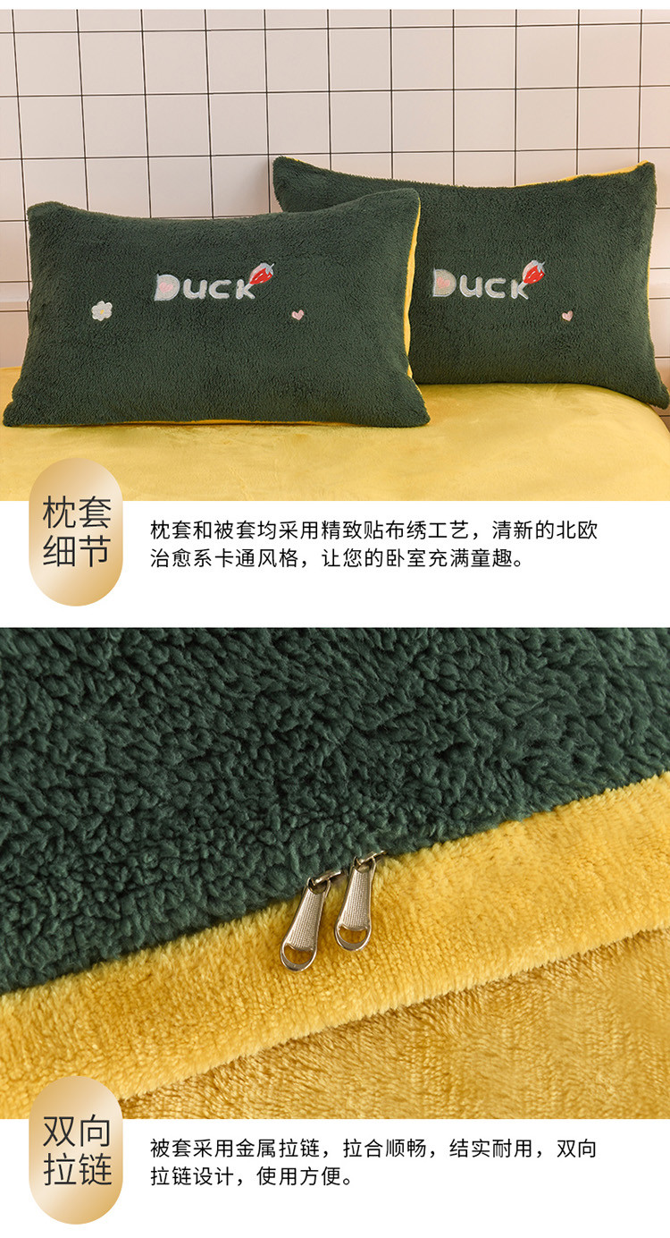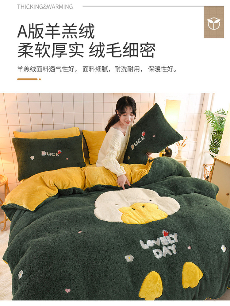 商品名称:朗莎家纺 2020新款羊羔绒法兰绒四件套 淘气鸭-墨绿