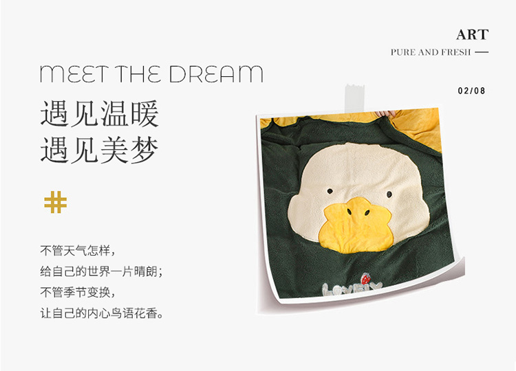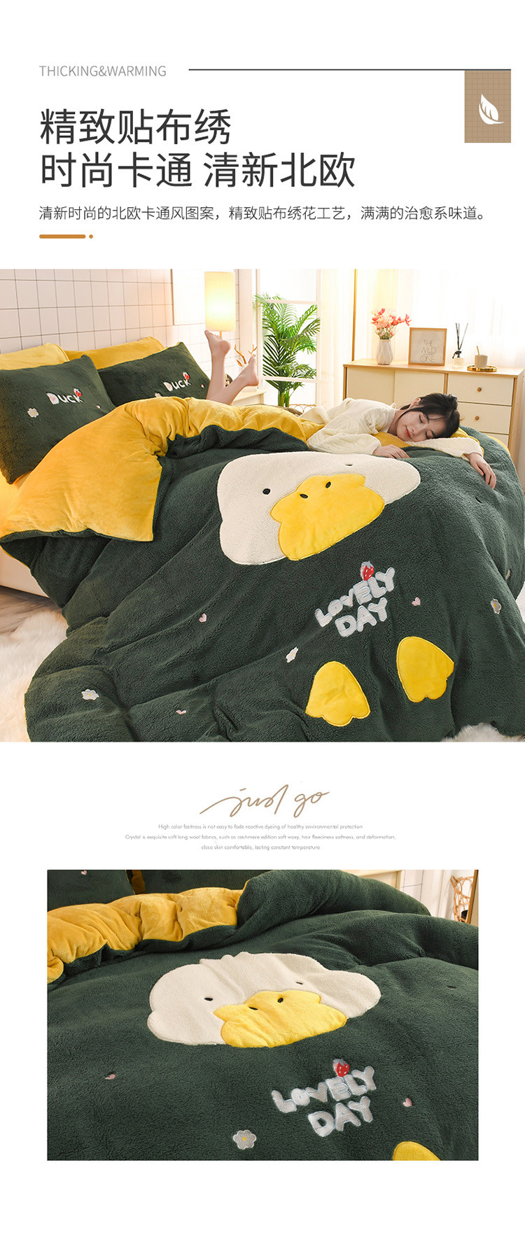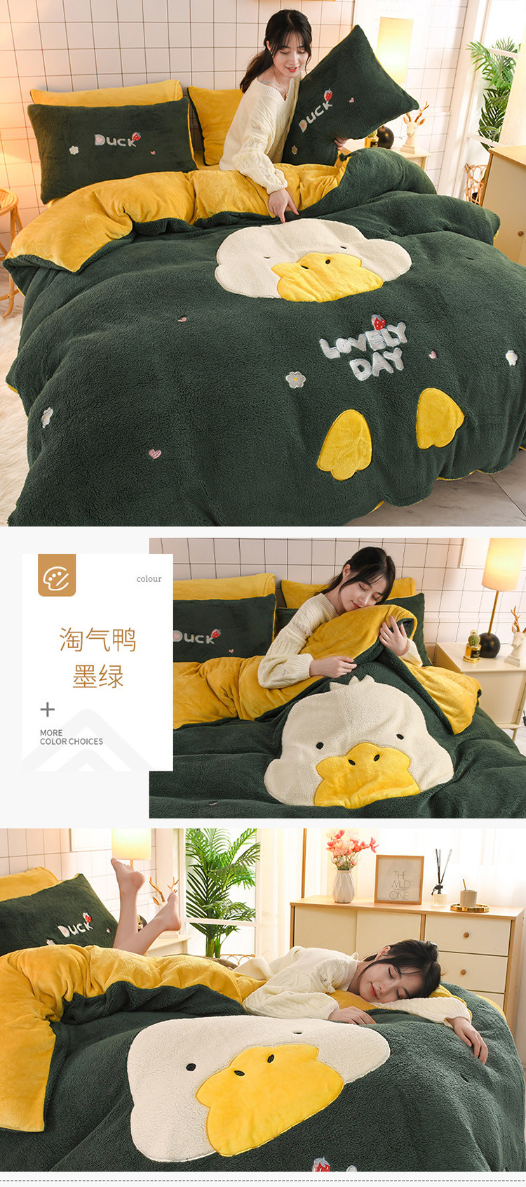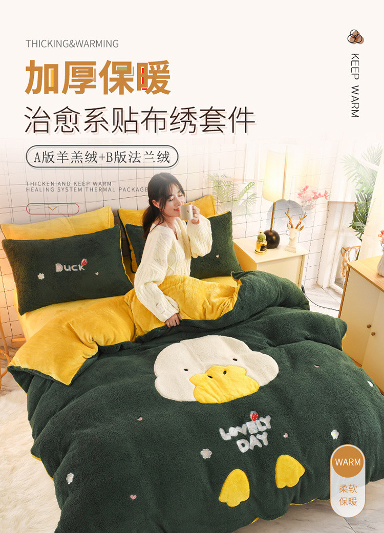 商品名称:朗莎家纺 2020新款羊羔绒法兰绒四件套 淘气鸭-墨绿