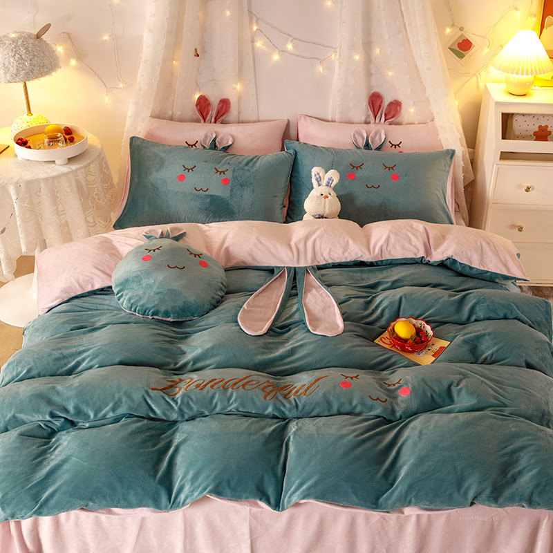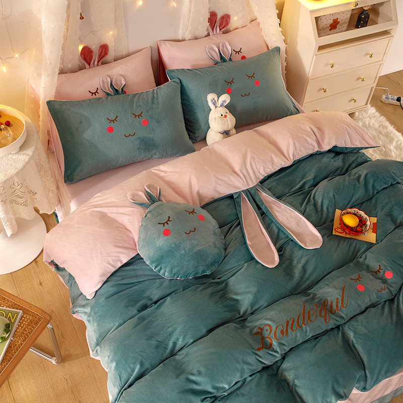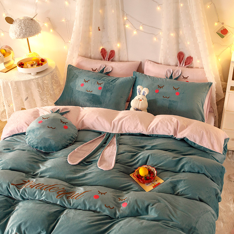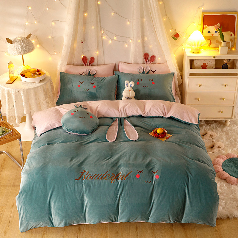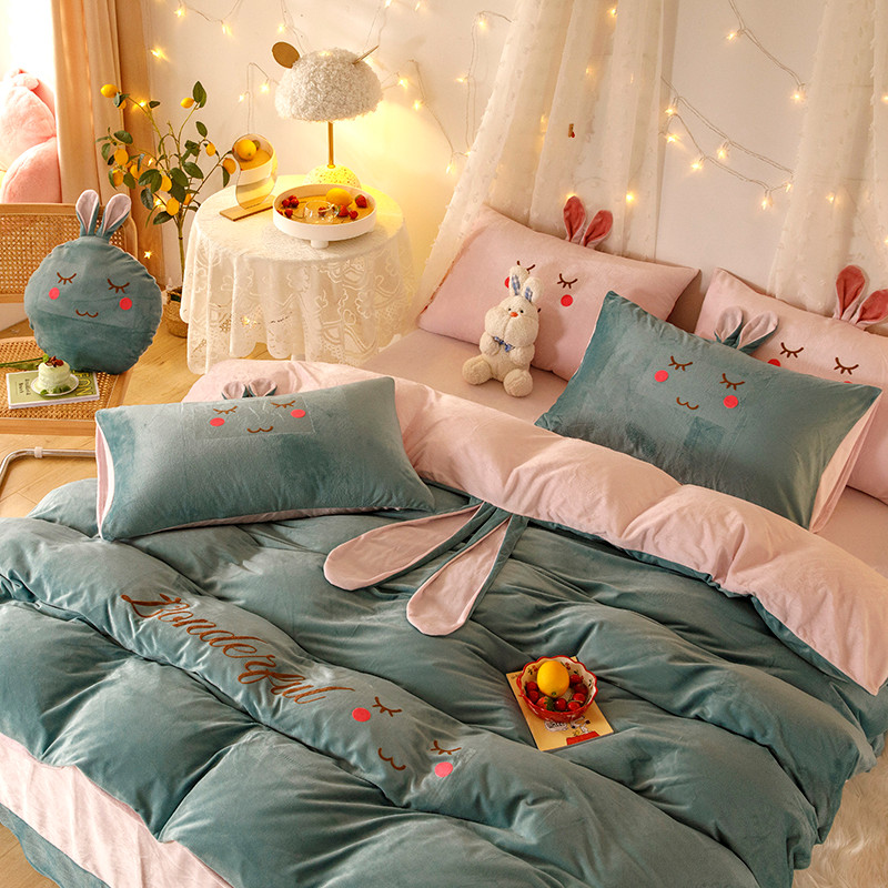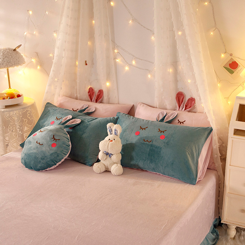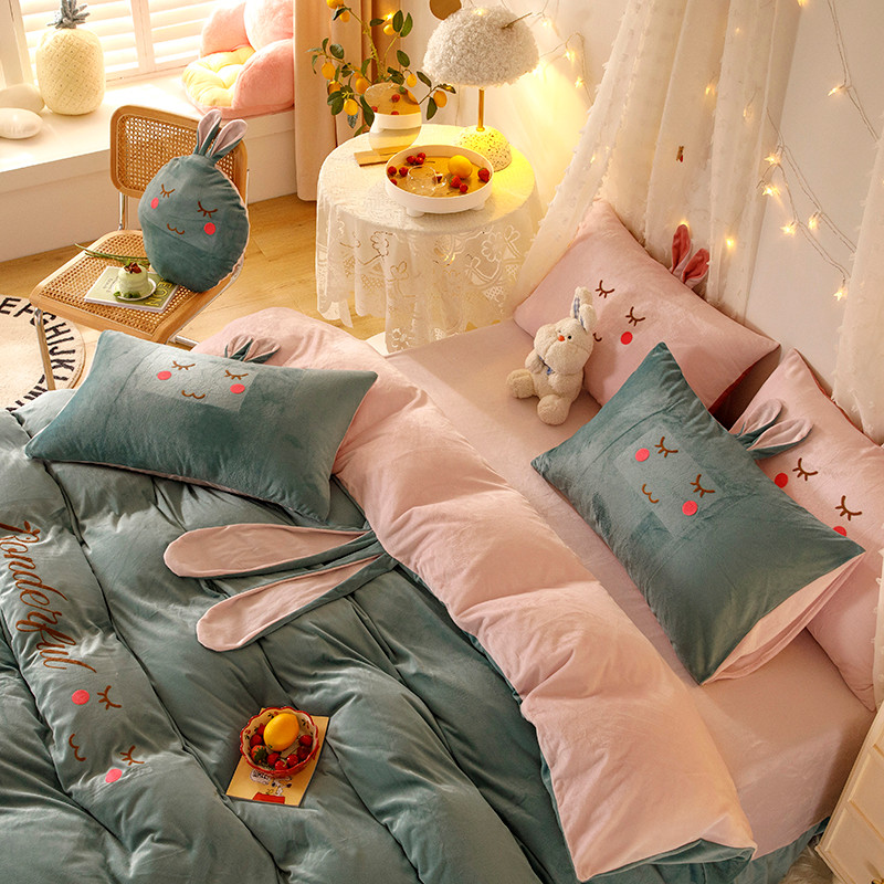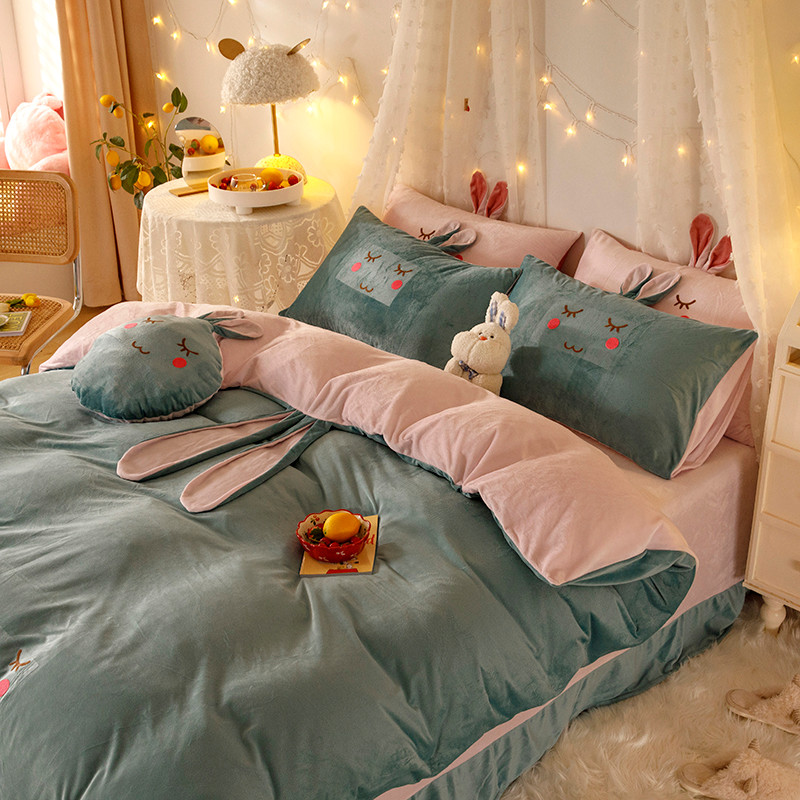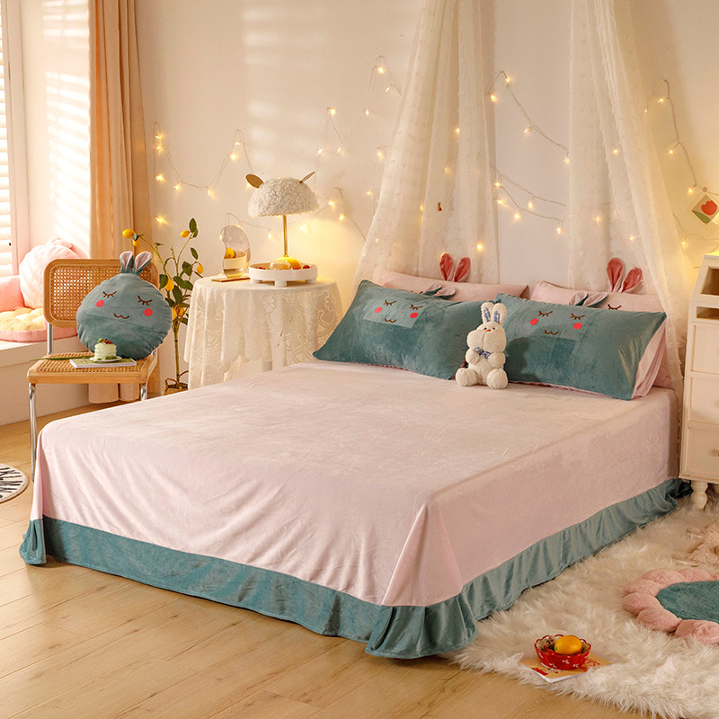 纽缦 2021新款兔耳朵水晶绒床单床笠四件套 兔子 浅绿粉