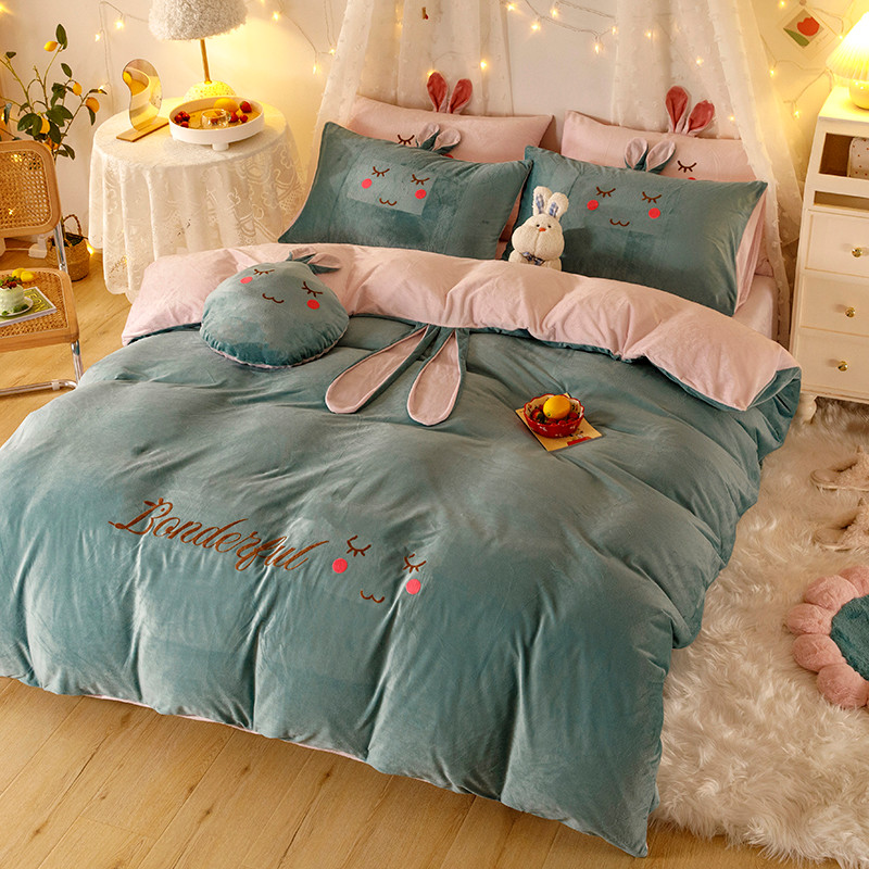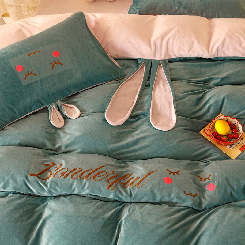 商品名称:纽缦 2021新款兔耳朵水晶绒床单床笠四件套 兔子 浅绿粉