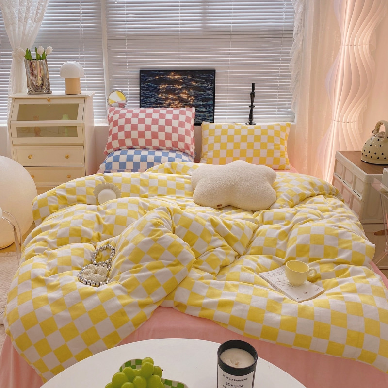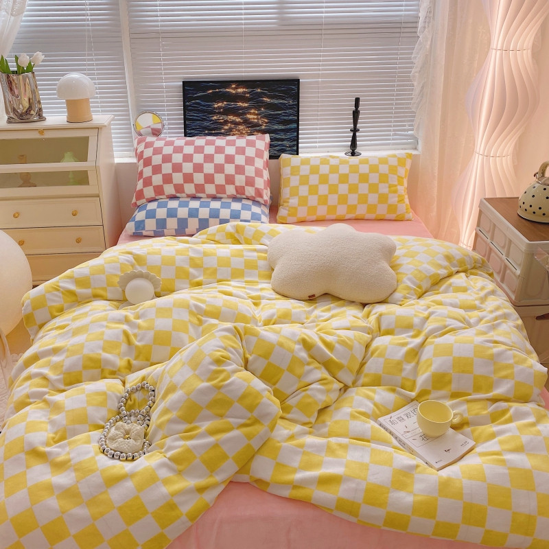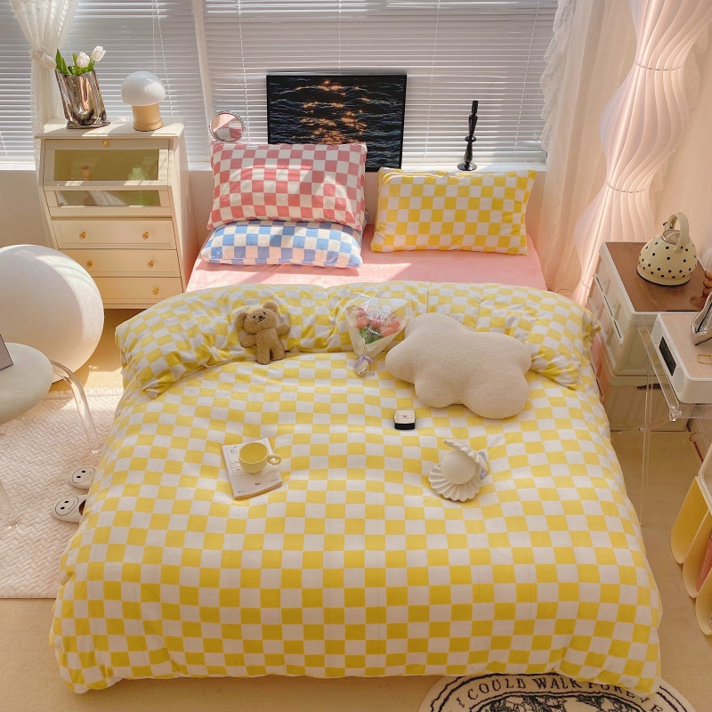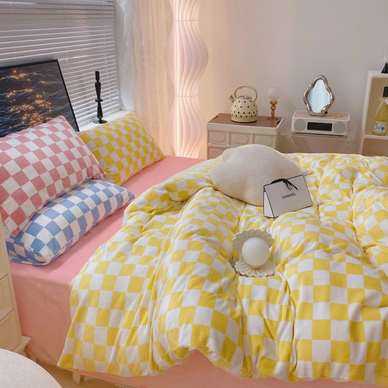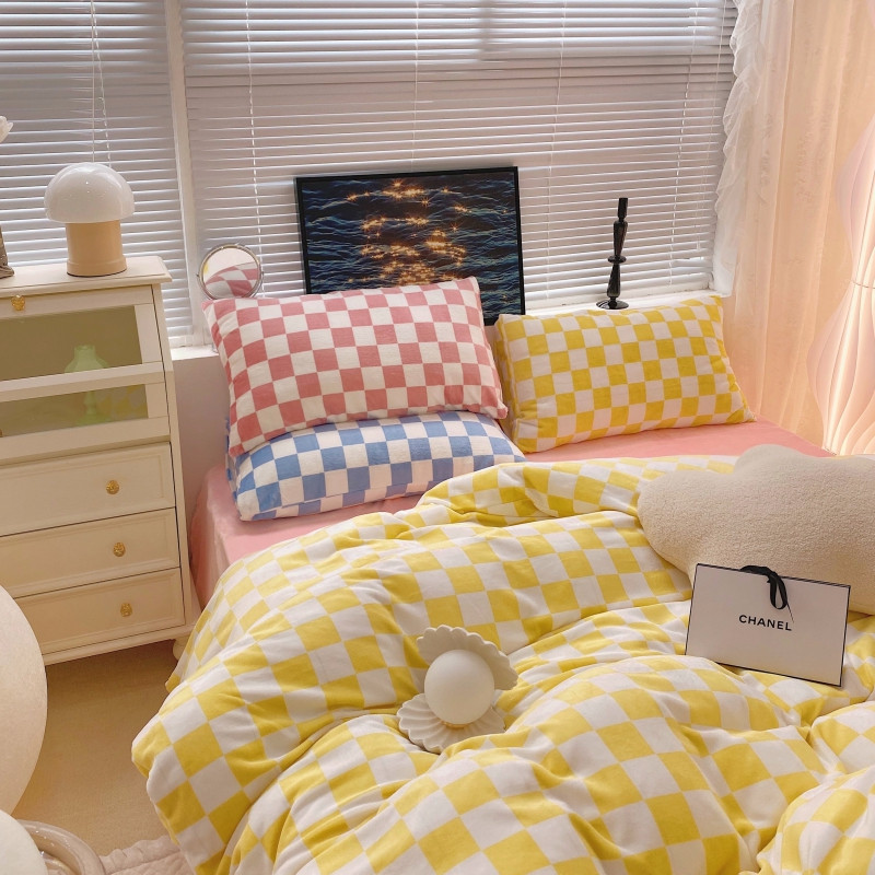 顾里家纺 2021新款韩系撞色棋盘格高克重牛奶绒四件套 芝芝粉桃