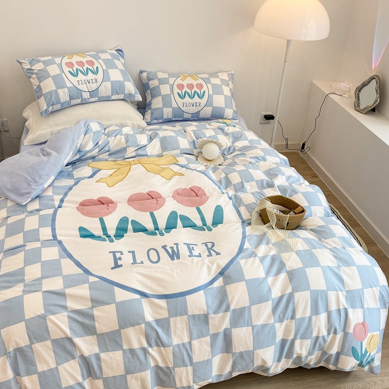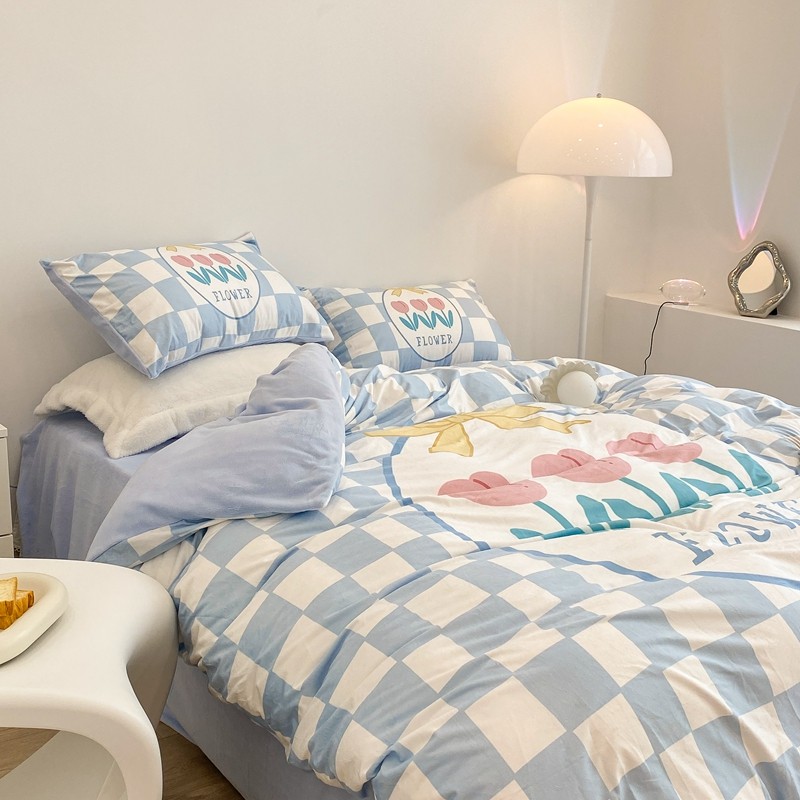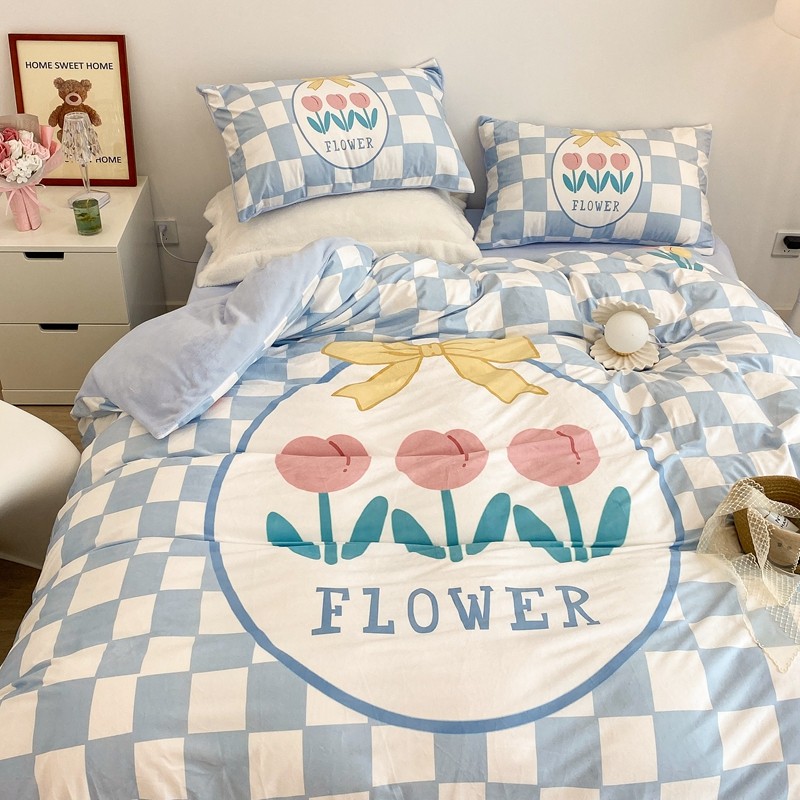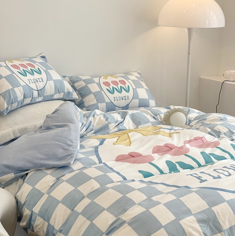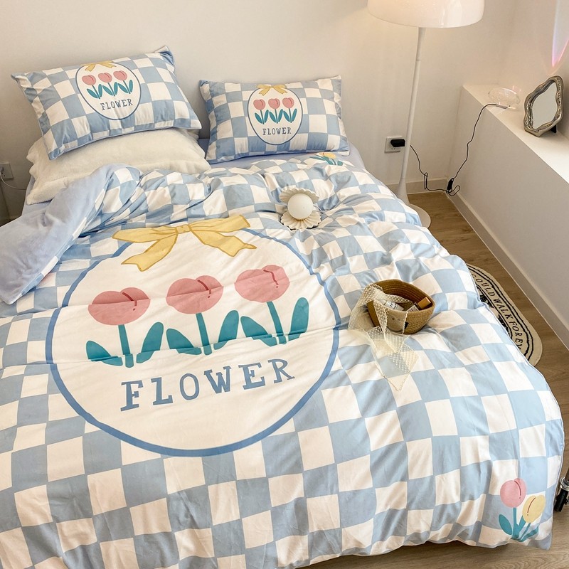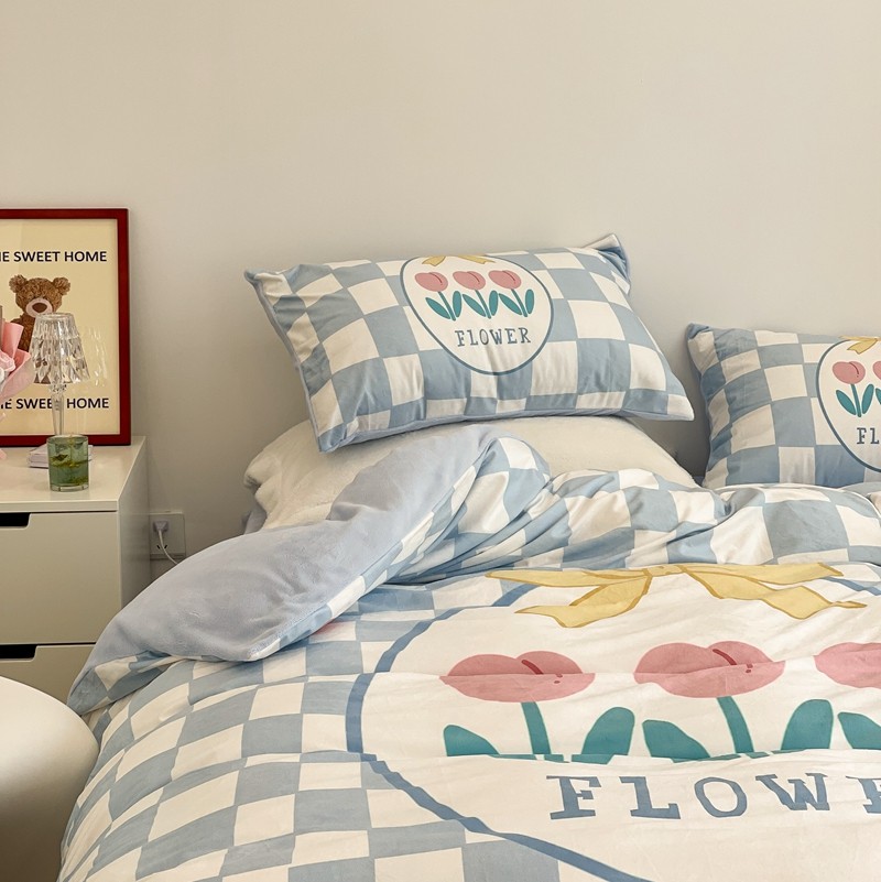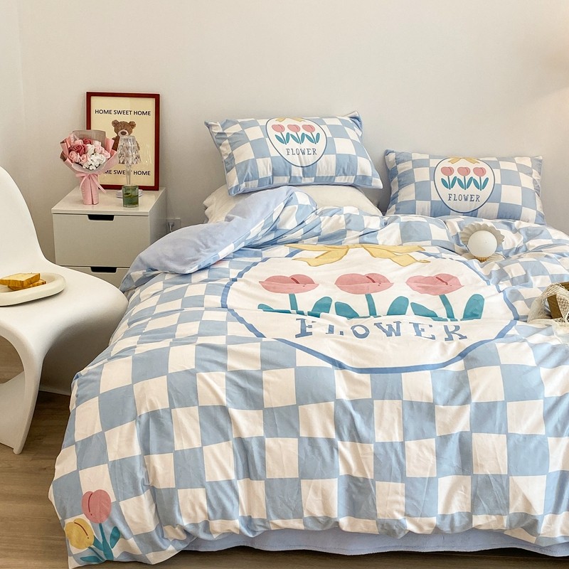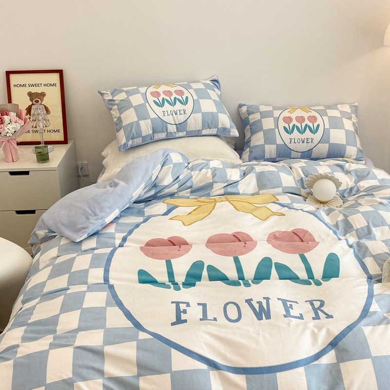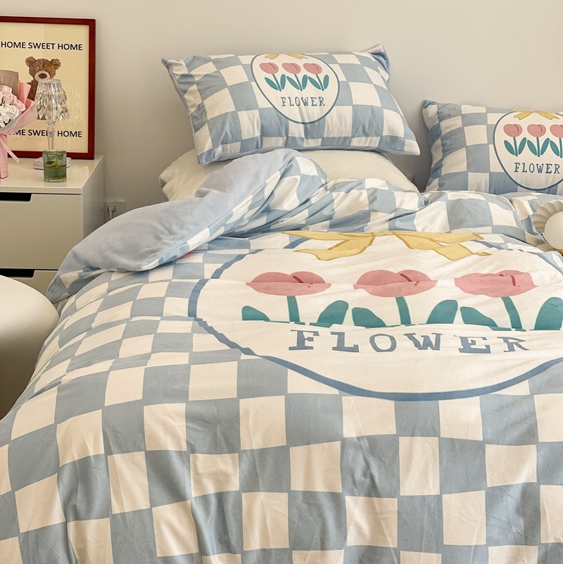 昔可家纺 2021新款大版宝宝牛奶绒四件套 棋盘格花花