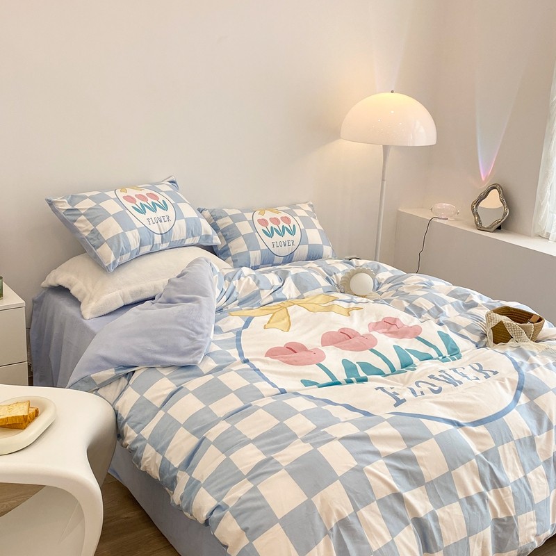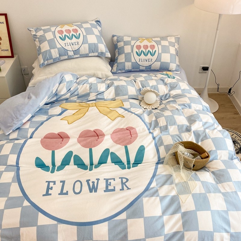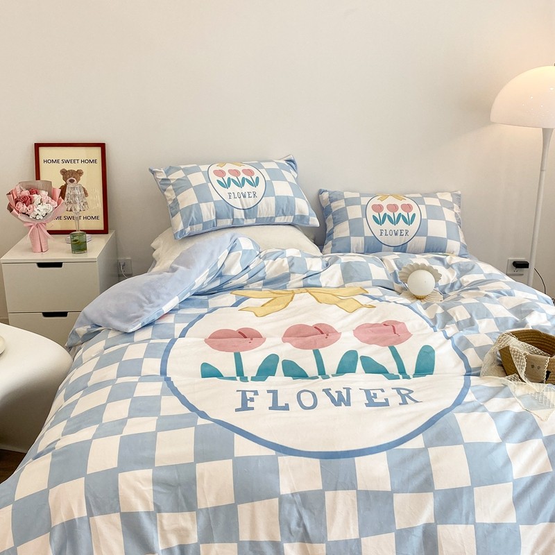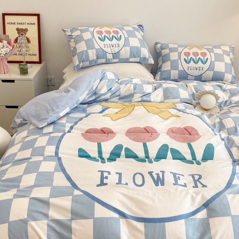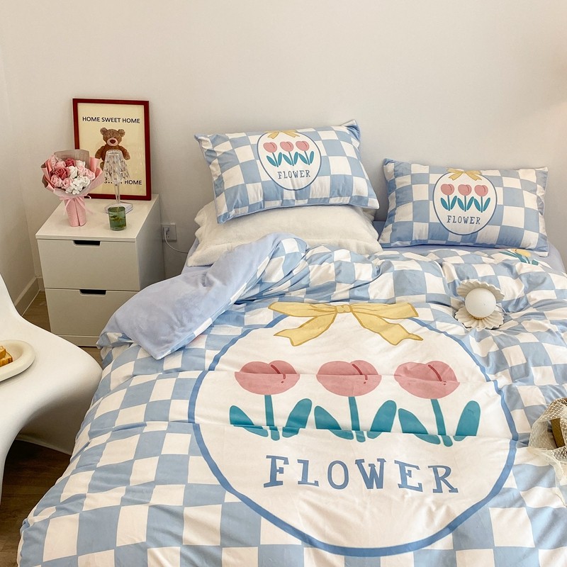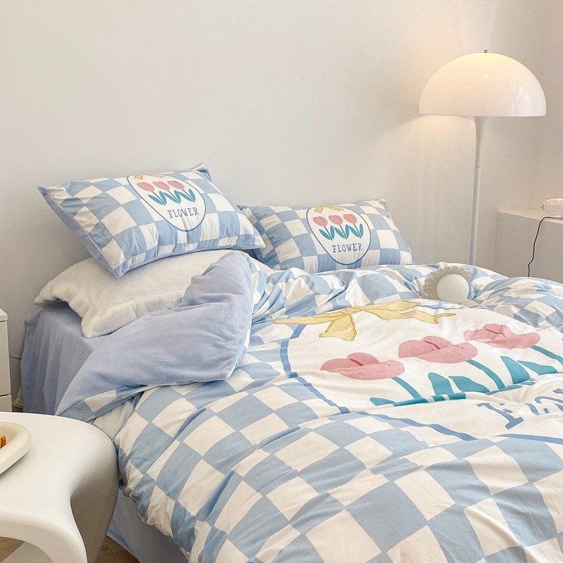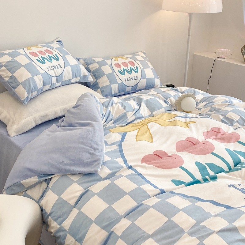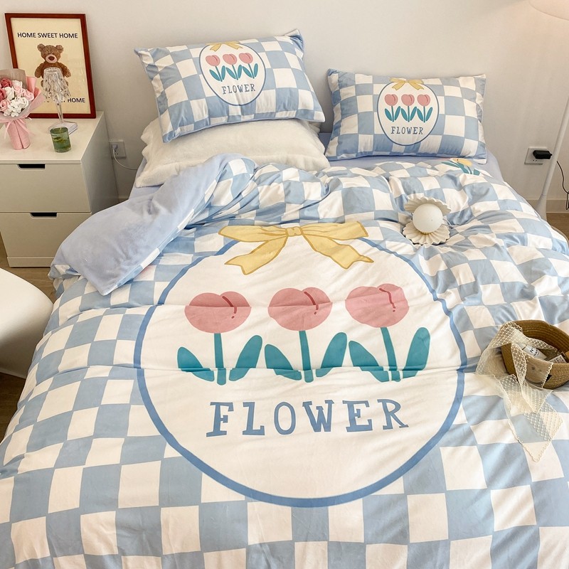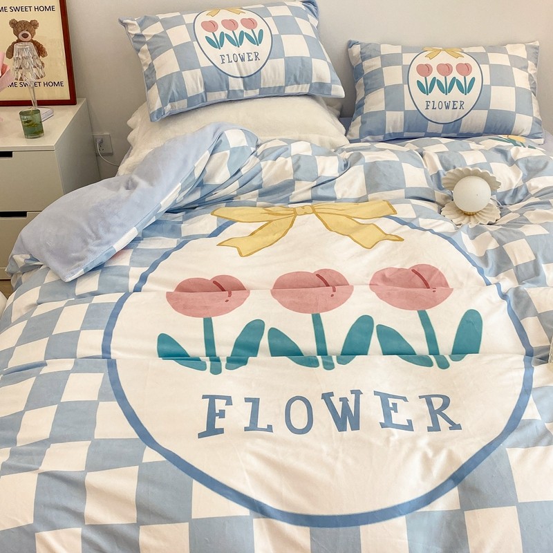 昔可家纺 2021新款大版宝宝牛奶绒四件套 棋盘格花花