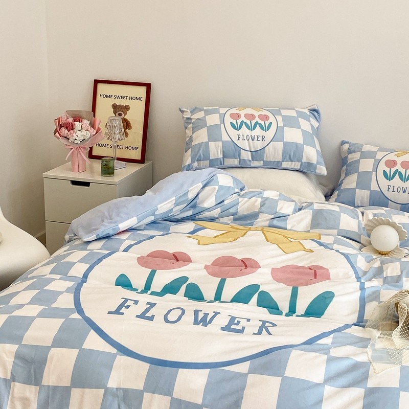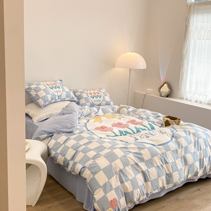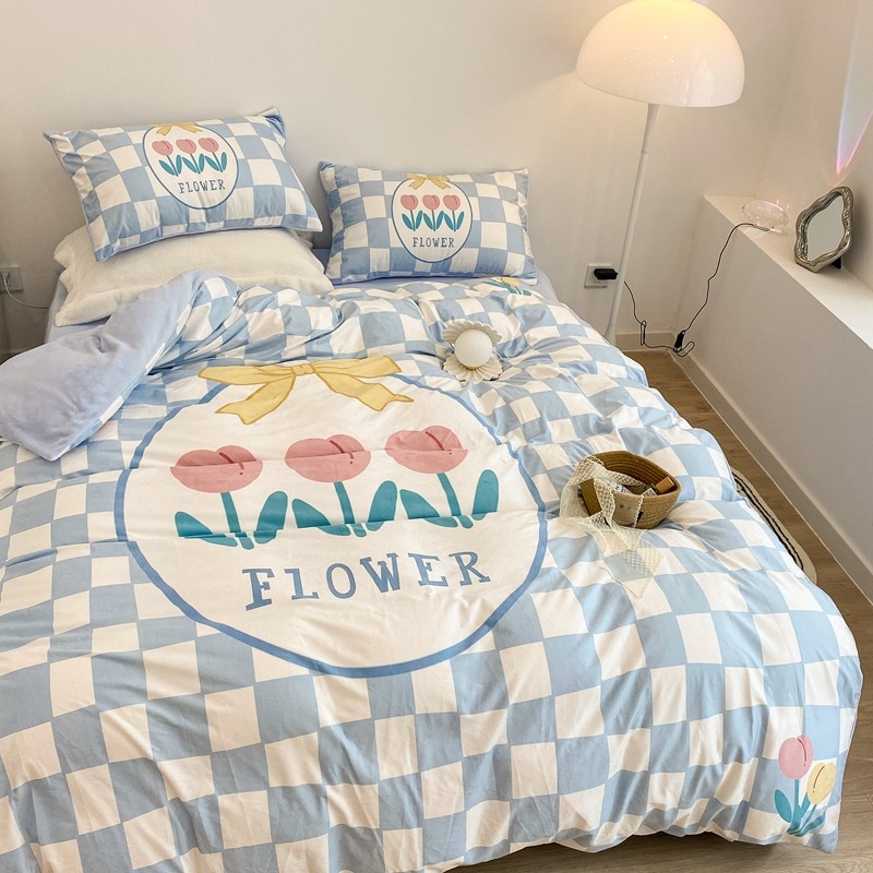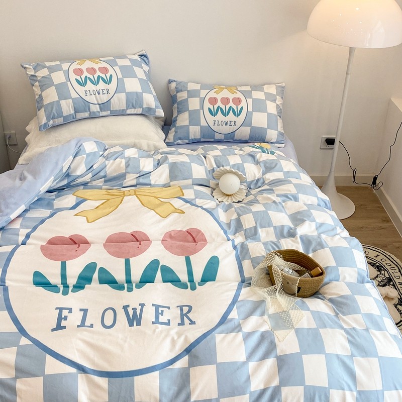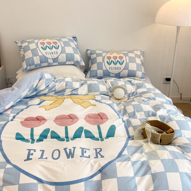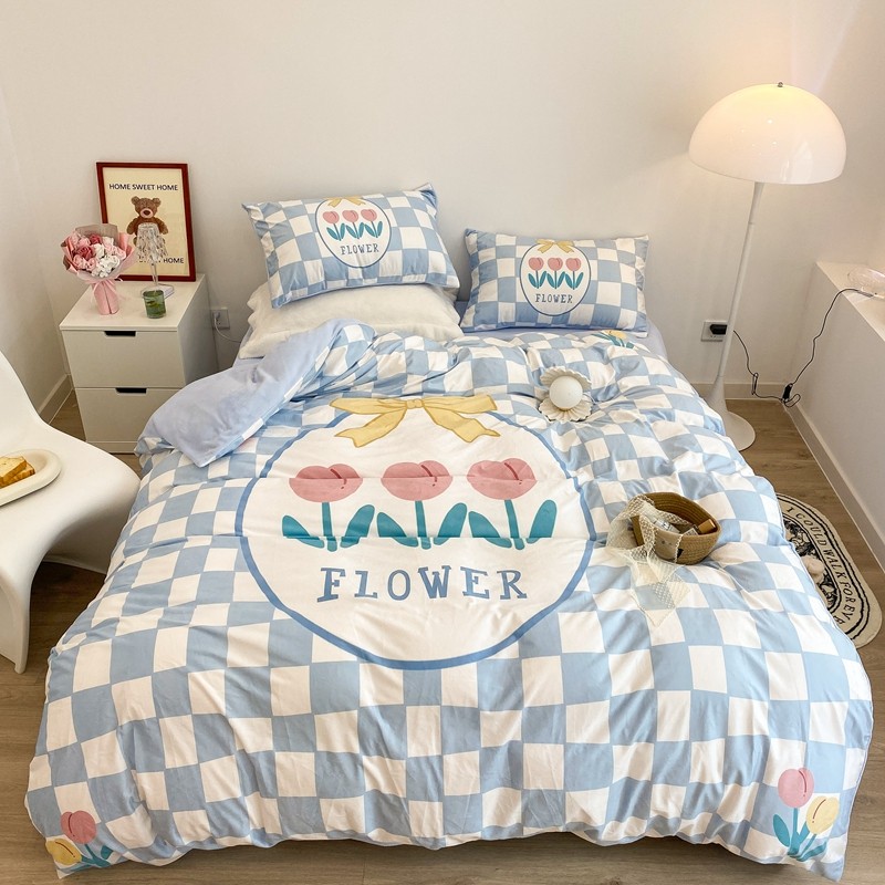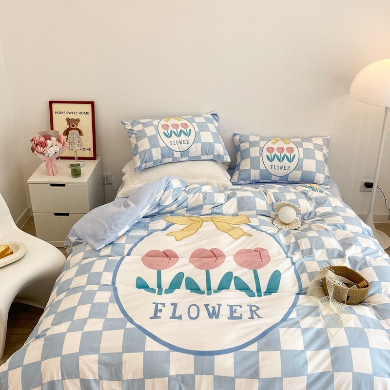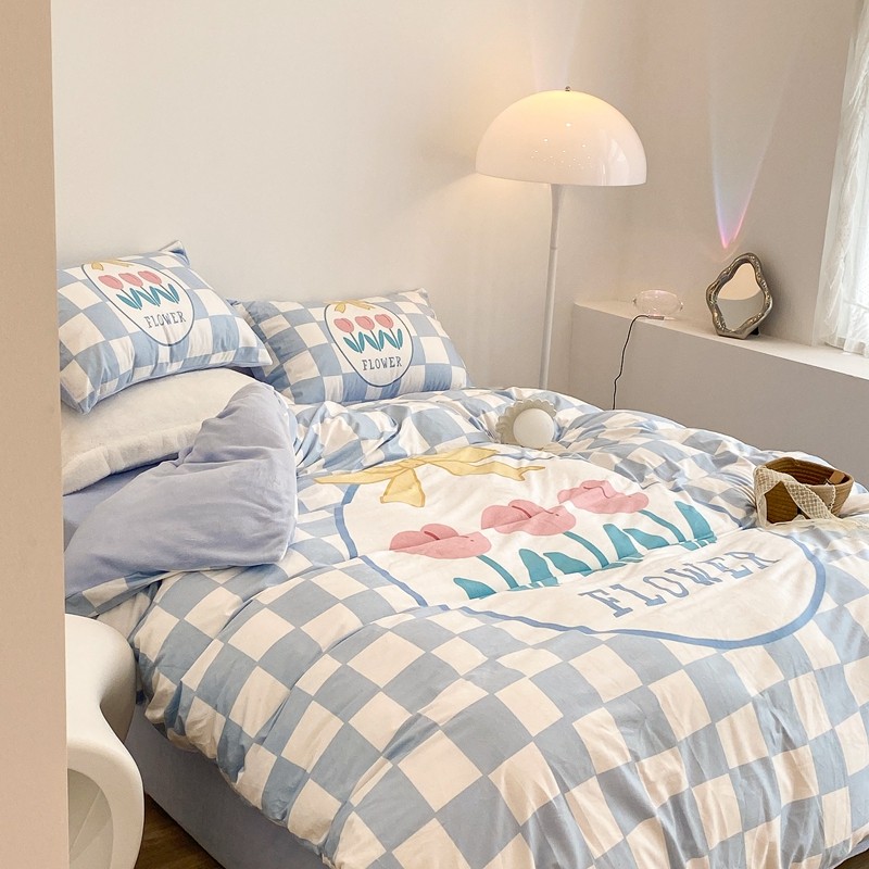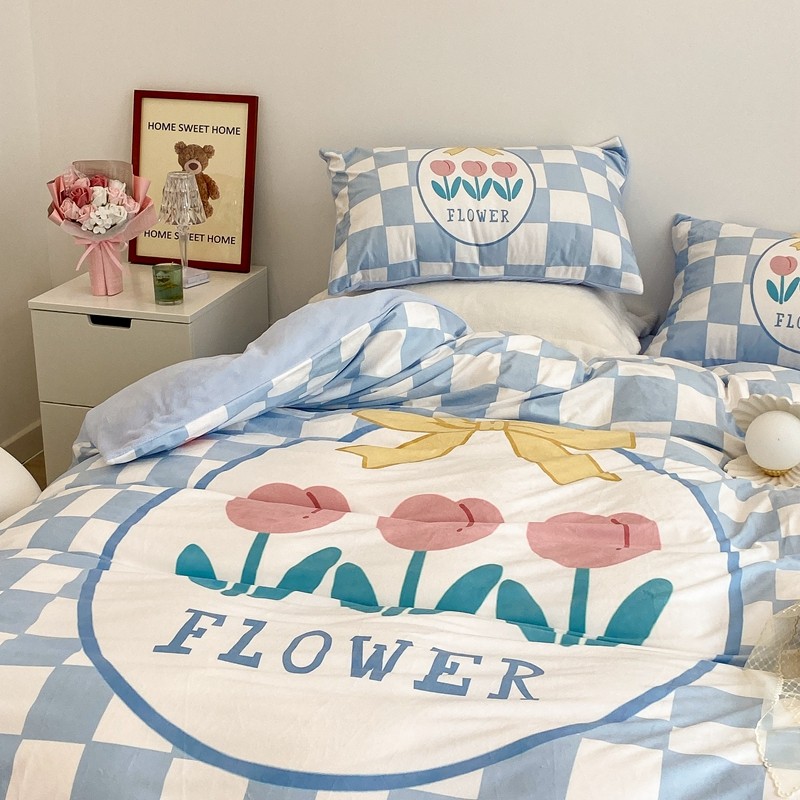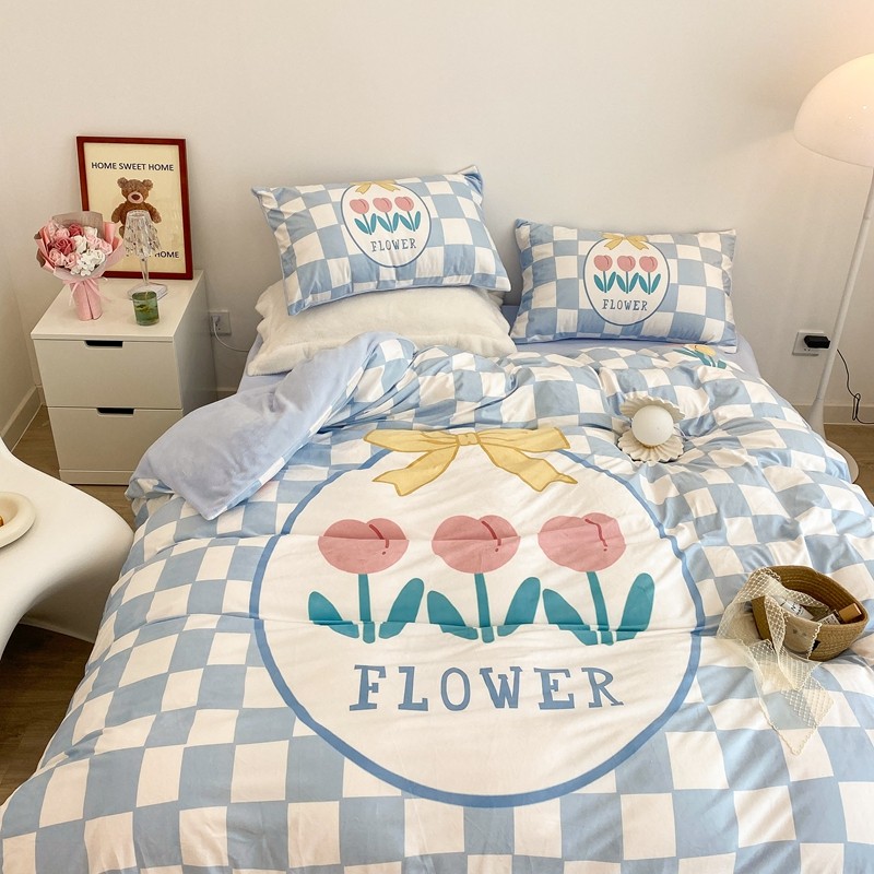 昔可家纺 2021新款大版宝宝牛奶绒四件套 棋盘格花花