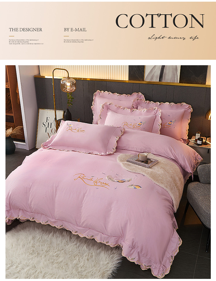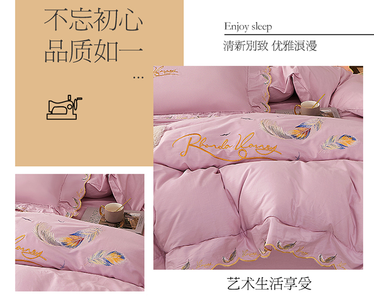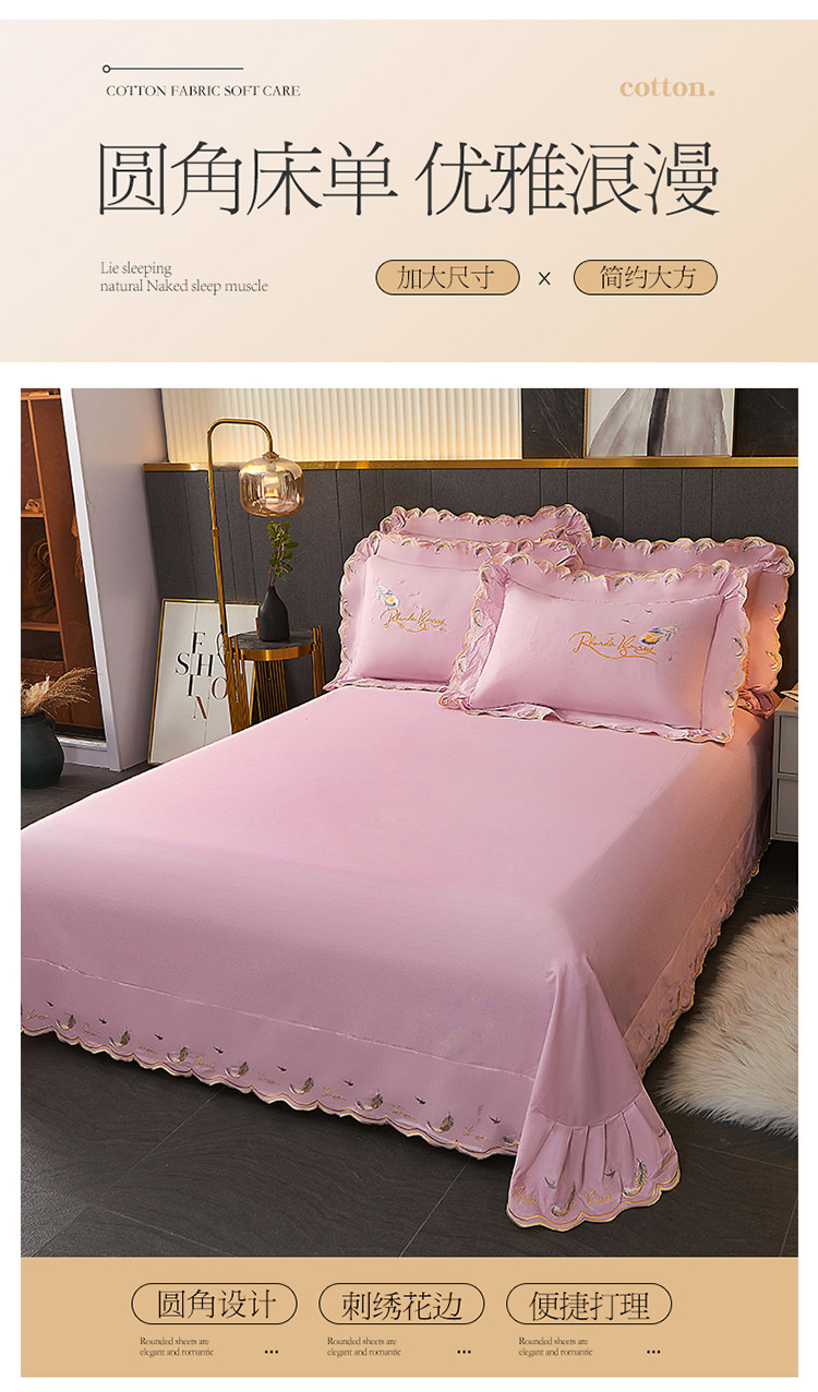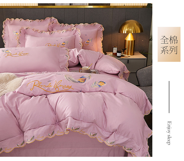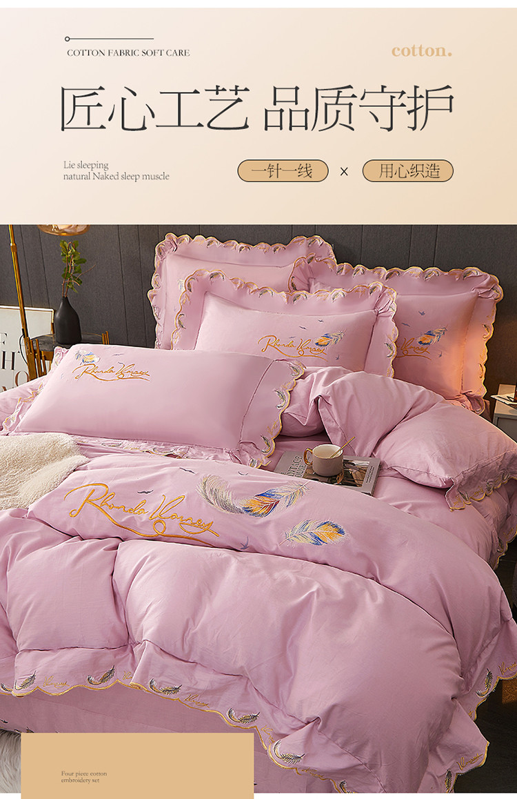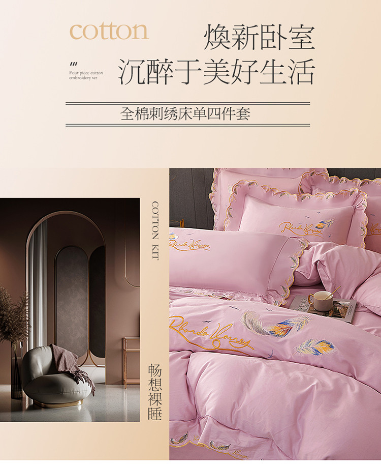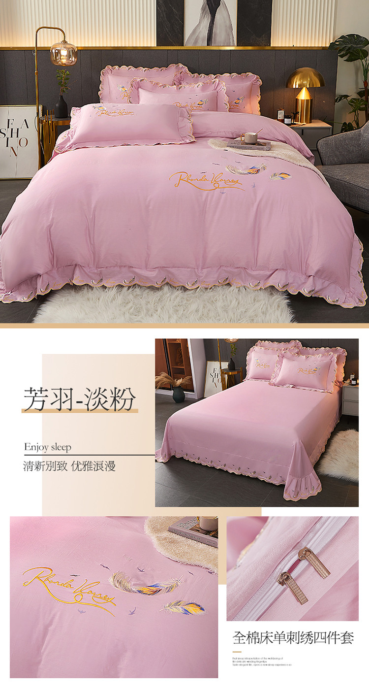 宜凡 2022新款全棉刺绣床单款四件套 芳羽-淡粉