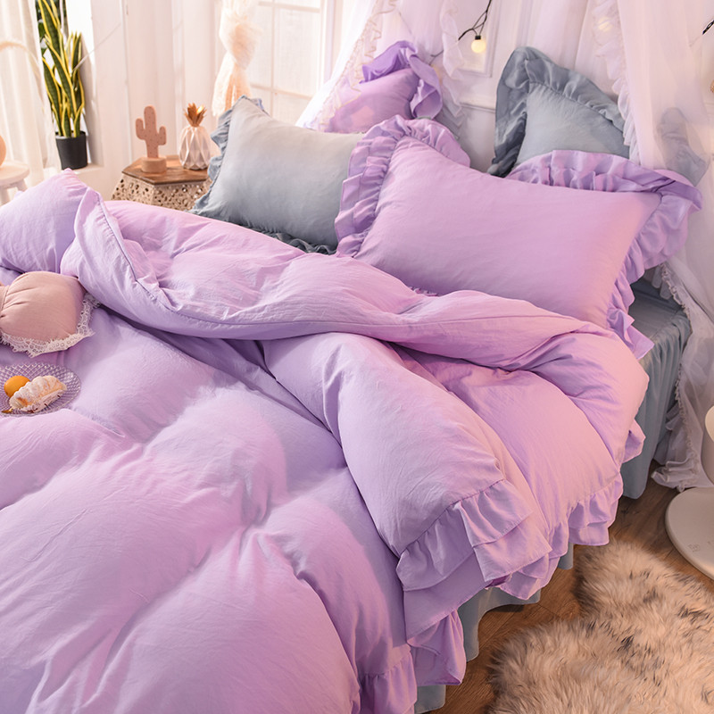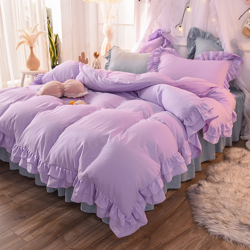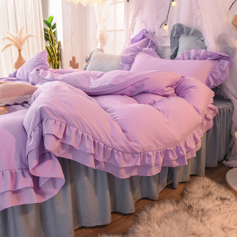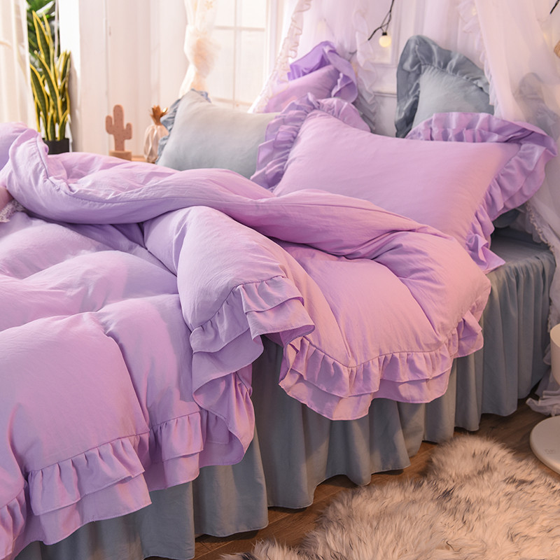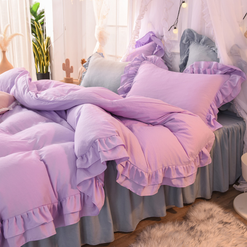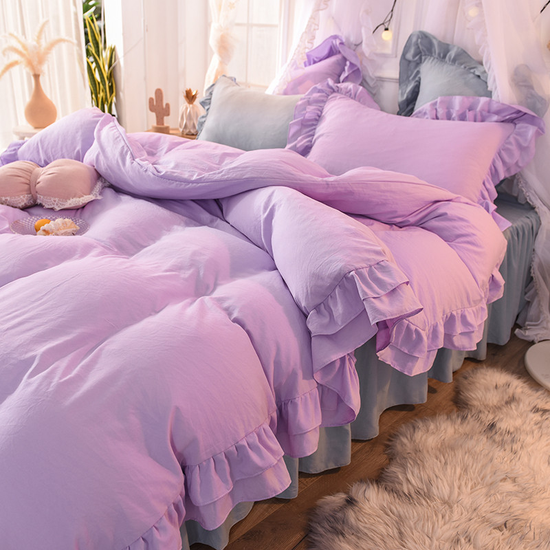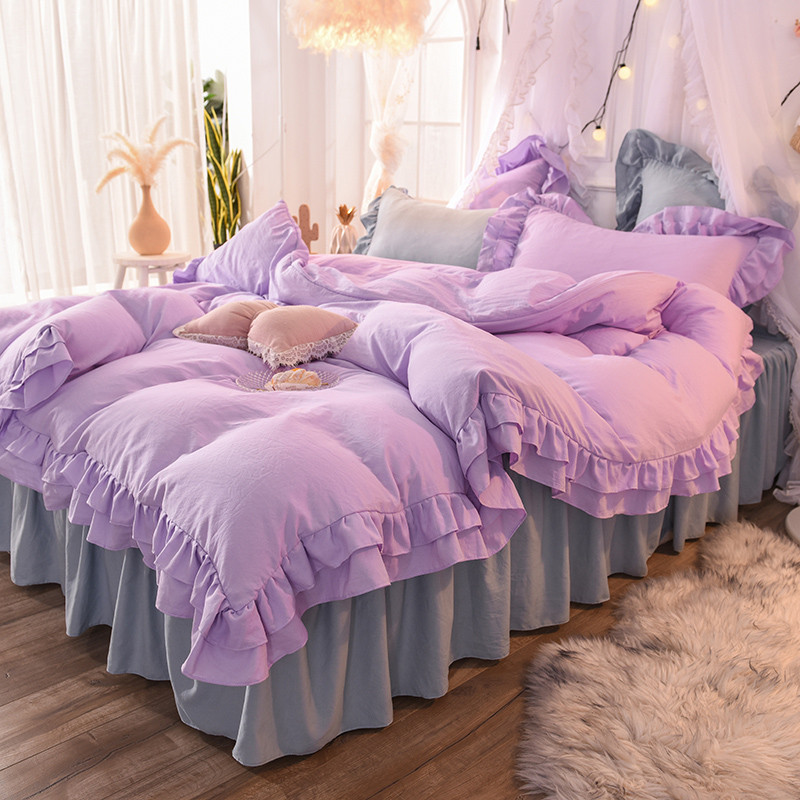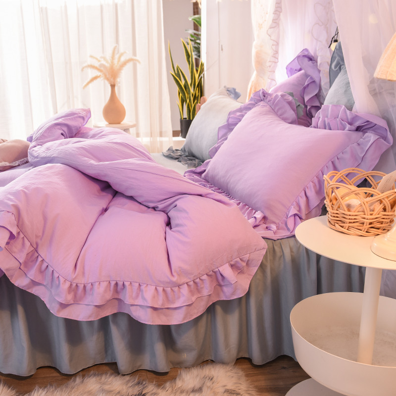 当前位置: 91家纺网 > 商品网购 > 床品套件 > 四件套 > 水洗棉四件套 > 2023新款韩式公主风水洗棉双层荷叶边花影系列四件套 紫+灰