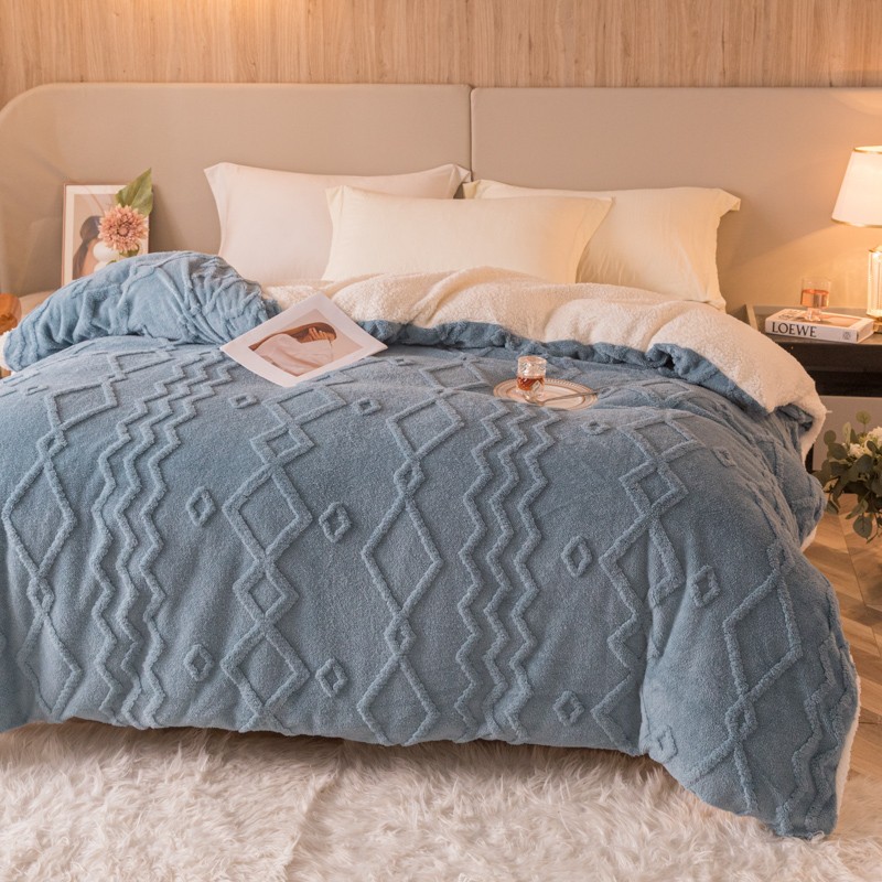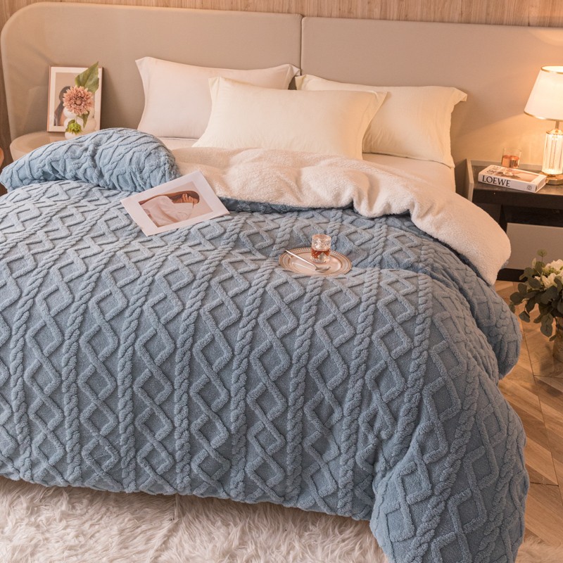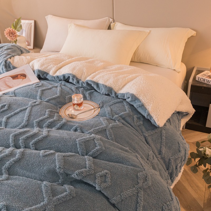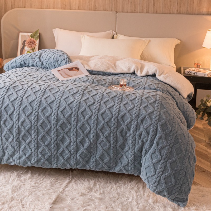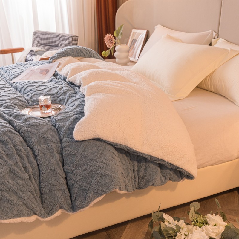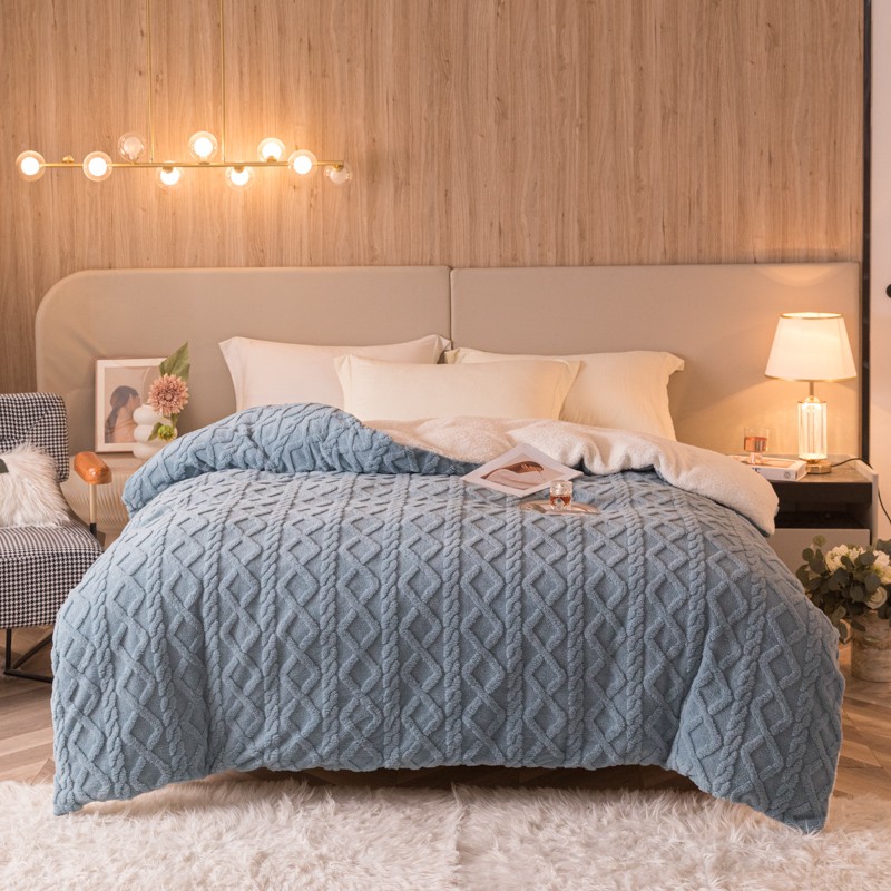 商品名称:简爱-2025舒棉绒羊羔绒单被套多功能毯 纹路菱形格-暮色蓝