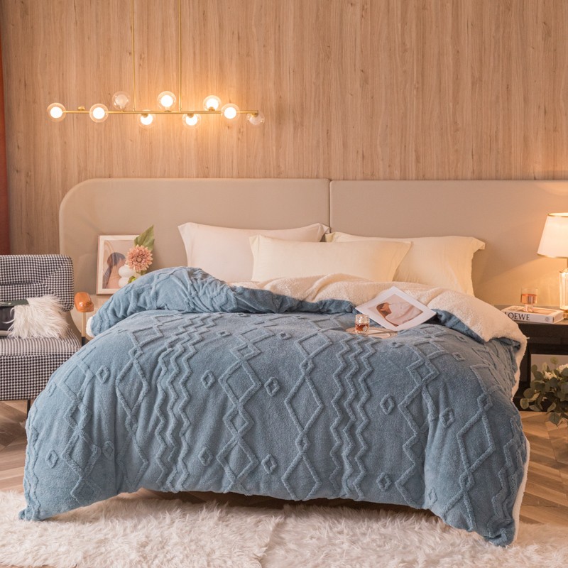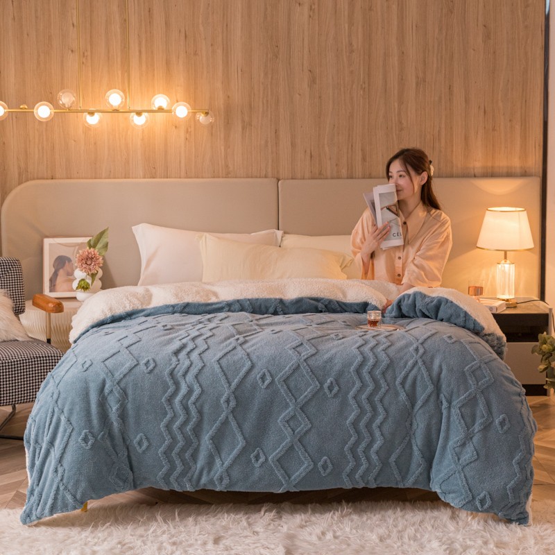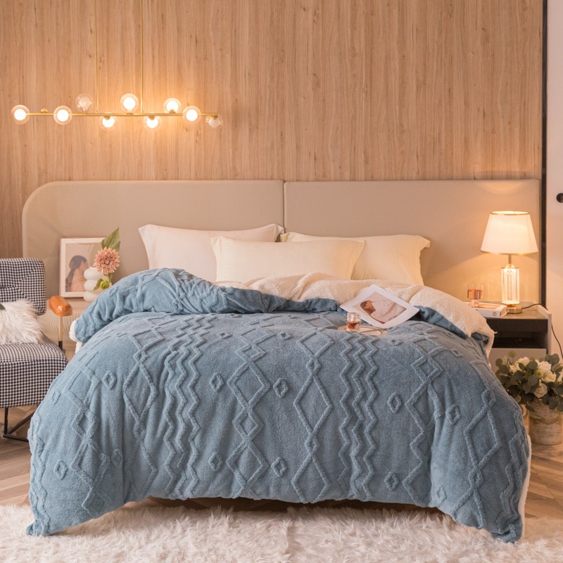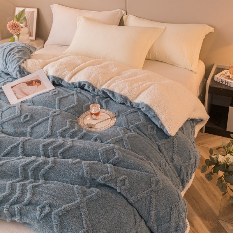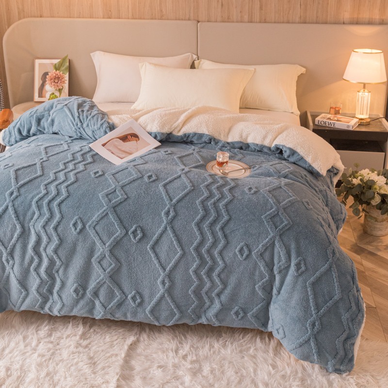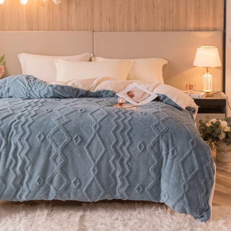 商品名称:简爱-2025舒棉绒羊羔绒单被套多功能毯 纹路菱形格-暮色蓝
