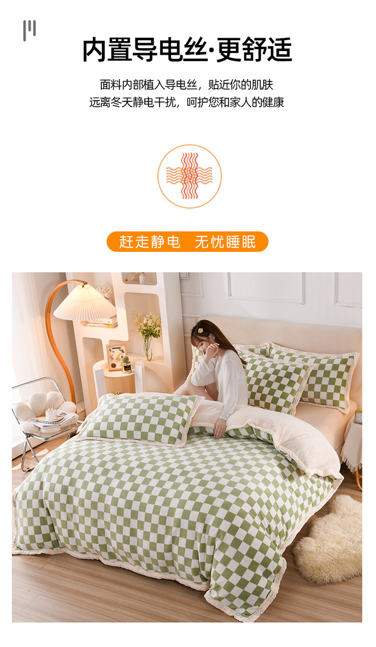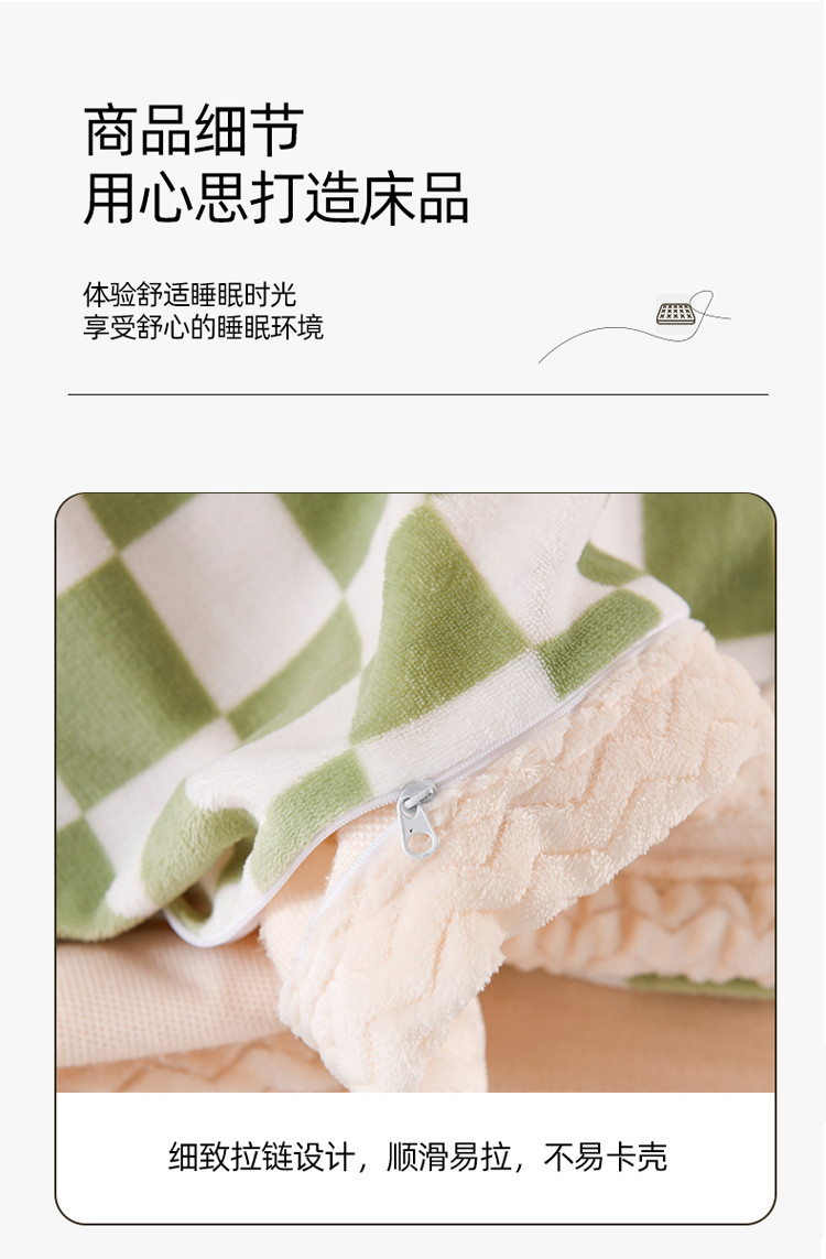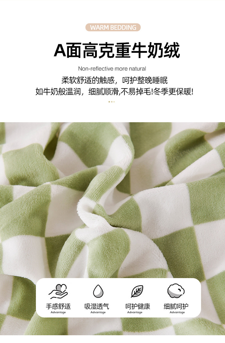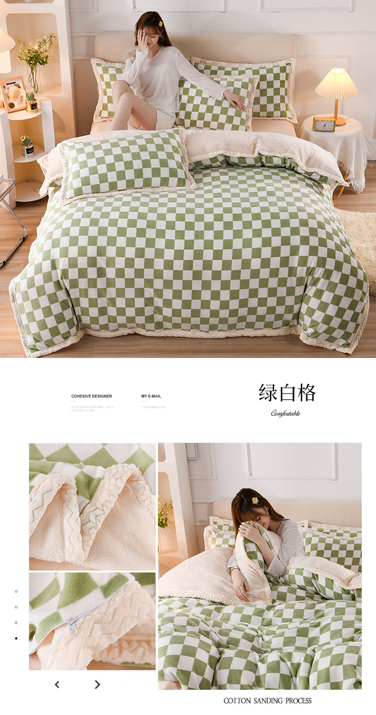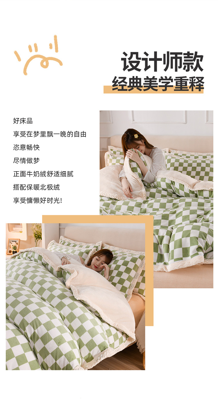 当前位置: 91家纺网 > 商品网购 > 床品套件 > 四件套 > 牛奶绒四件套 > 迷仙巢 2022新款牛奶绒拼北极绒贝贝绒包边四件套 绿白格