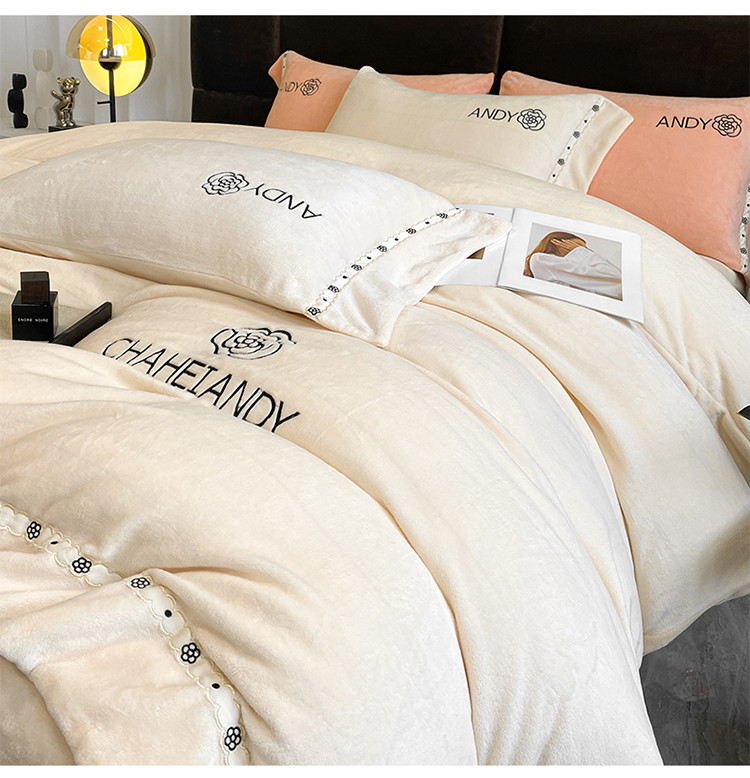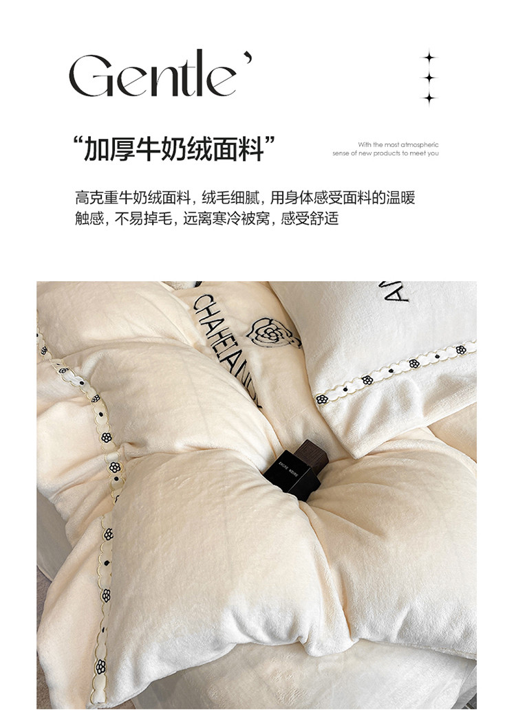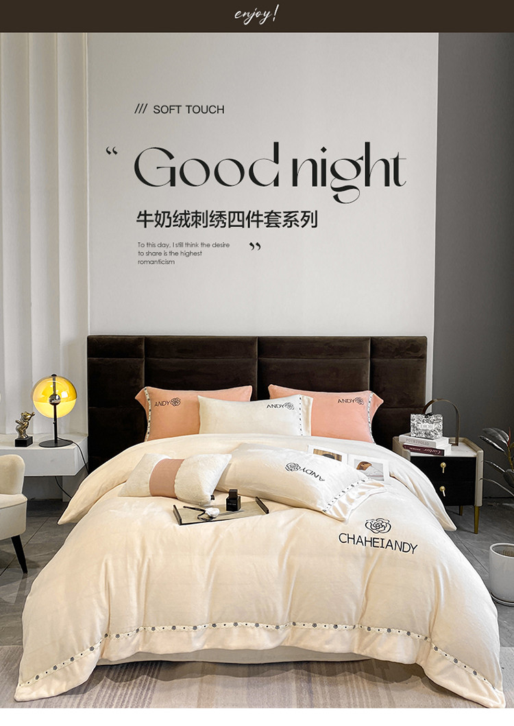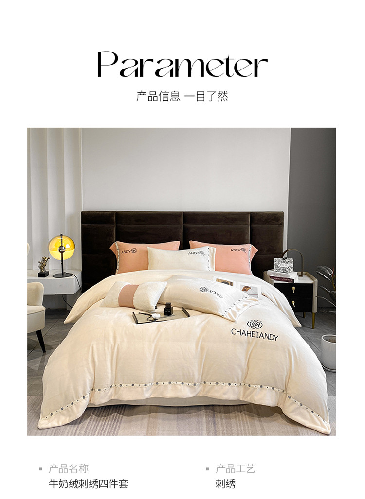 商品名称:米彩2023年高克重纯色牛奶绒刺绣四件套安迪系列 米月白