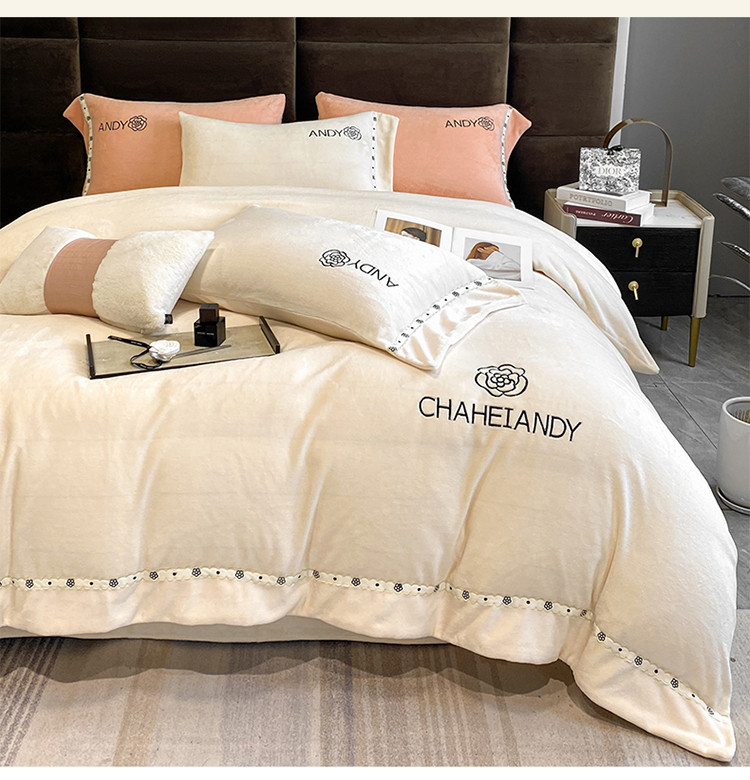 米彩2023年高克重纯色牛奶绒刺绣四件套安迪系列 米月白