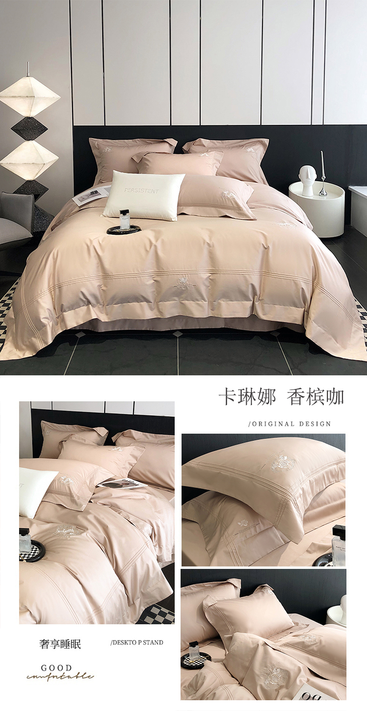 (总)诗黛尔 2025秋冬新款长绒棉刺绣香缇卡系列四件套,卡其色,落樱粉,南瓜橘,绅士灰,水晶兰,油果绿