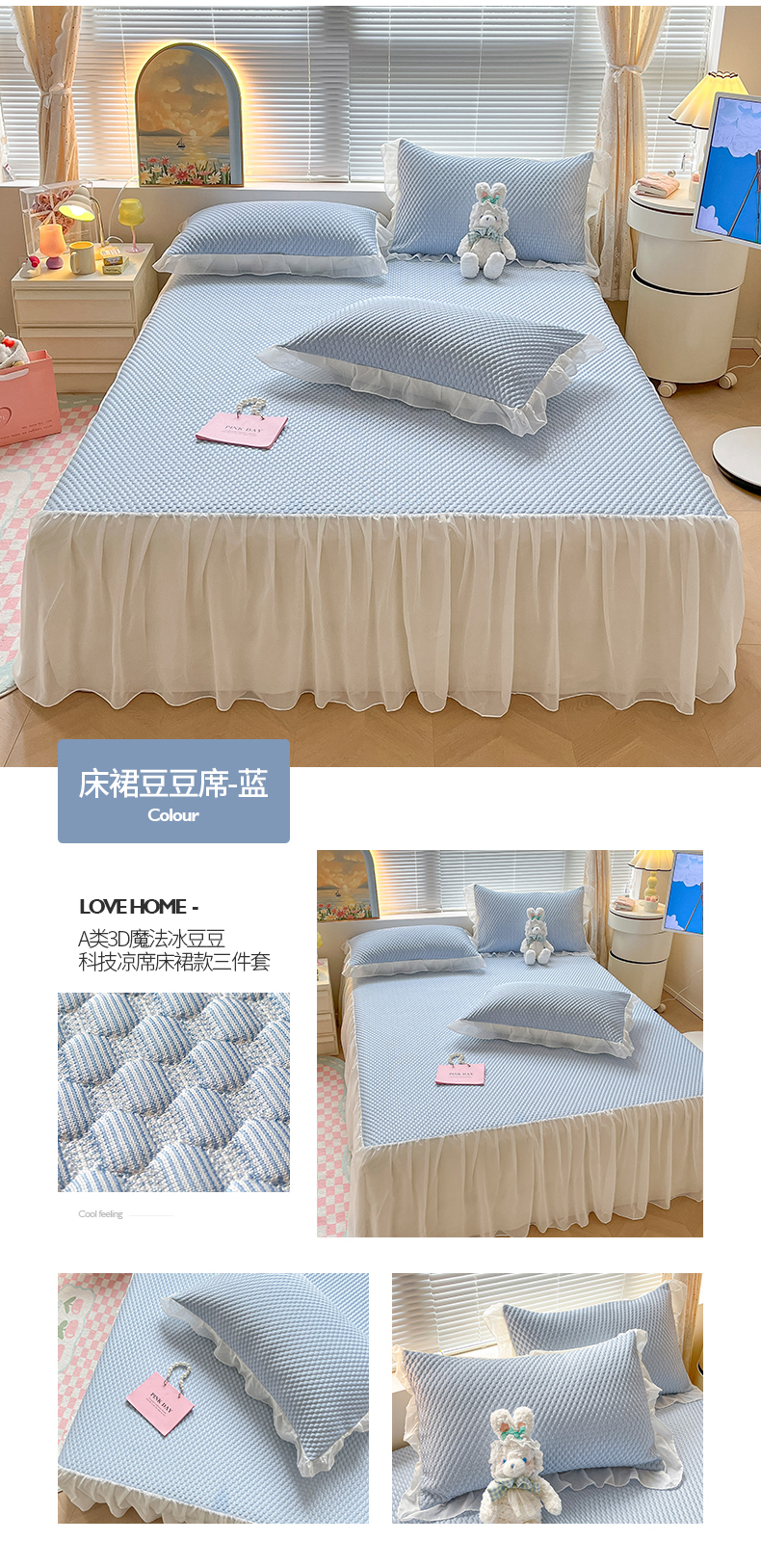 商品名称:2024新款A类3D魔法冰豆豆科技凉席床裙款三件套系列 床裙豆豆席-蓝