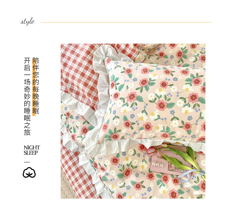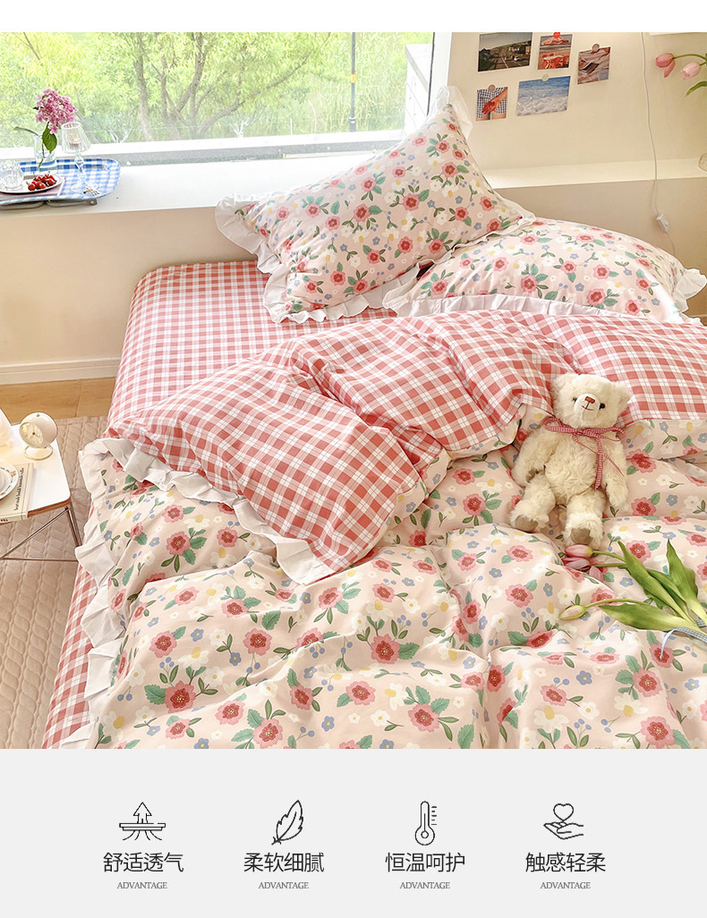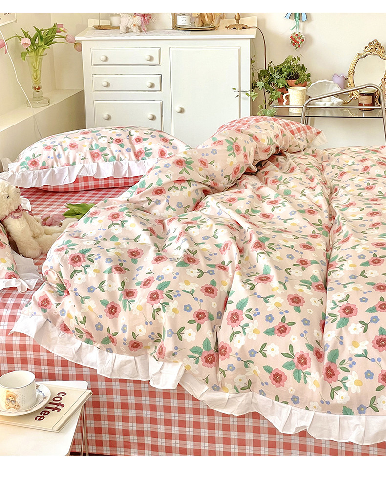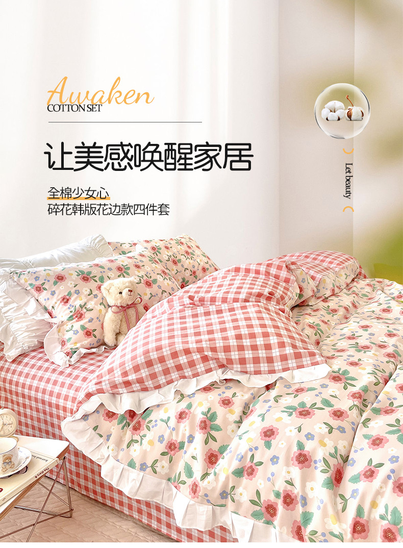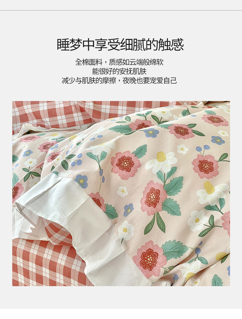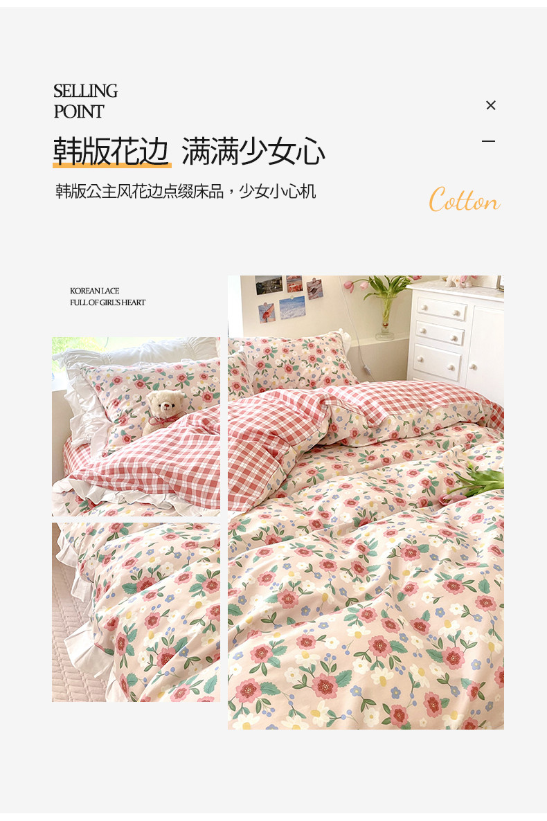 商品名称:桃子 2023新款仙气奶油碎花少女心韩版花边纯棉四件套 花边-恬淡花间