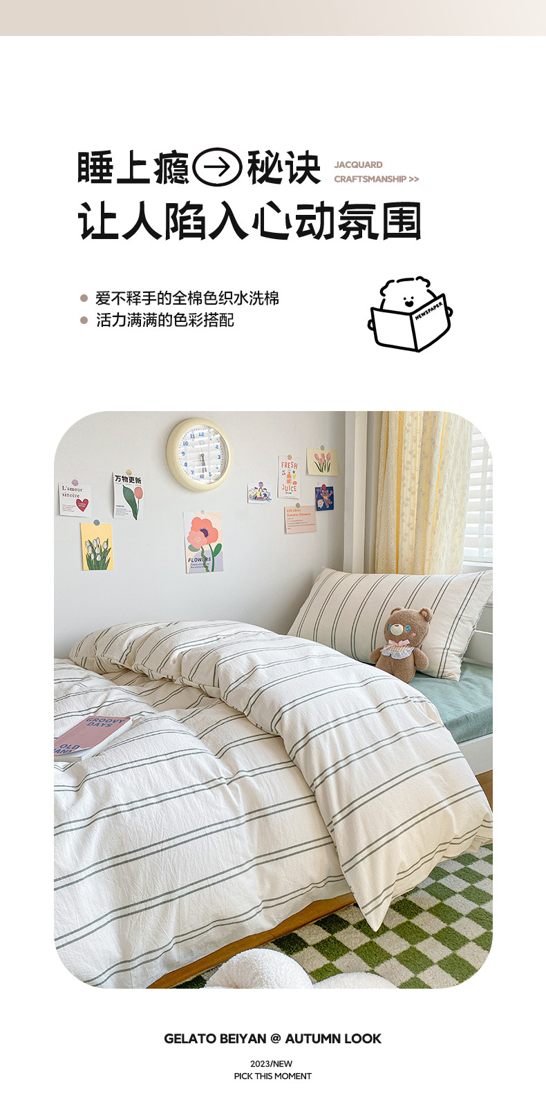 莱茵家居 2024新款色织全棉水洗棉学生床三件套 冬小青